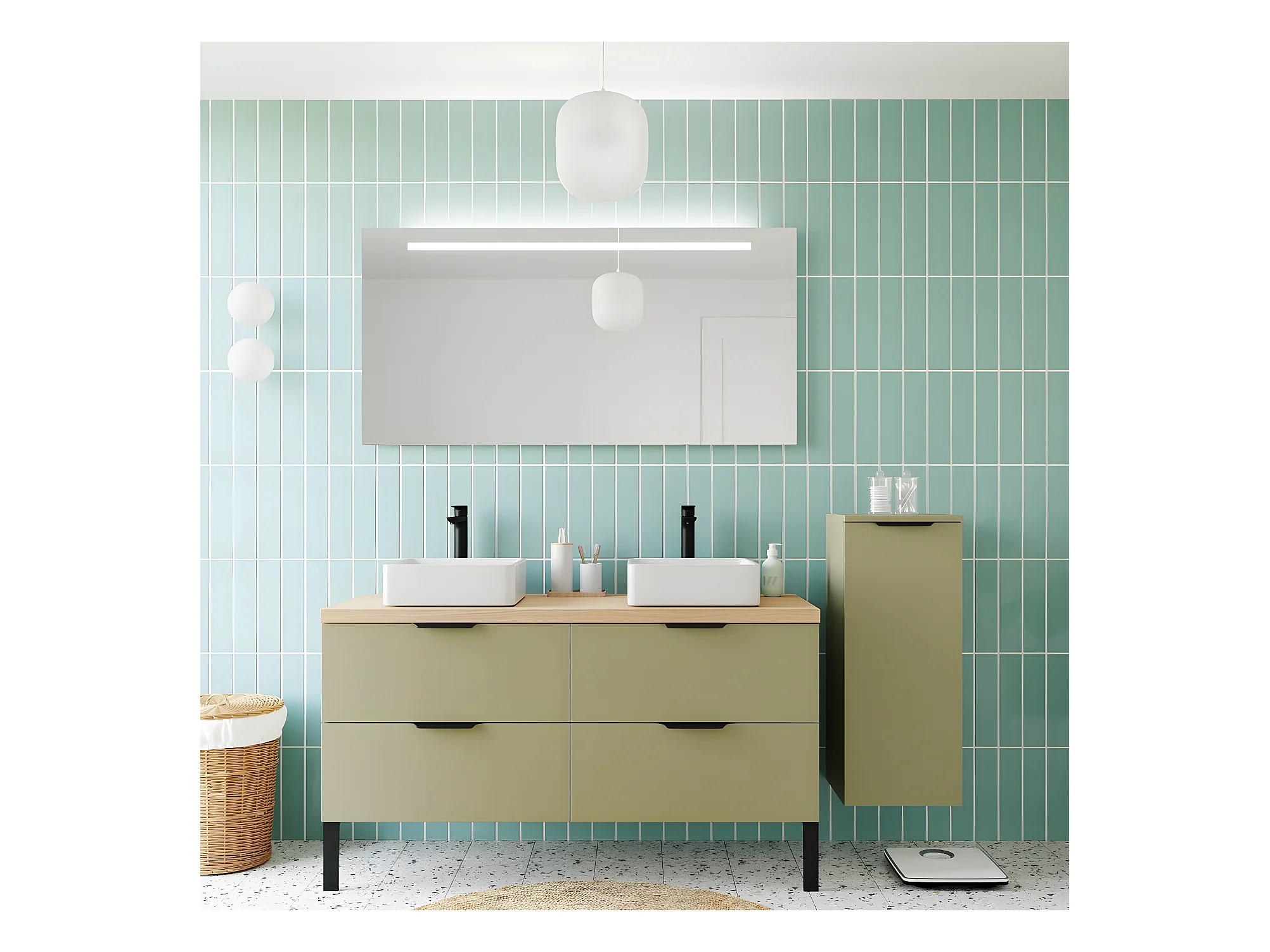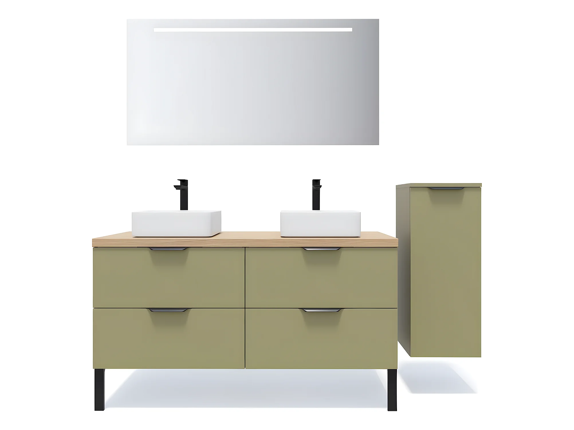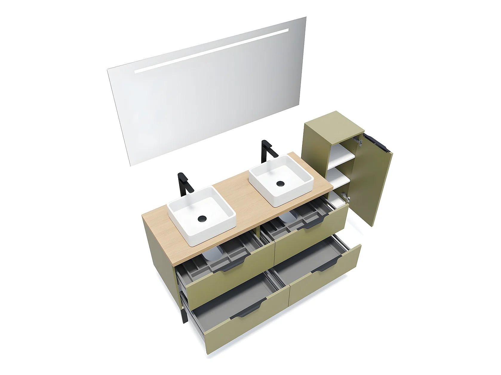 Meuble de salle de bain suspendu 2 vasques à poser 140cm 4 tiroirs Vert olive + miroir + colonne ouverture droite - Soho