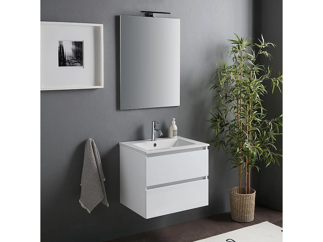 Meuble De Salle De Bain Suspendu Avec Lavabo 60Cm Et Tiroirs Blanc Brillant | Benaco