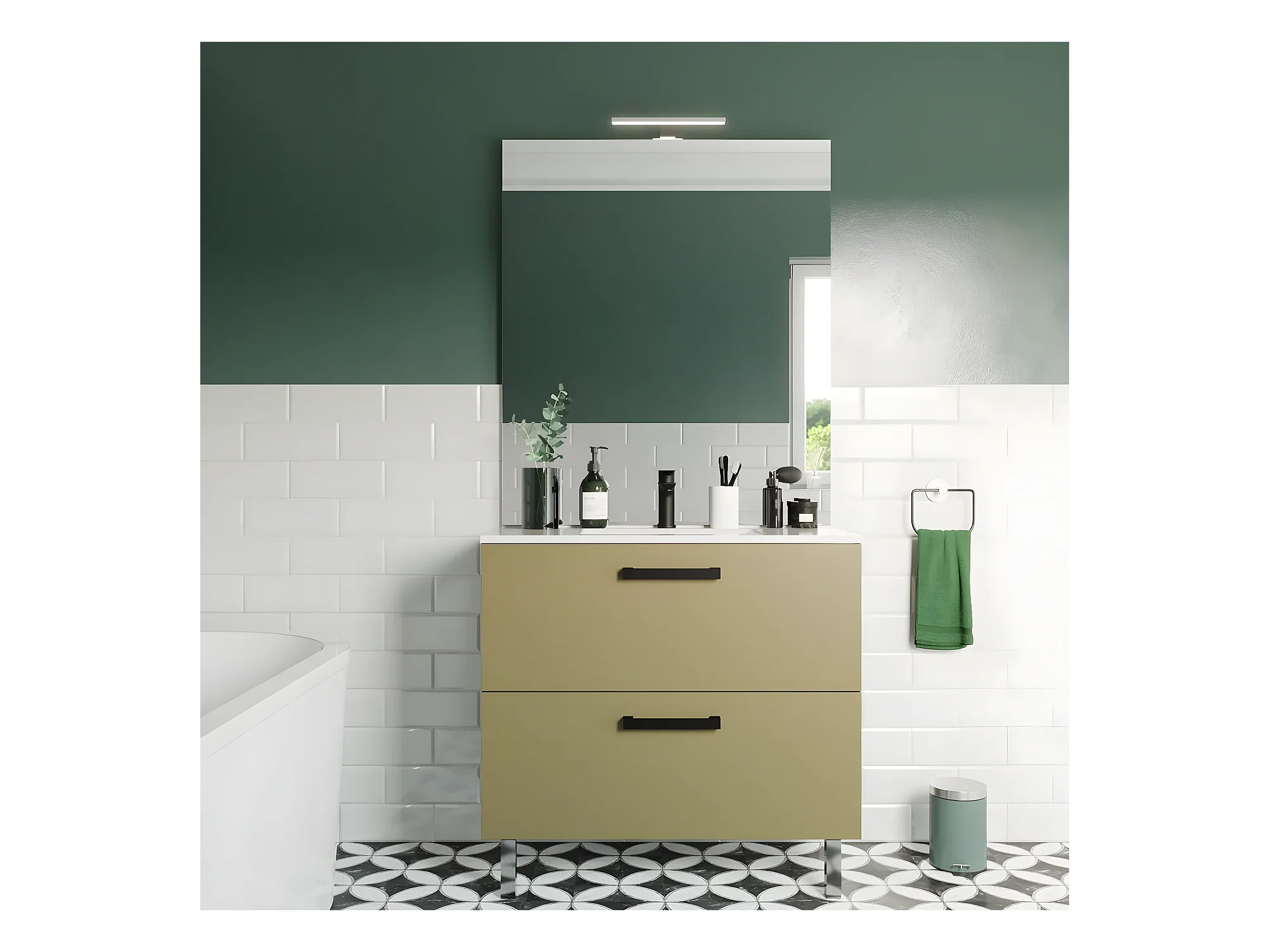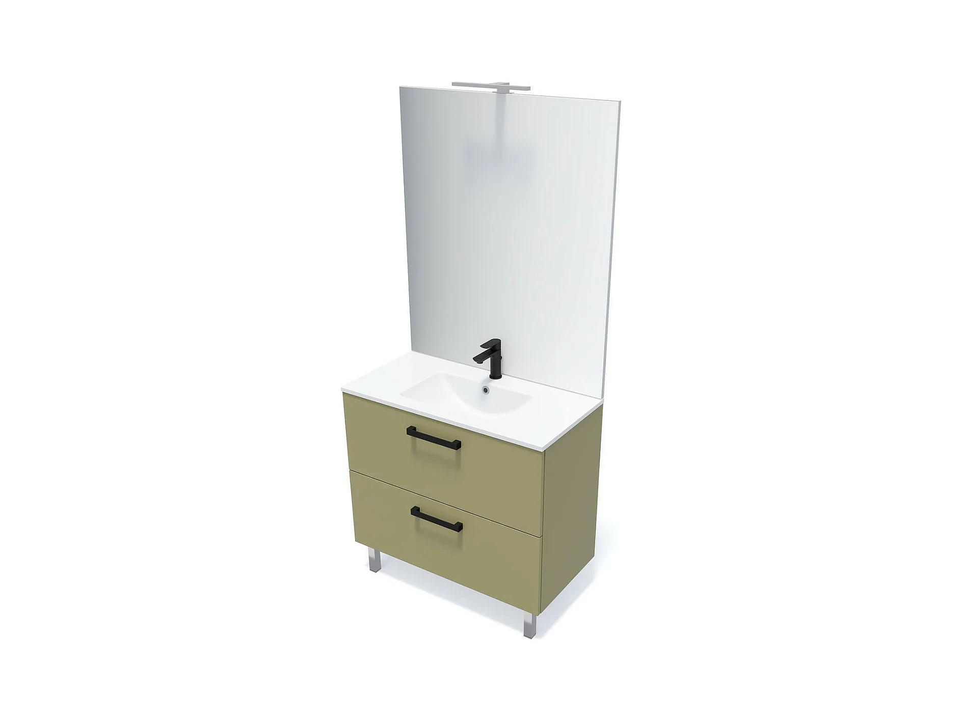 Meuble de salle de bain suspendu avec pieds vasque intégrée 90cm 2 tiroirs Vert olive + miroir - Chelsea