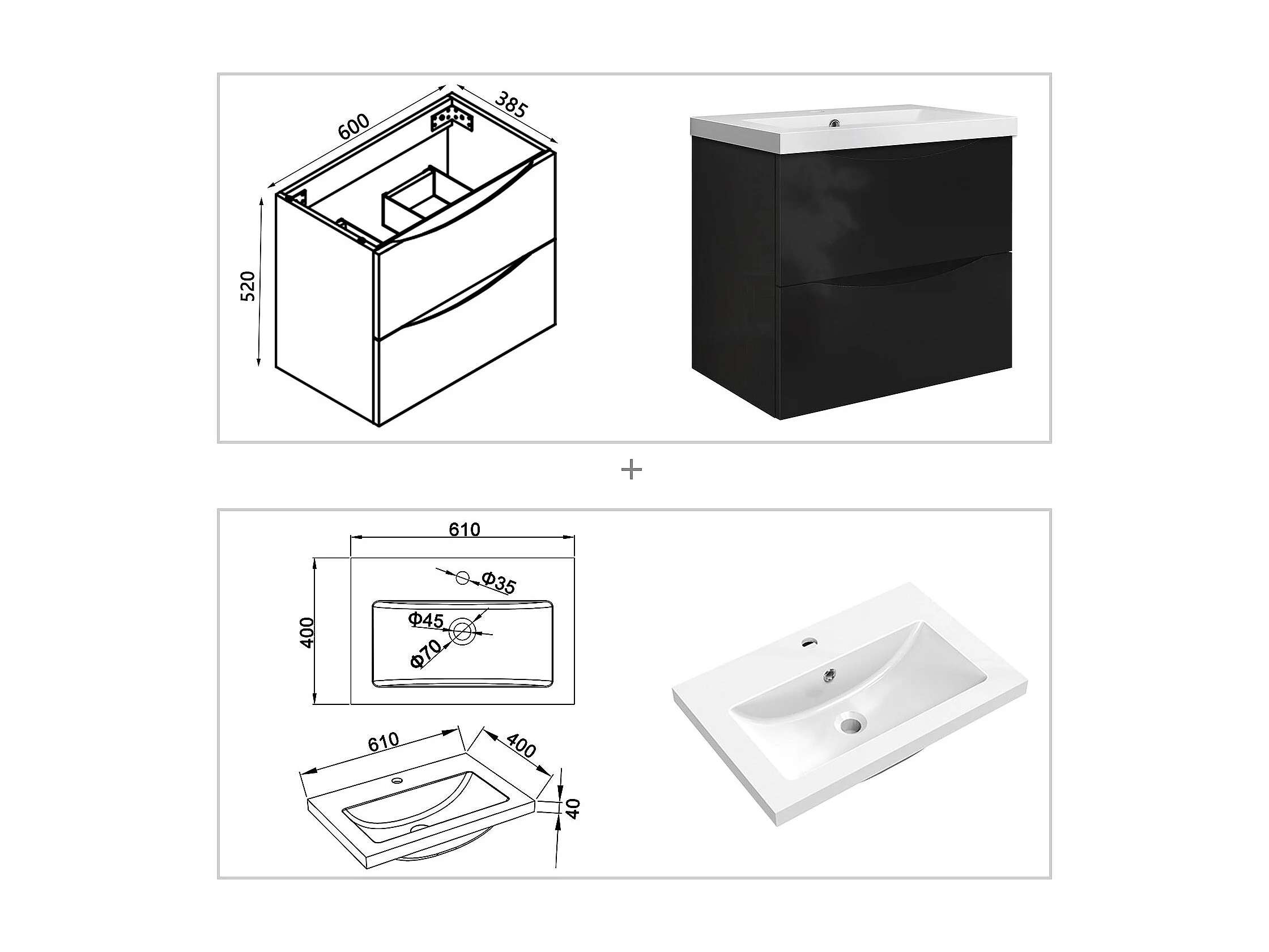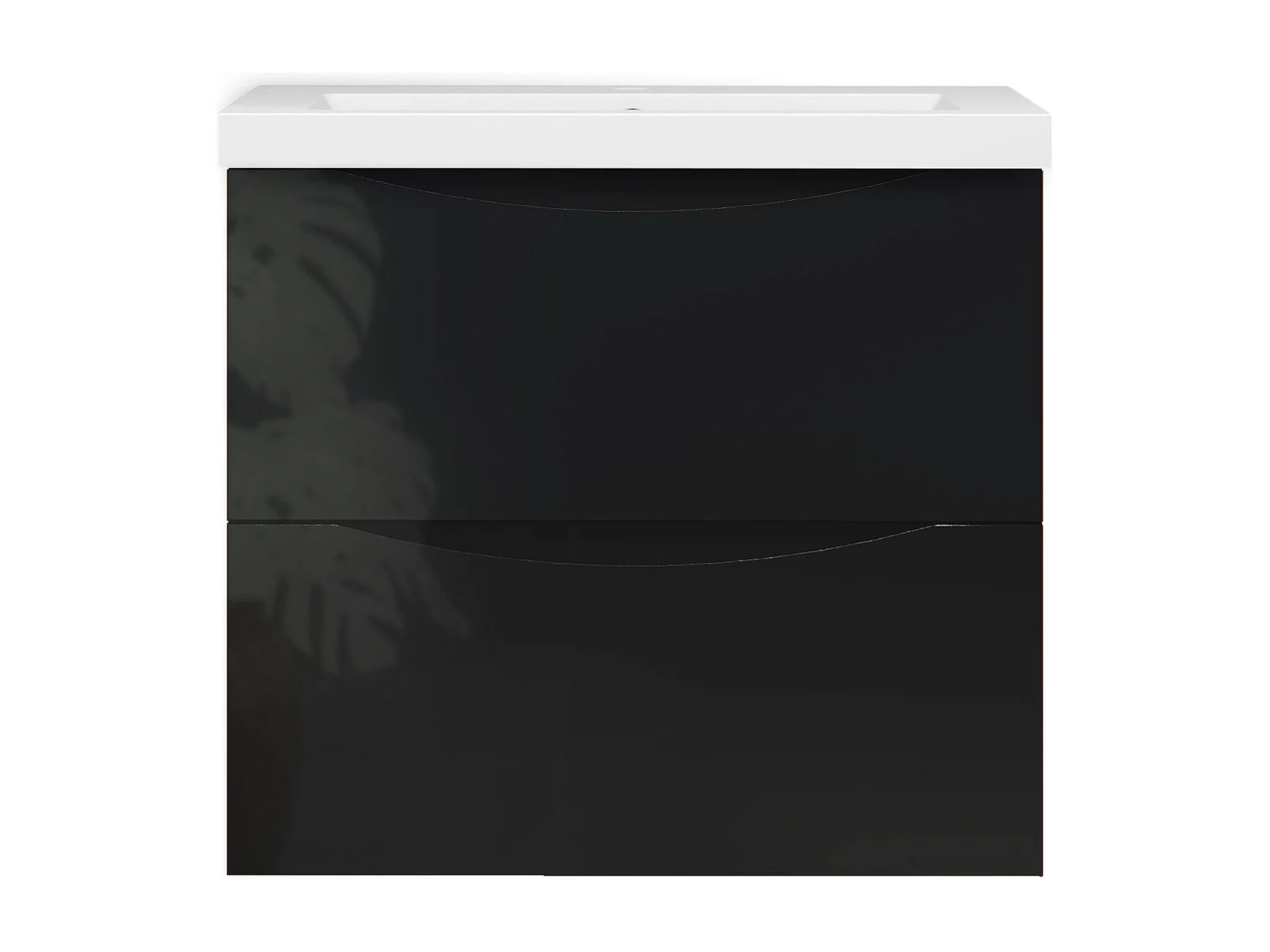 Meuble de salle de bain suspendu Brillant 60cm avec simple vasque + 2 tiroirs, Noir
