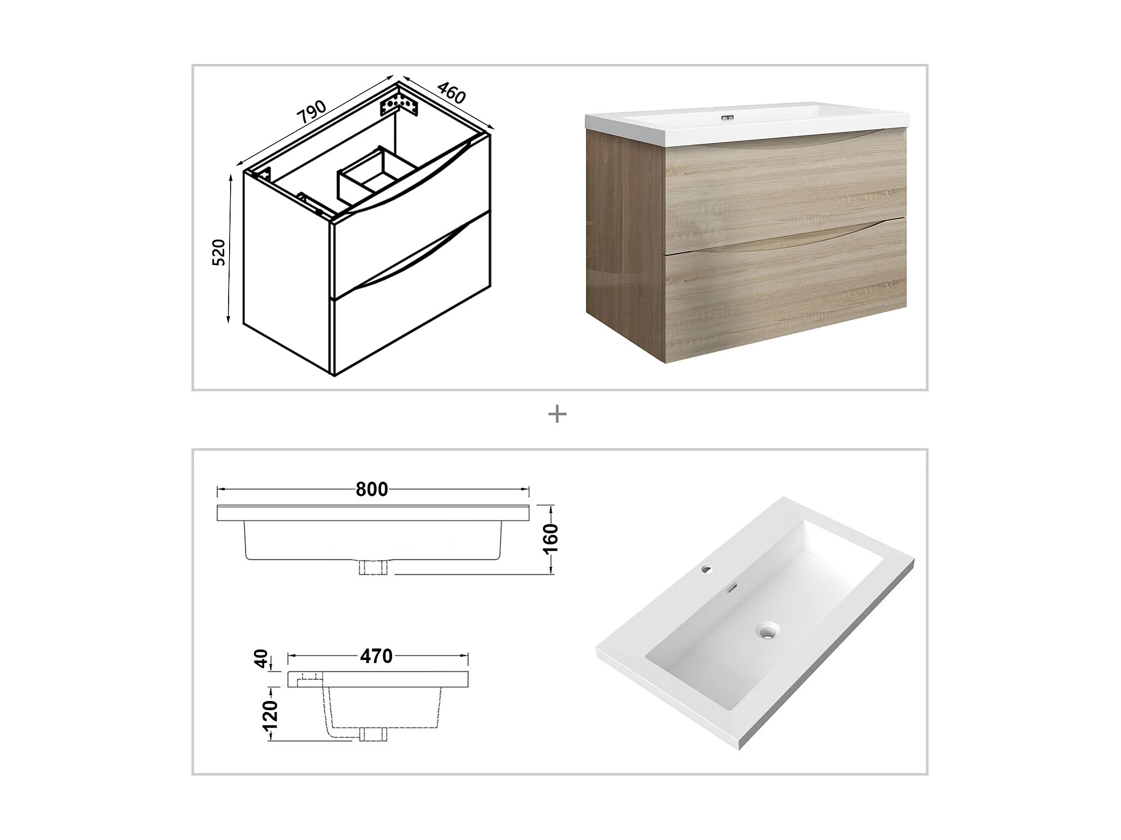 Meuble de salle de bain suspendu Brillant 80cm avec simple lavabo + 2 tiroirs, Chêne