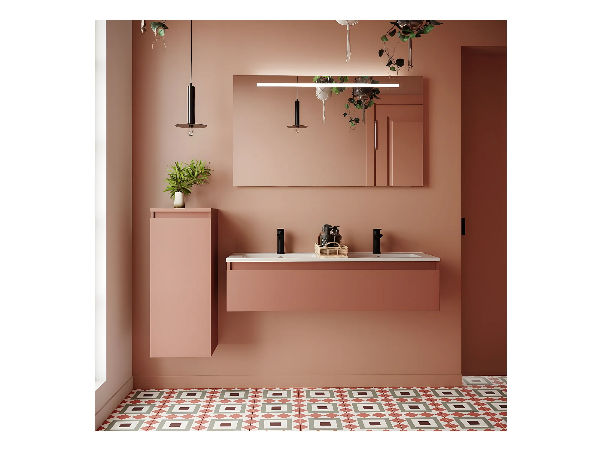 Meuble de salle de bain suspendu double vasque intégrée 120cm 1 tiroir Abricot + miroir + colonne ouverture gauche - Hudson