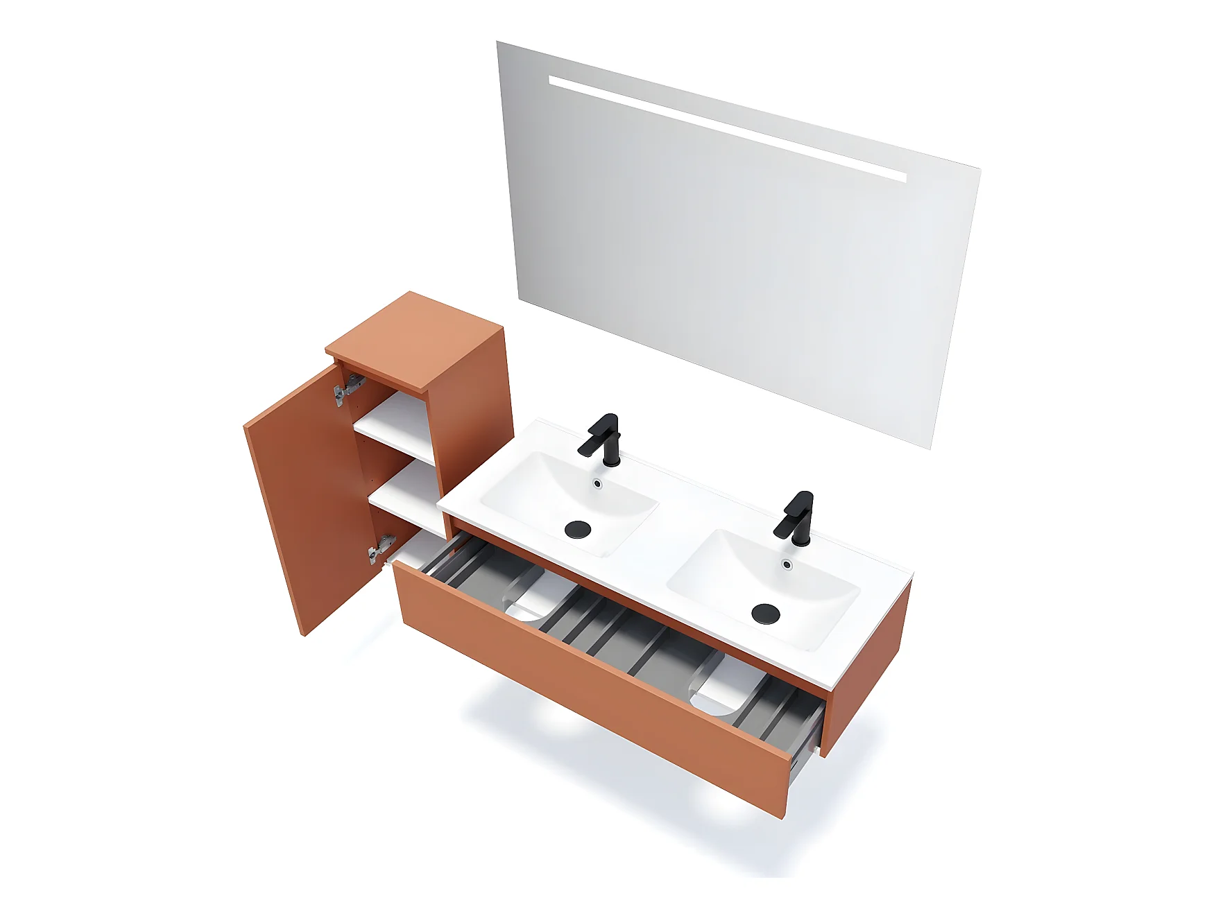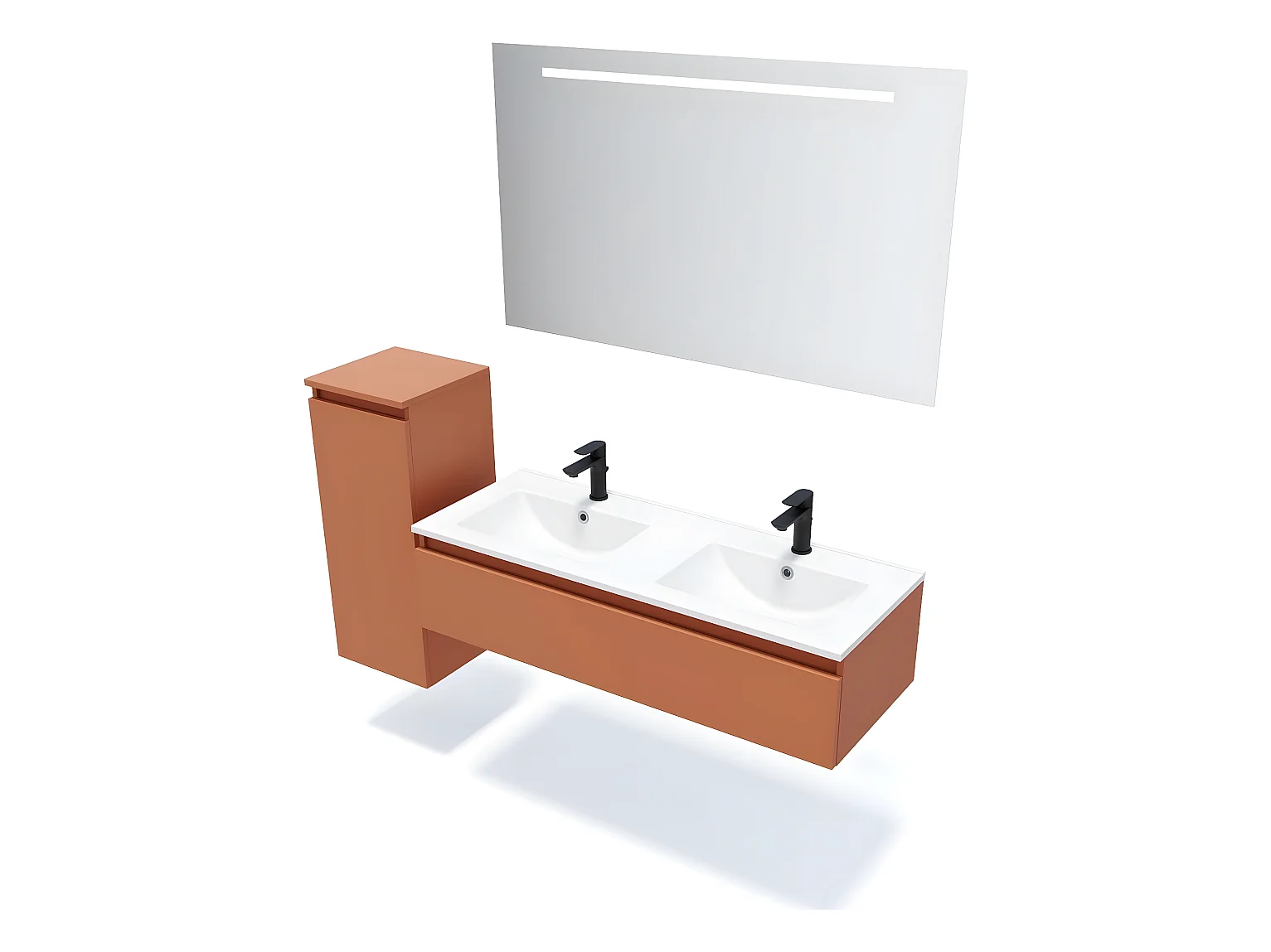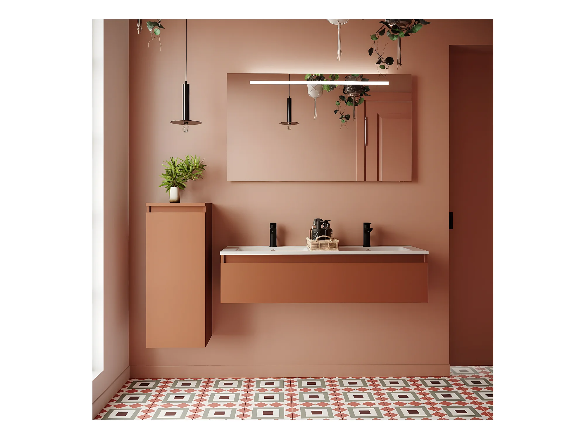 Meuble de salle de bain suspendu double vasque intégrée 120cm 1 tiroir Terracotta + miroir + colonne ouverture gauche - Hudson