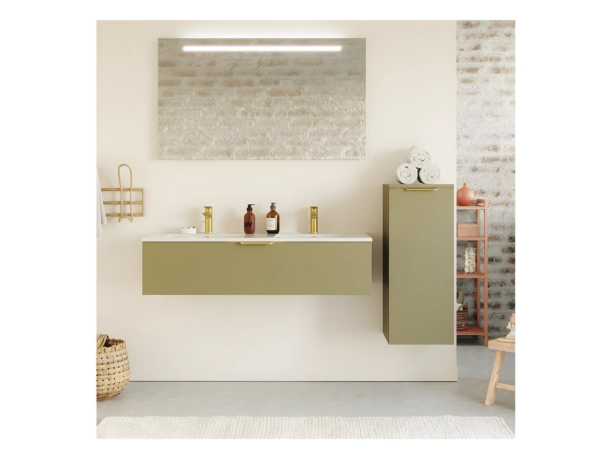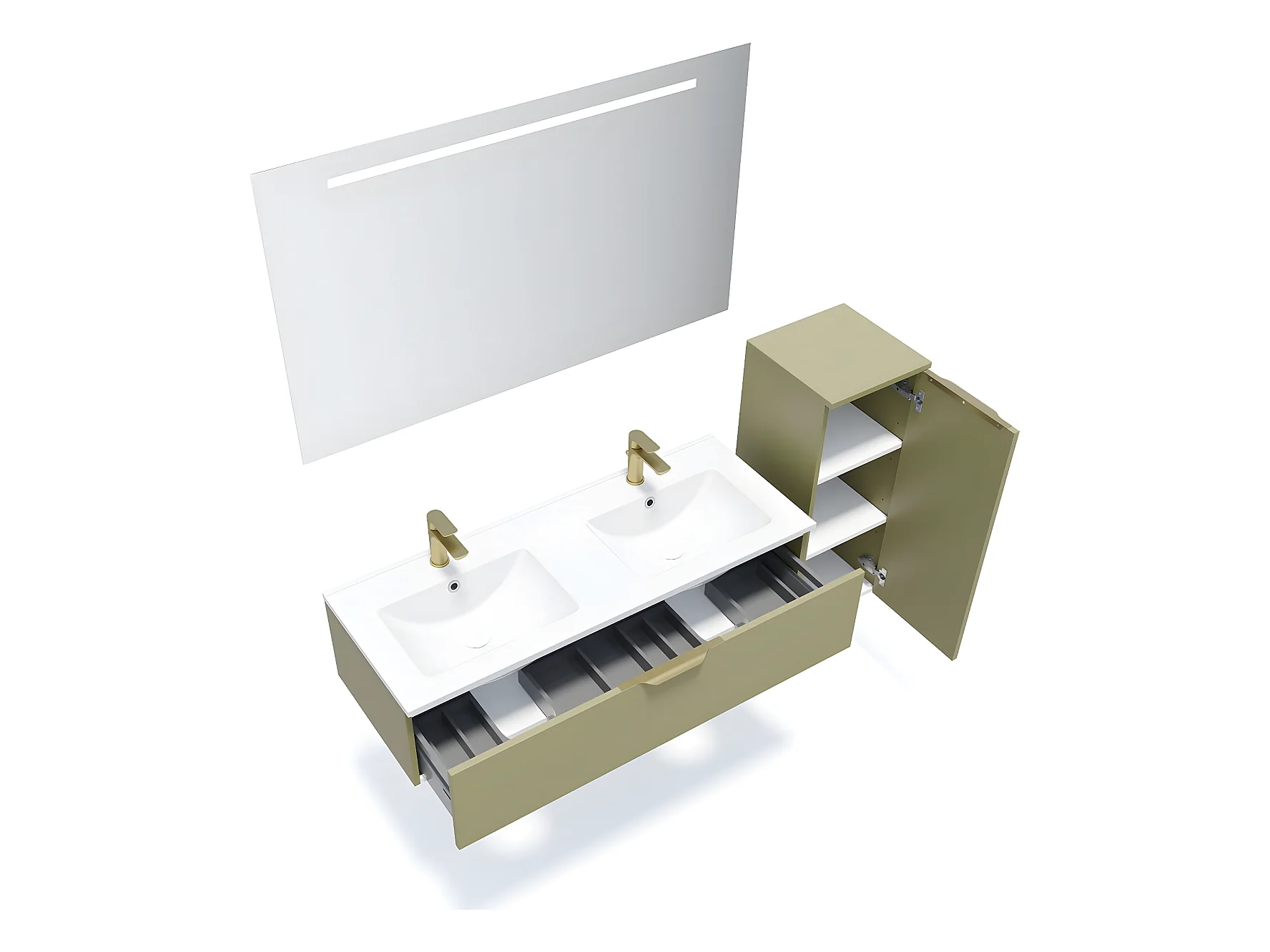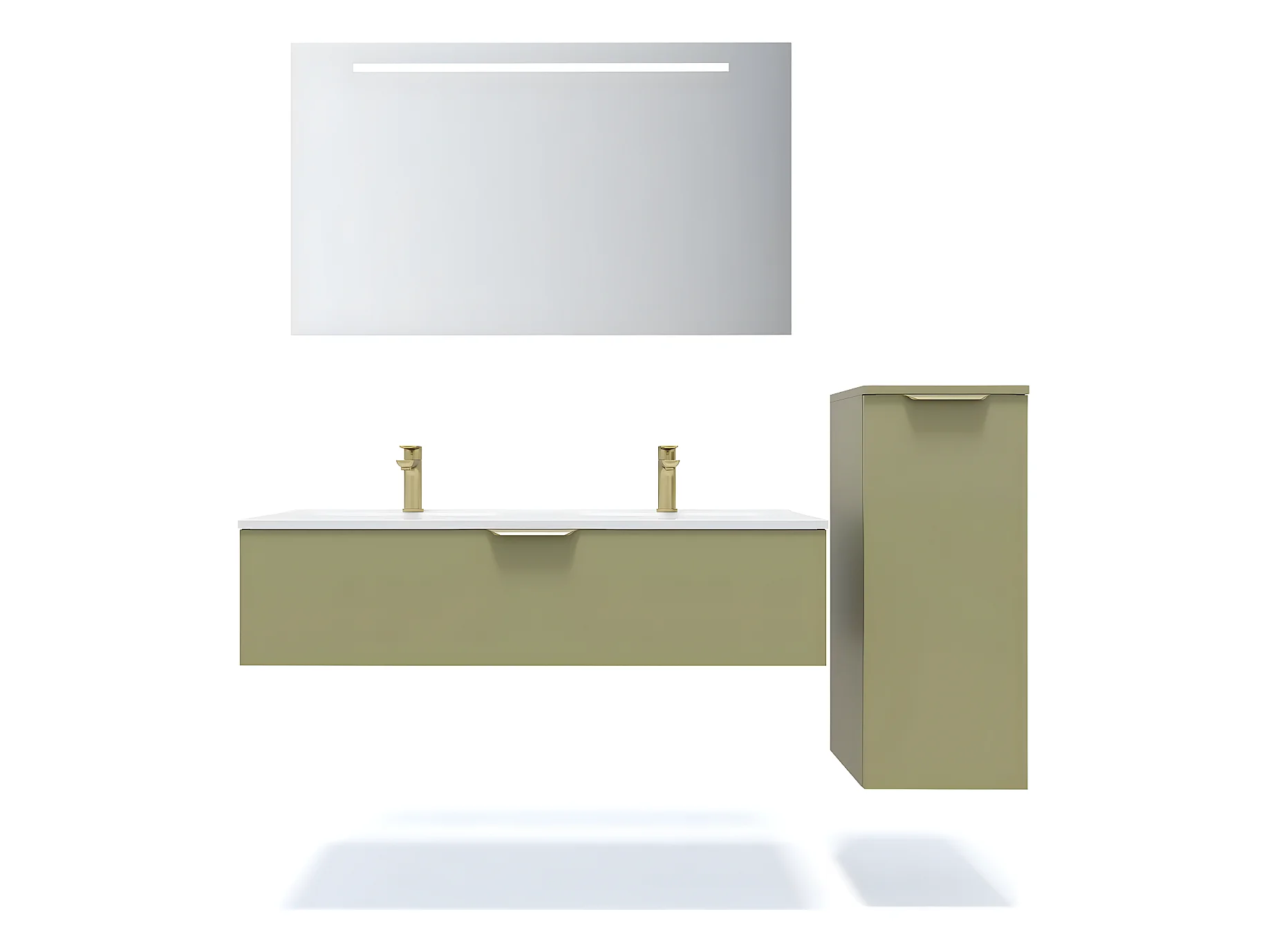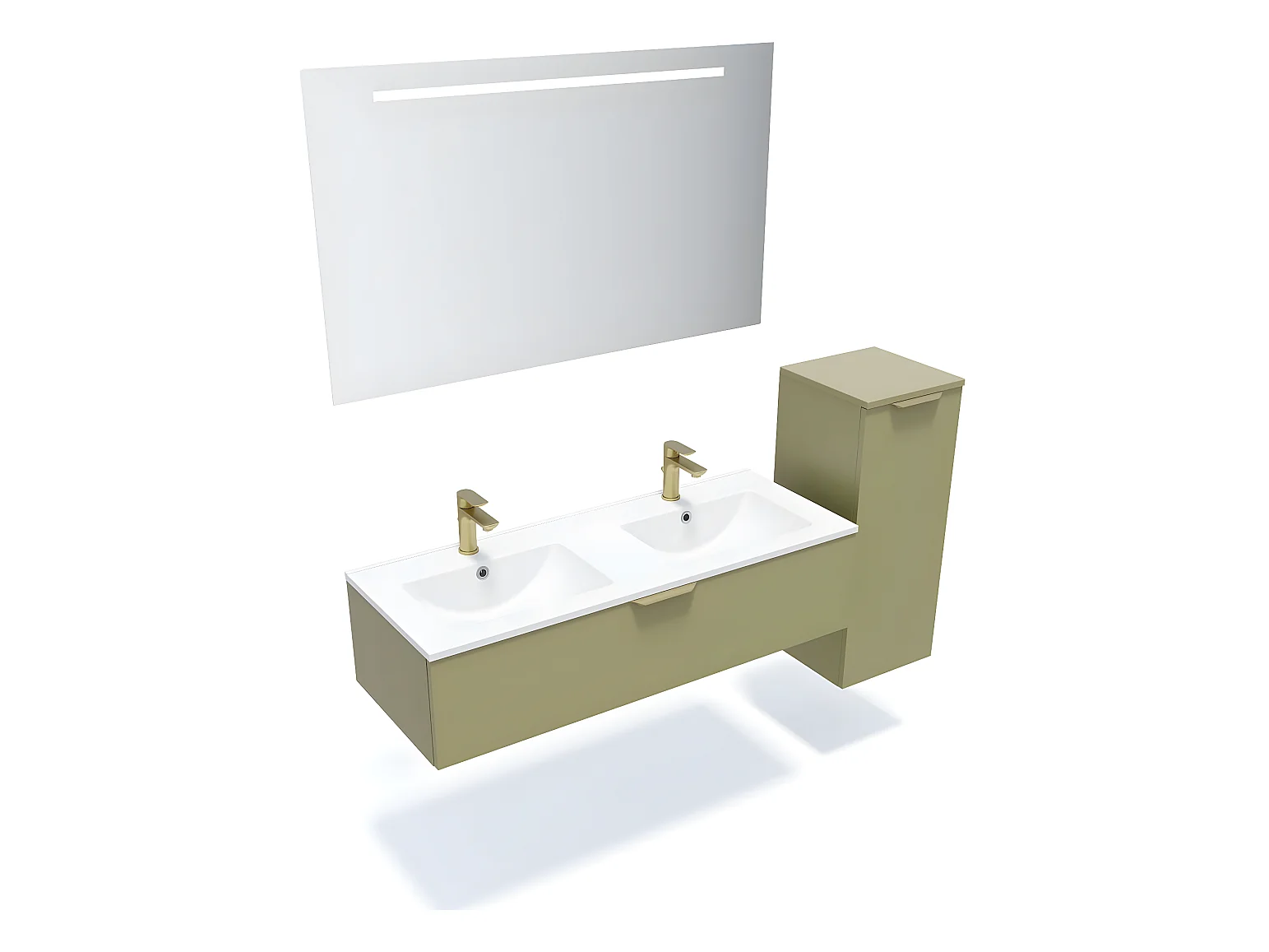 Meuble de salle de bain suspendu double vasque intégrée 120cm 1 tiroir Vert olive + miroir + colonne ouverture droite - Venice
