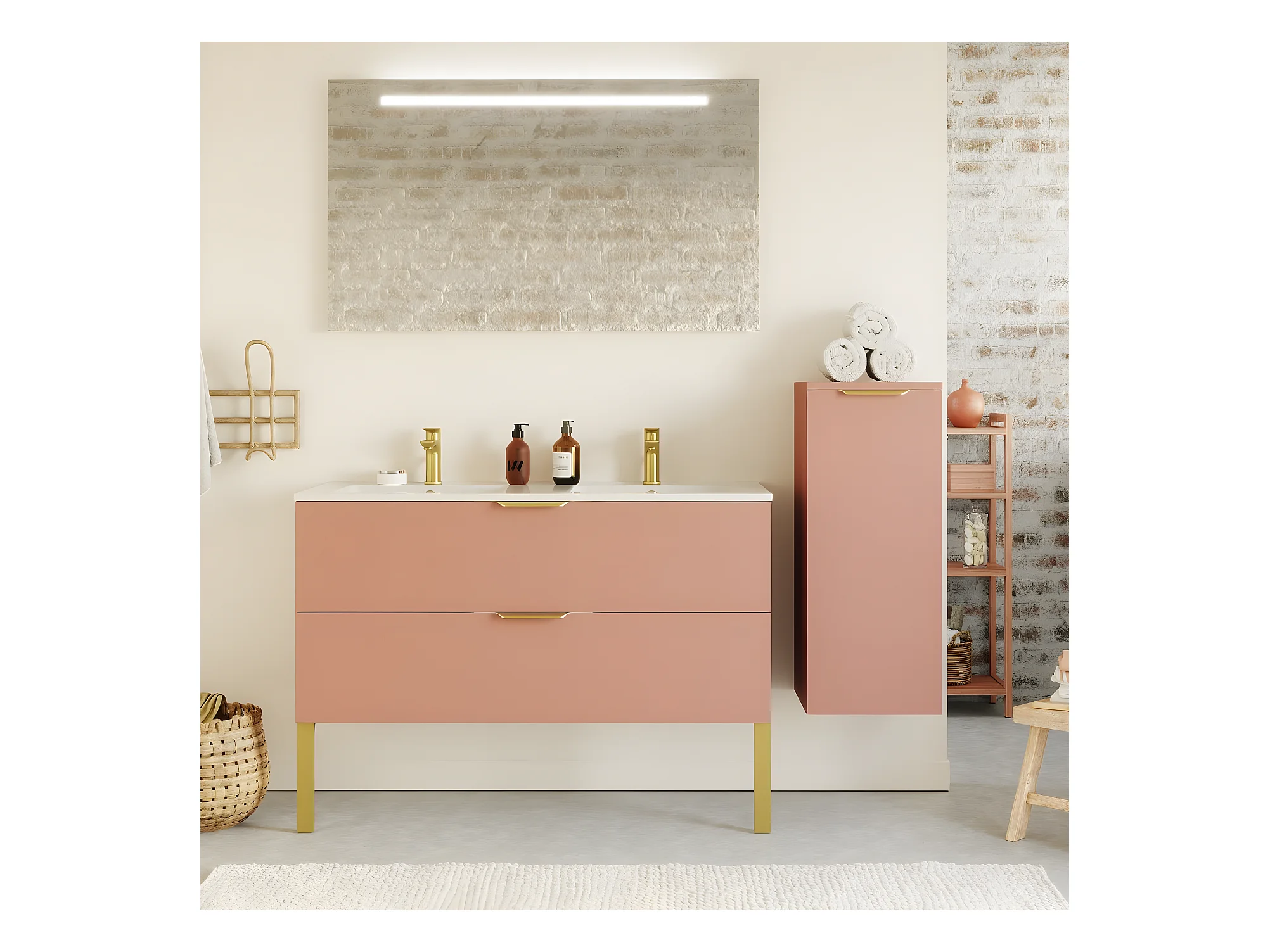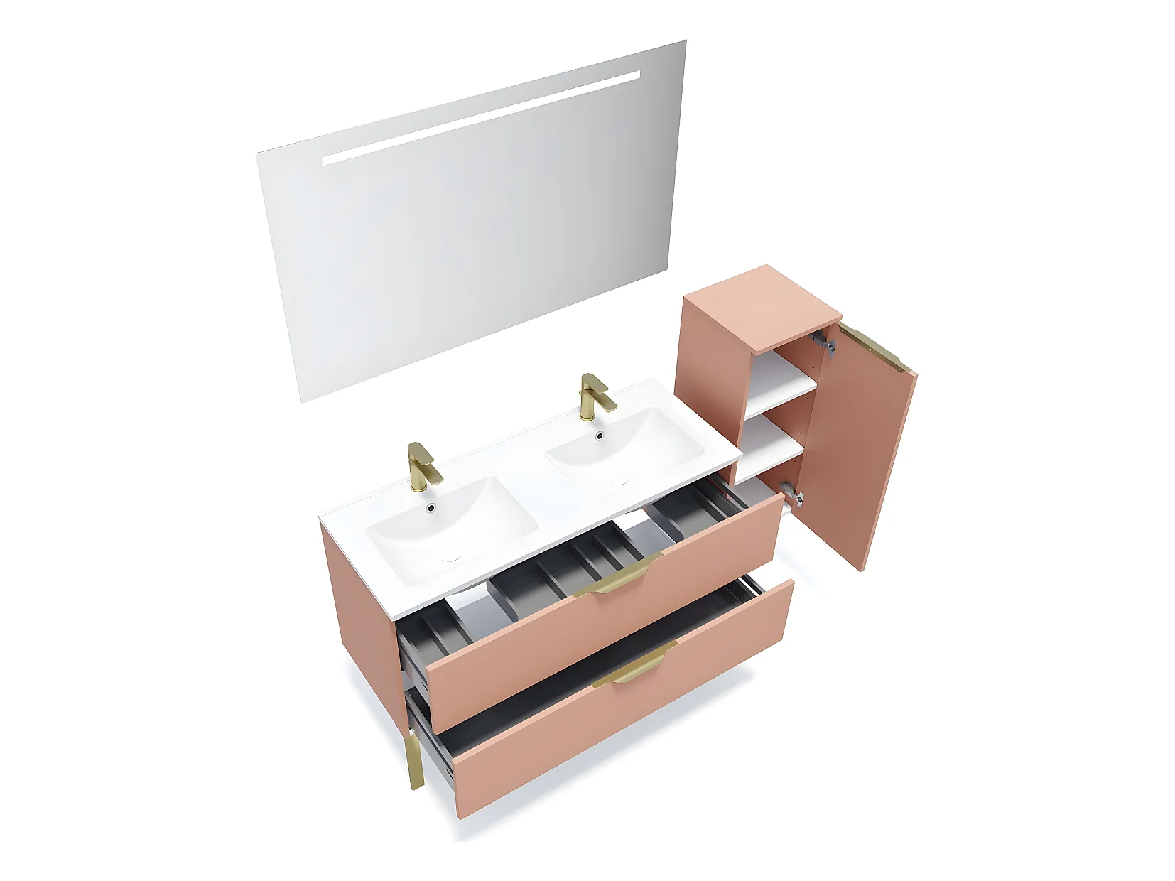 Meuble de salle de bain suspendu double vasque intégrée 120cm 2 tiroirs Abricot + miroir + colonne ouverture droite - Venice