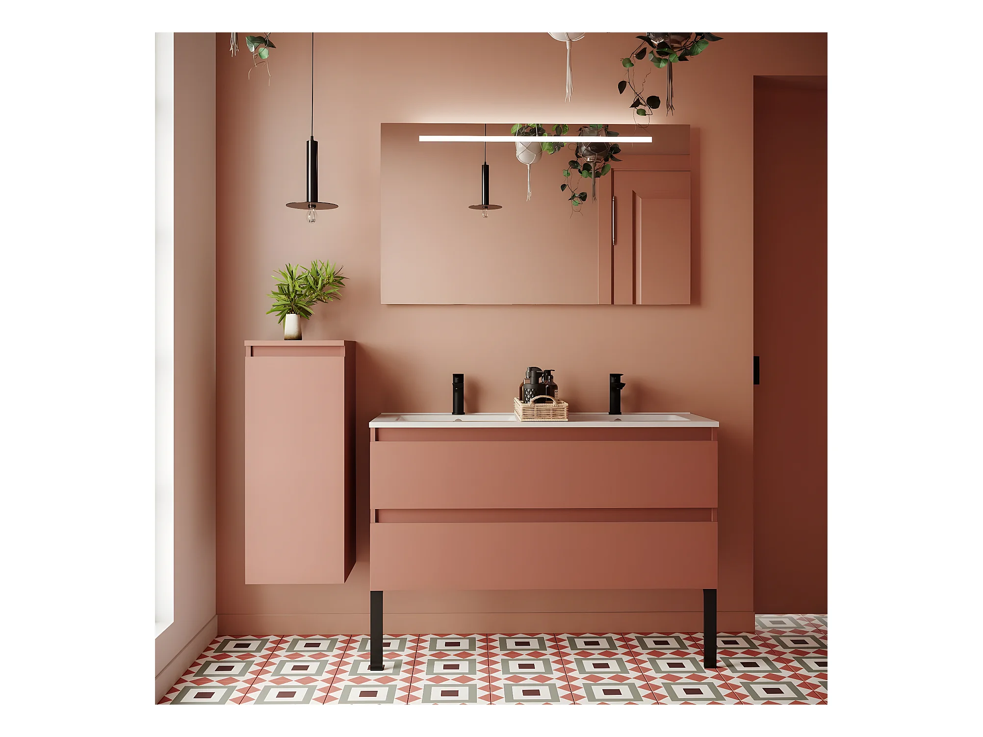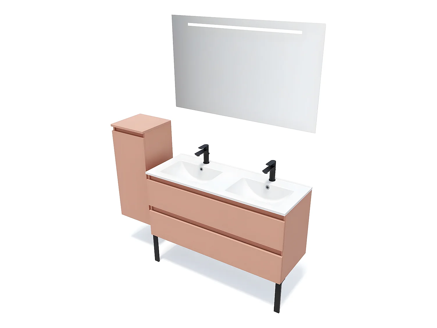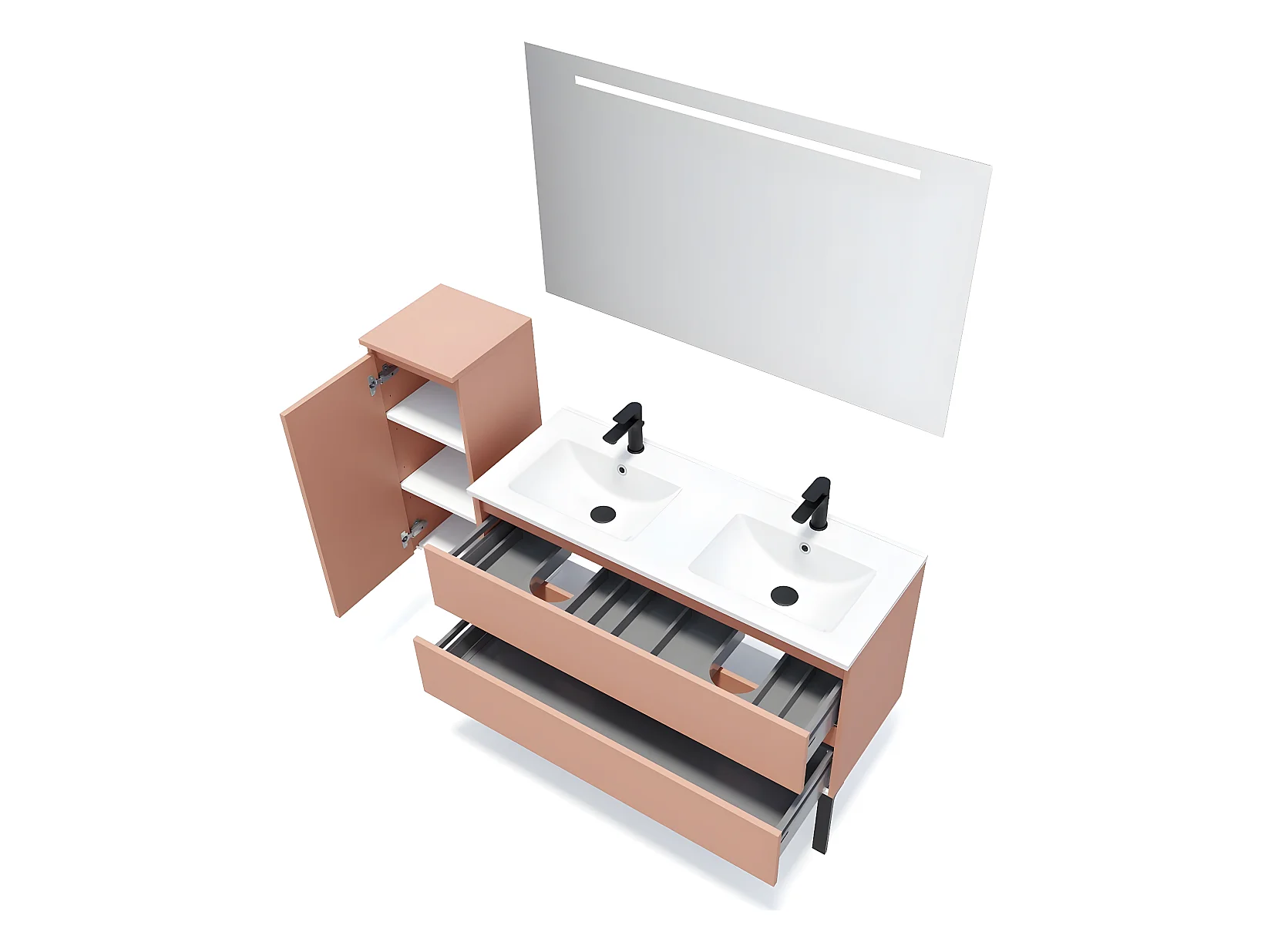 Meuble de salle de bain suspendu double vasque intégrée 120cm 2 tiroirs Abricot + miroir + colonne ouverture gauche - Hudson
