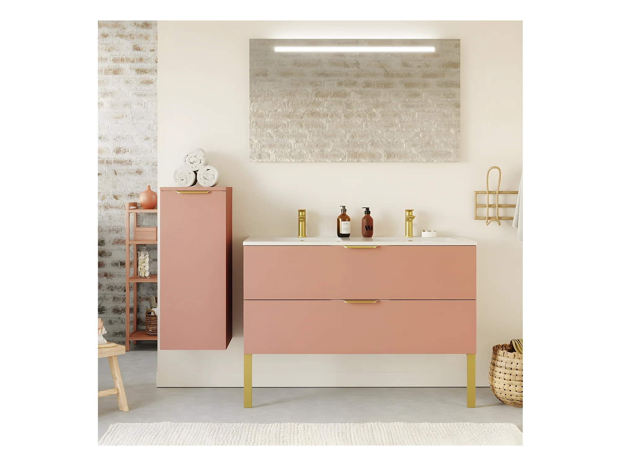 Meuble de salle de bain suspendu double vasque intégrée 120cm 2 tiroirs Abricot + miroir + colonne ouverture gauche - Venice