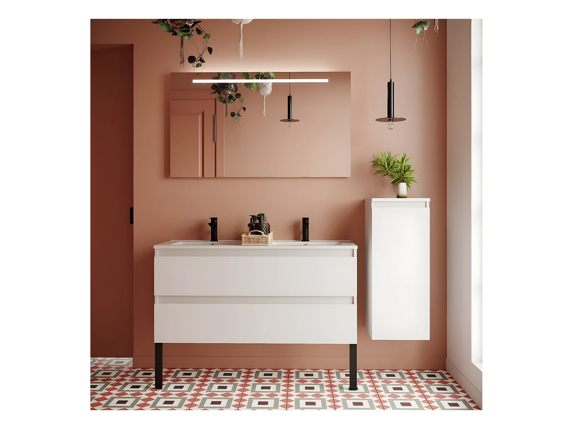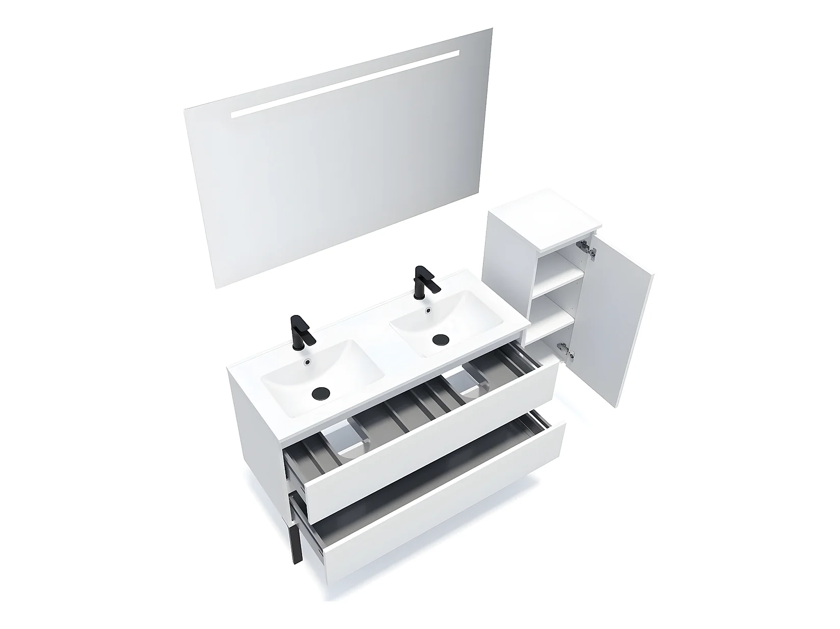 Meuble de salle de bain suspendu double vasque intégrée 120cm 2 tiroirs Blanc + miroir + colonne ouverture droite - Hudson