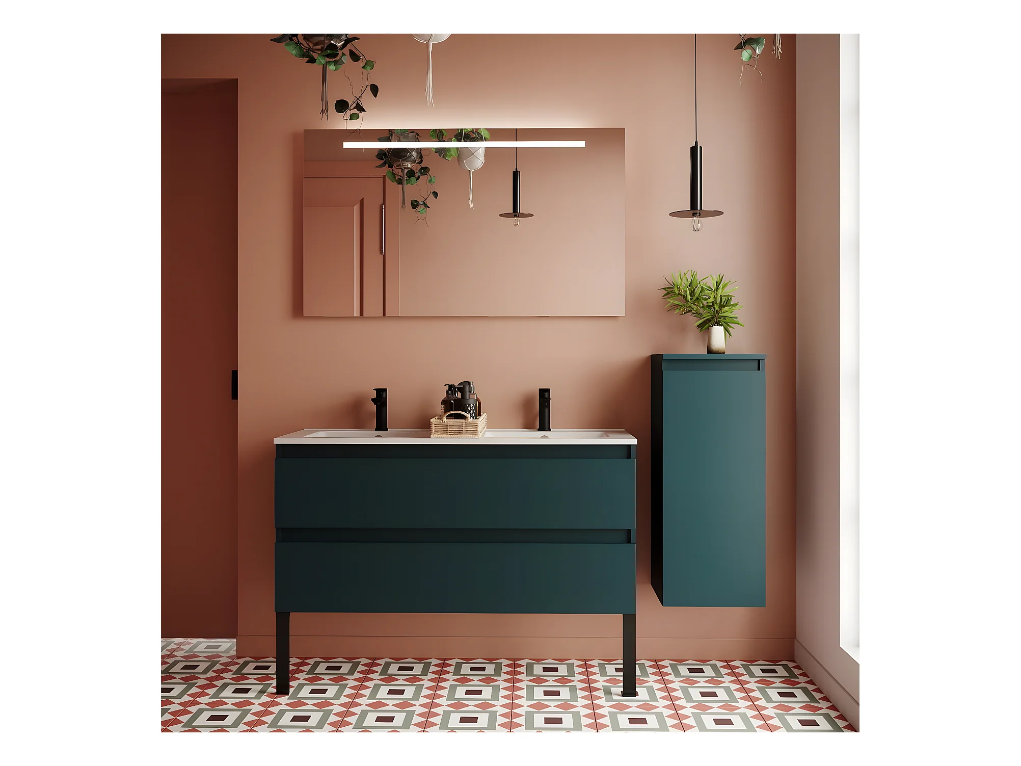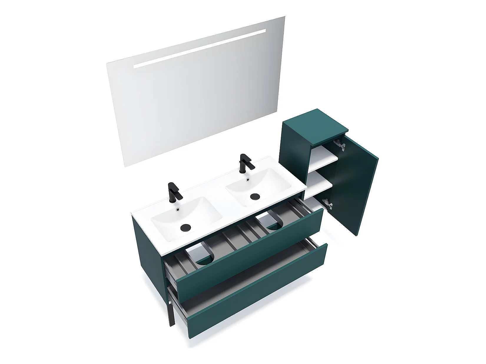 Meuble de salle de bain suspendu double vasque intégrée 120cm 2 tiroirs Bleu + miroir + colonne ouverture droite - Hudson