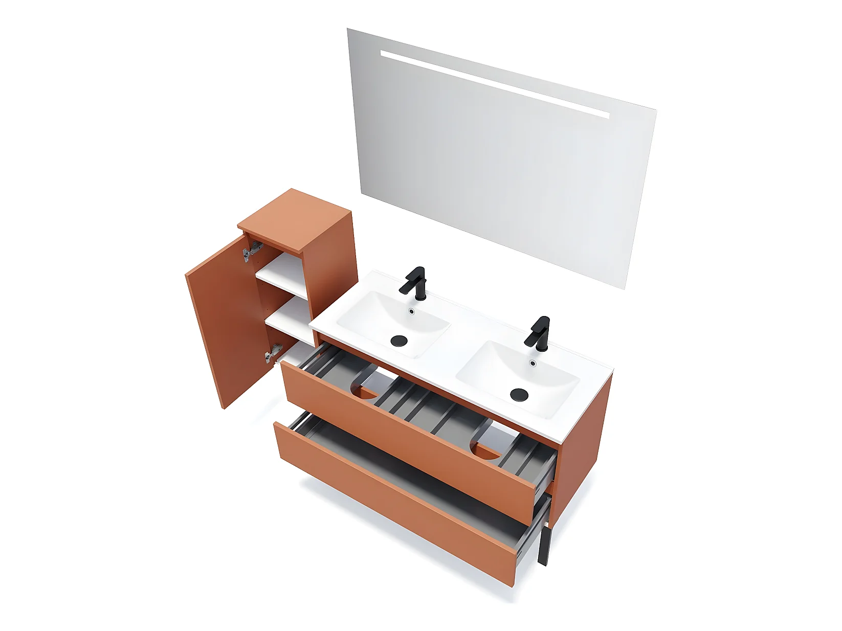 Meuble de salle de bain suspendu double vasque intégrée 120cm 2 tiroirs Terracotta + miroir + colonne ouverture gauche - Hudson