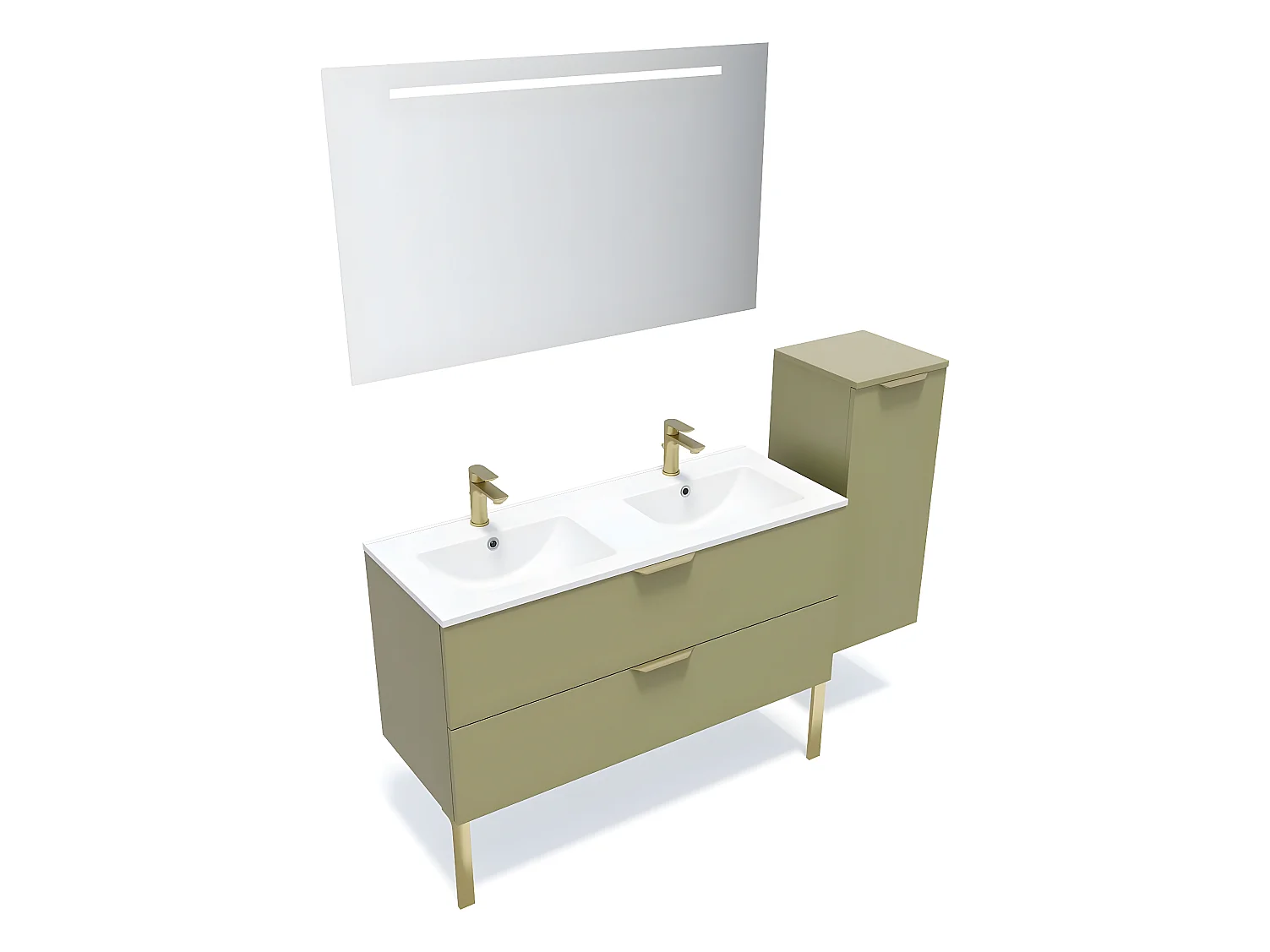 Meuble de salle de bain suspendu double vasque intégrée 120cm 2 tiroirs Vert olive + miroir + colonne ouverture droite - Venice