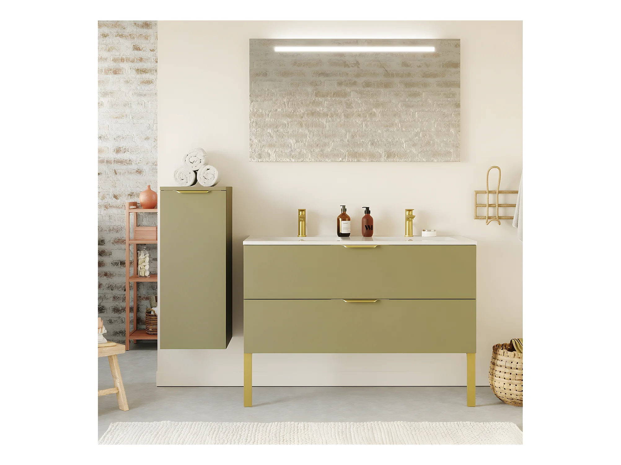 Meuble de salle de bain suspendu double vasque intégrée 120cm 2 tiroirs Vert olive + miroir + colonne ouverture gauche - Venice
