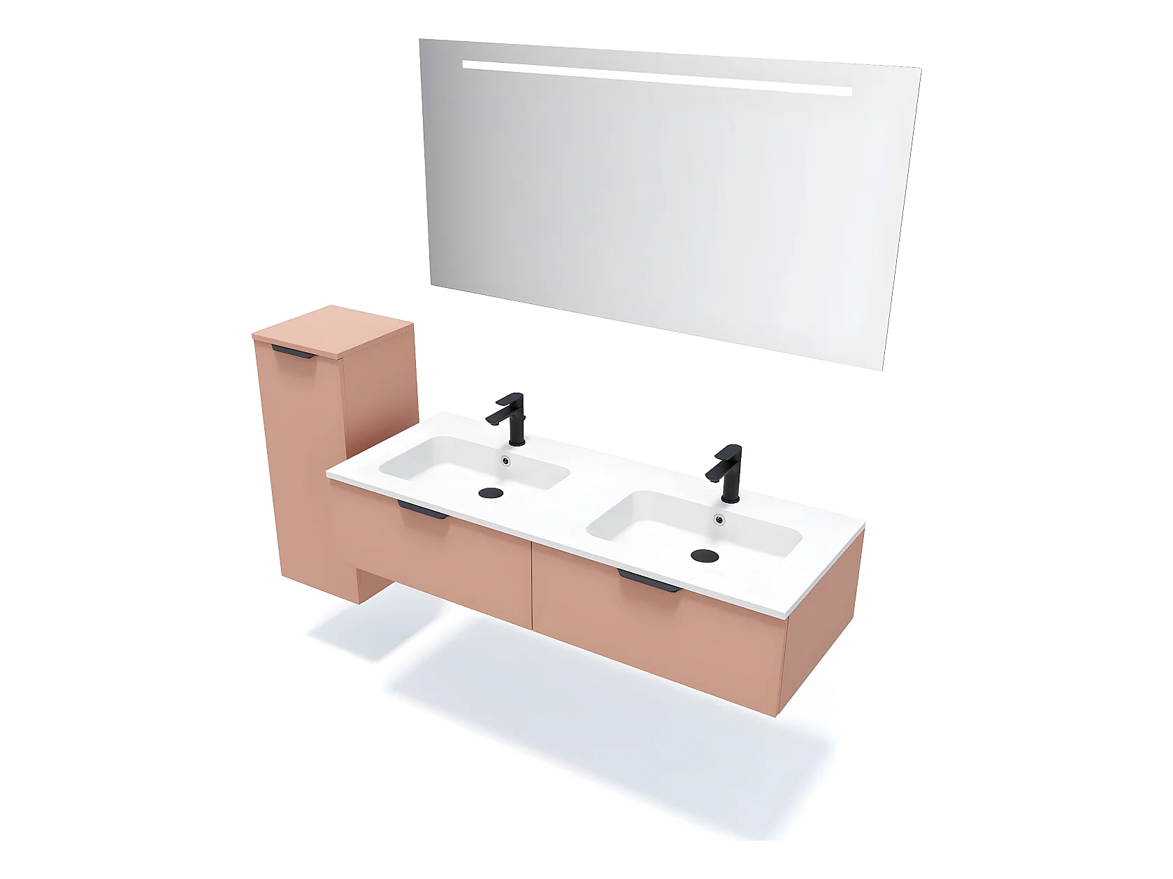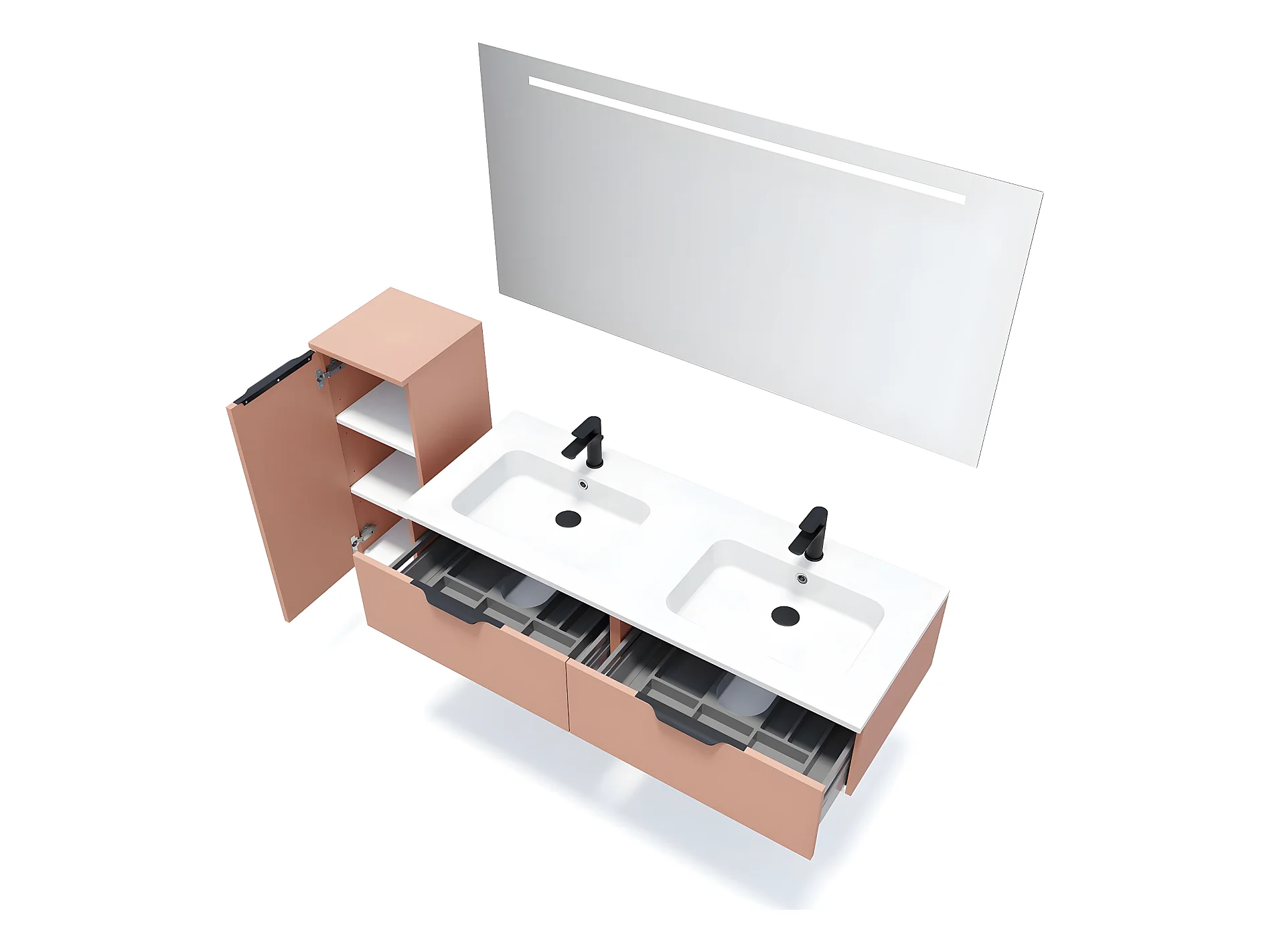 Meuble de salle de bain suspendu double vasque intégrée 140cm 2 tiroirs Abricot + miroir + colonne ouverture gauche - Soho
