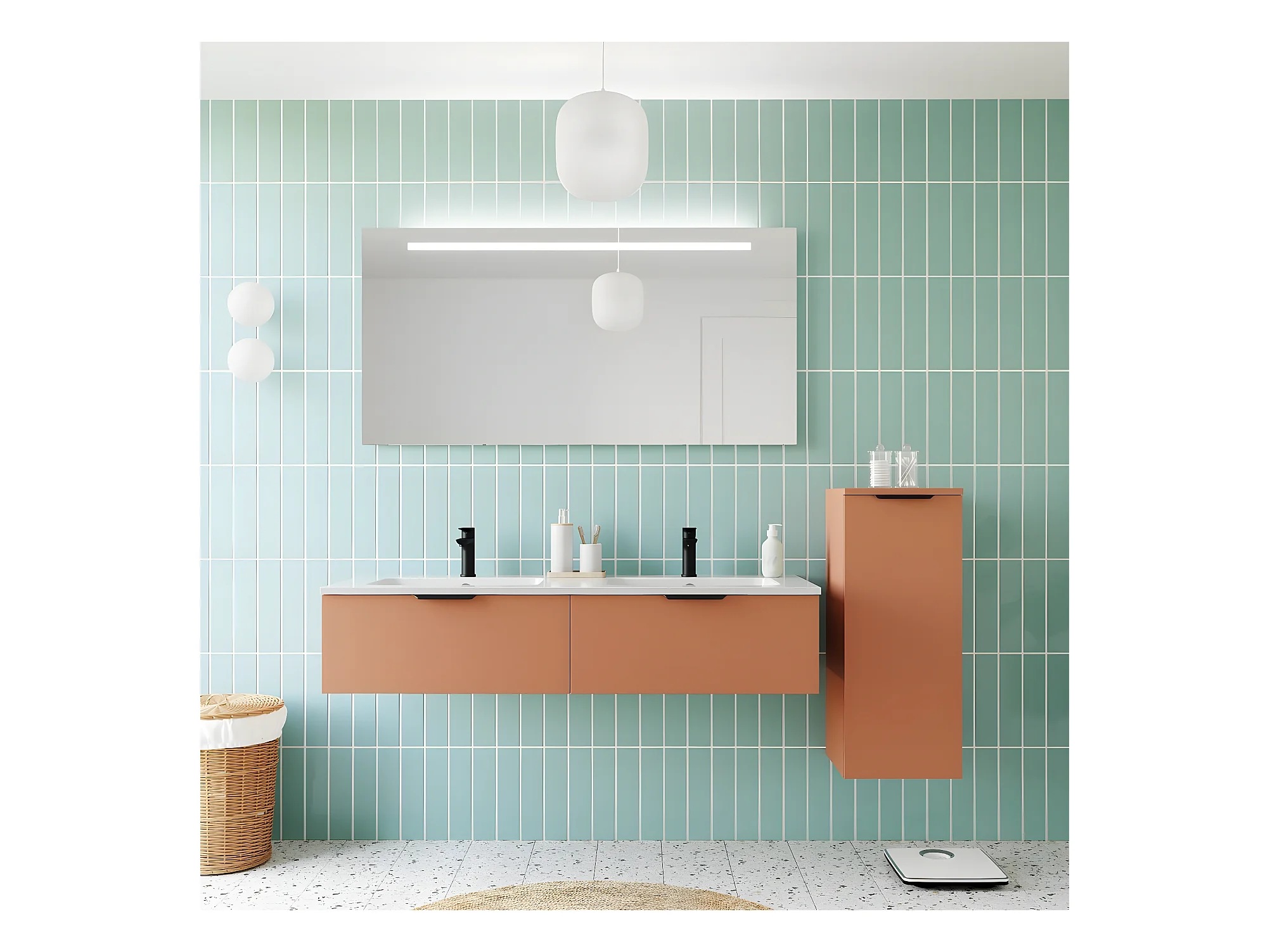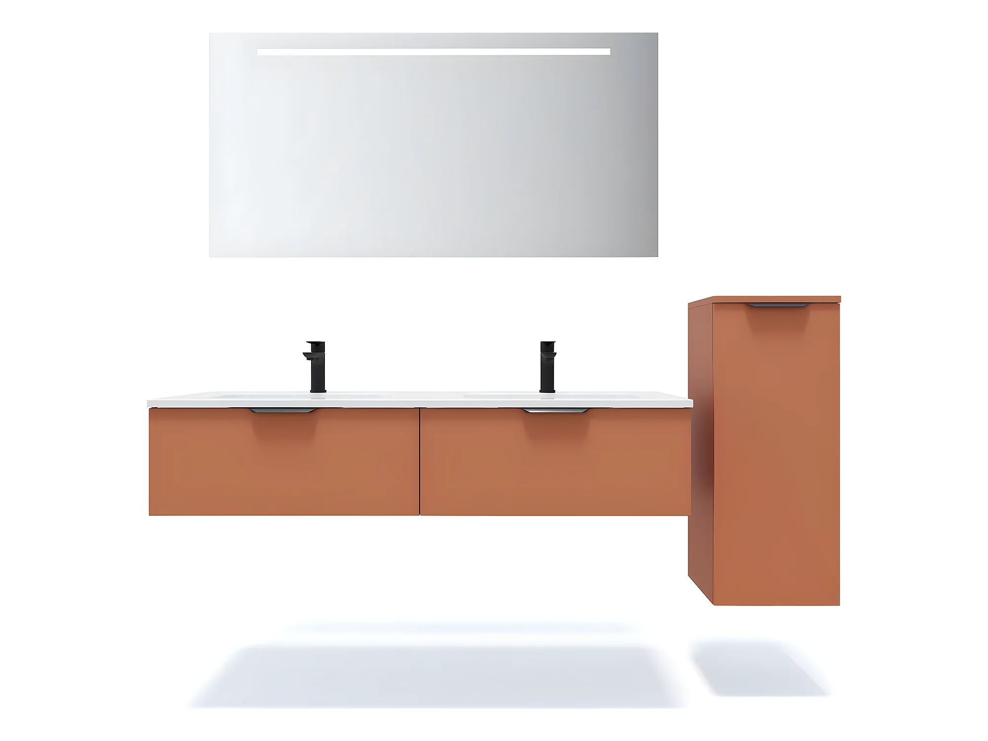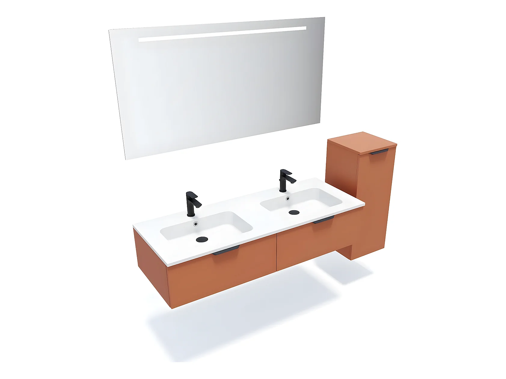 Meuble de salle de bain suspendu double vasque intégrée 140cm 2 tiroirs Terracotta + miroir + colonne ouverture droite - Soho