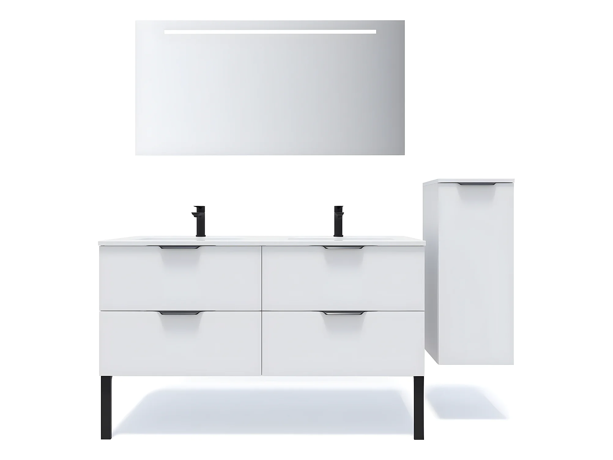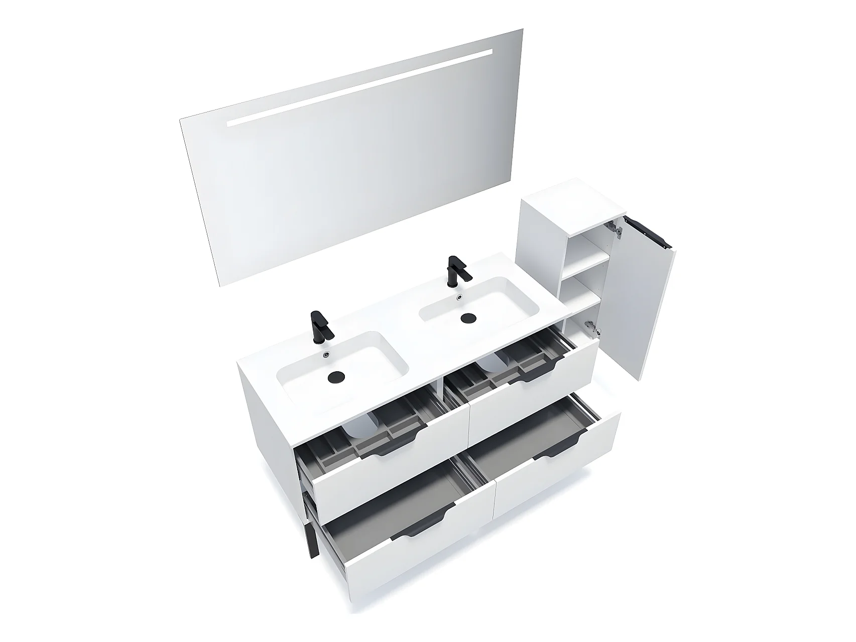 Meuble de salle de bain suspendu double vasque intégrée 140cm 4 tiroirs Blanc + miroir + colonne ouverture droite - Soho