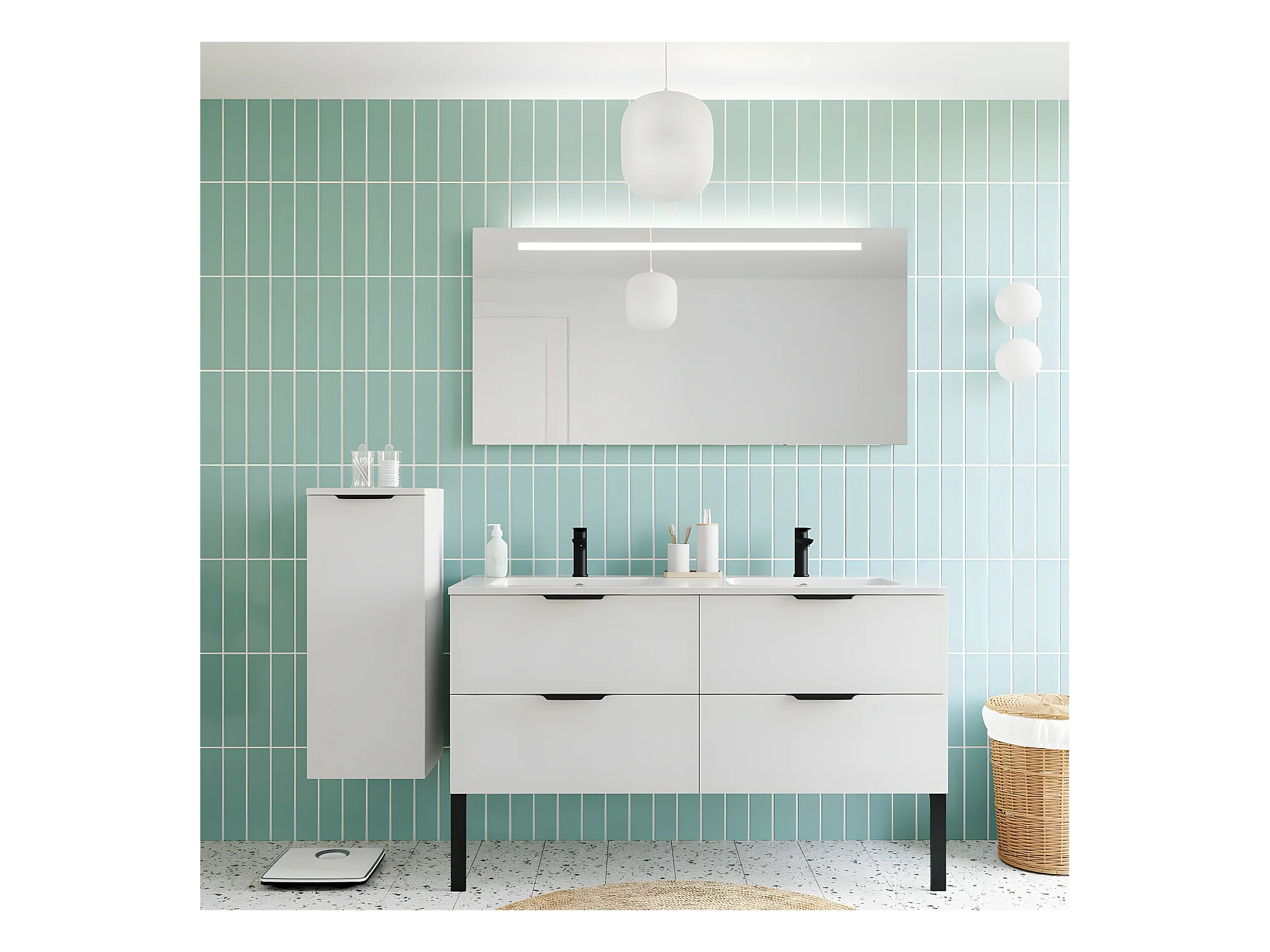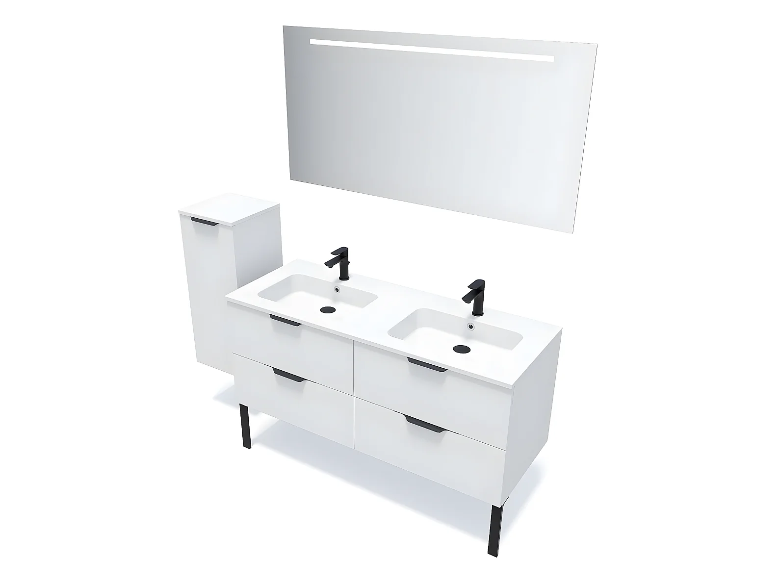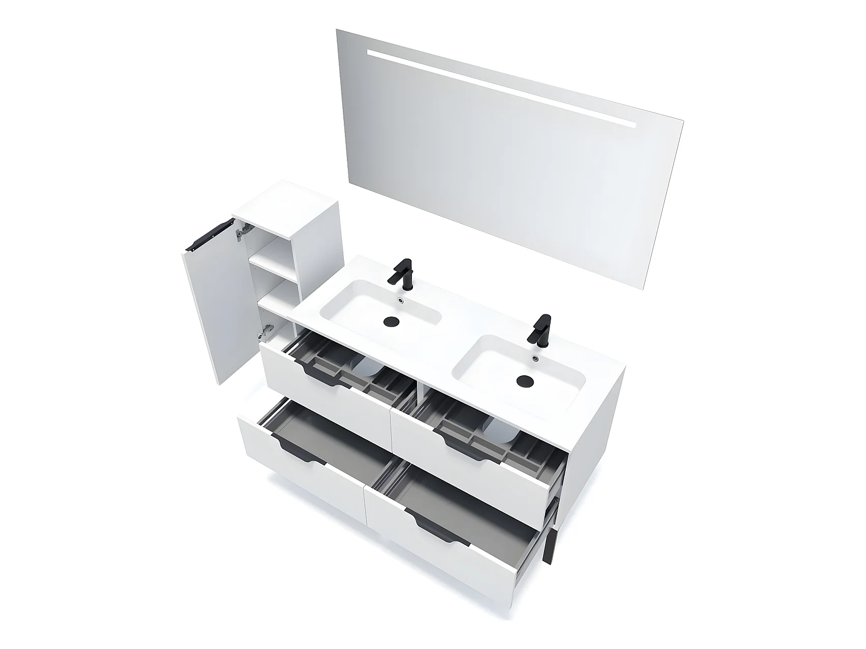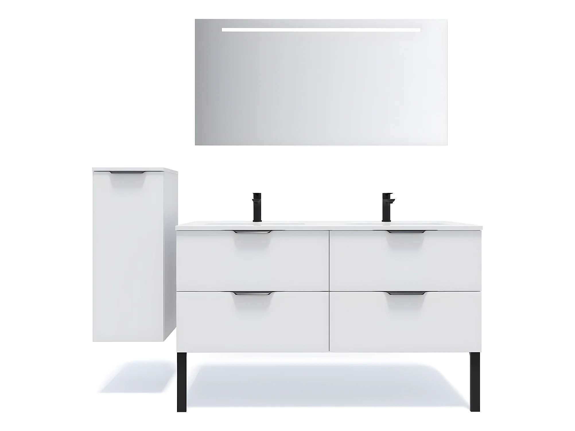Meuble de salle de bain suspendu double vasque intégrée 140cm 4 tiroirs Blanc + miroir + colonne ouverture gauche - Soho