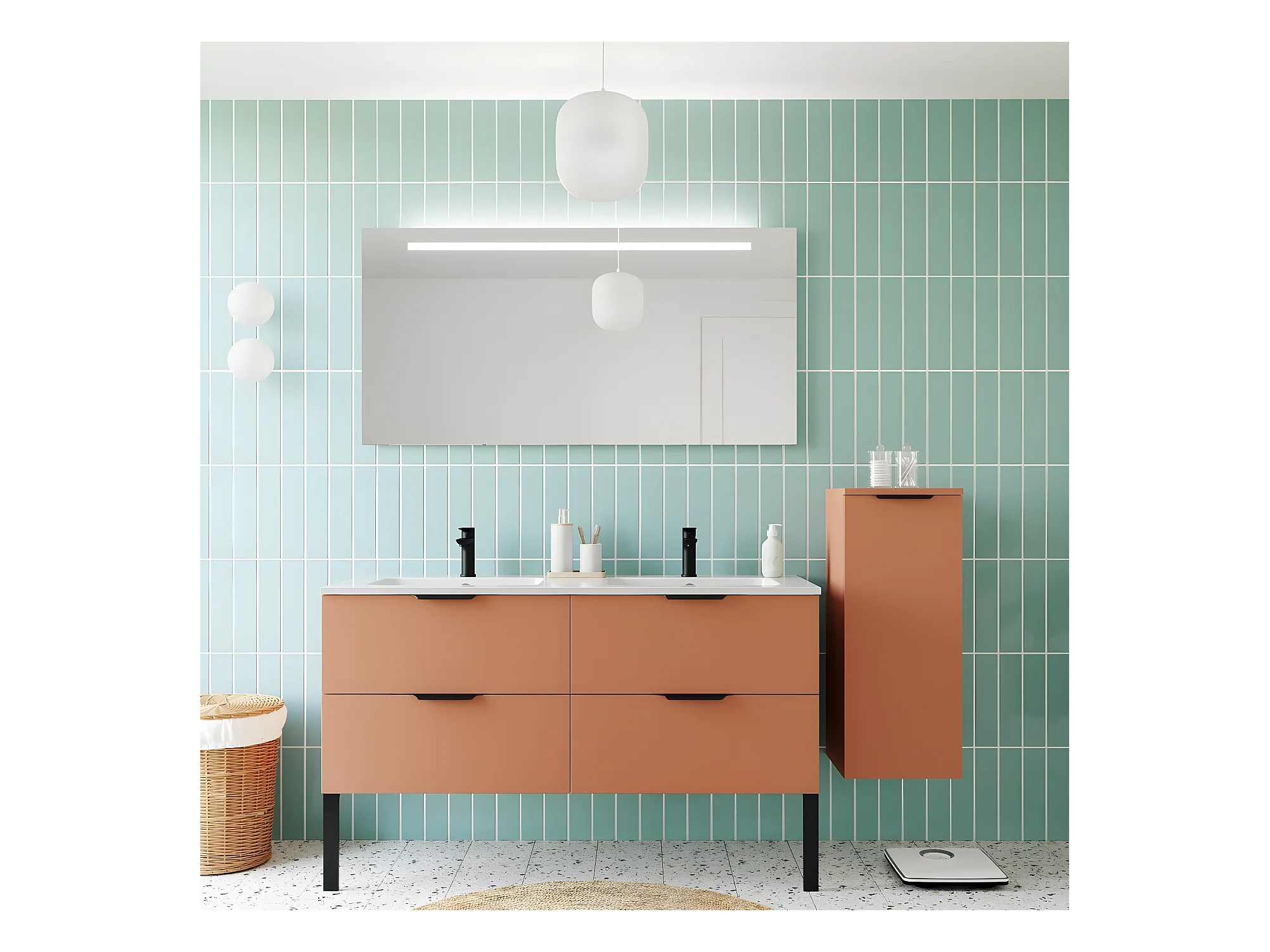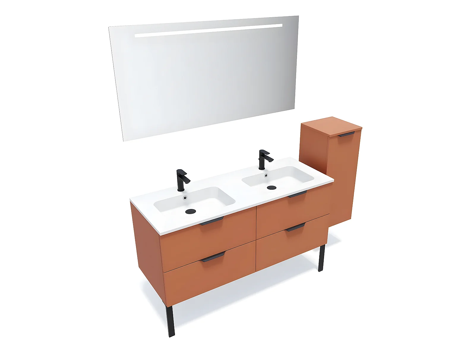 Meuble de salle de bain suspendu double vasque intégrée 140cm 4 tiroirs Terracotta + miroir + colonne ouverture droite - Soho