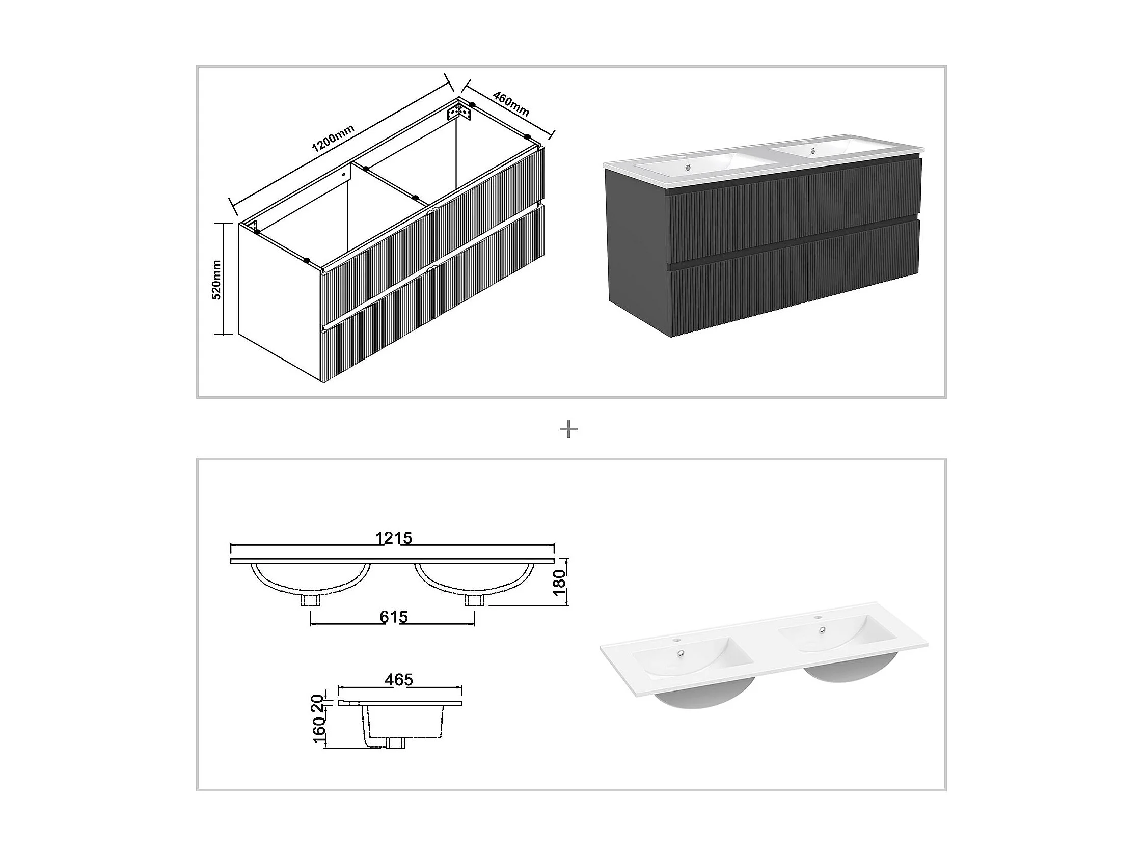 Meuble de salle de bain suspendu Strié 120cm avec double vasque + 4 tiroirs, Anthracite