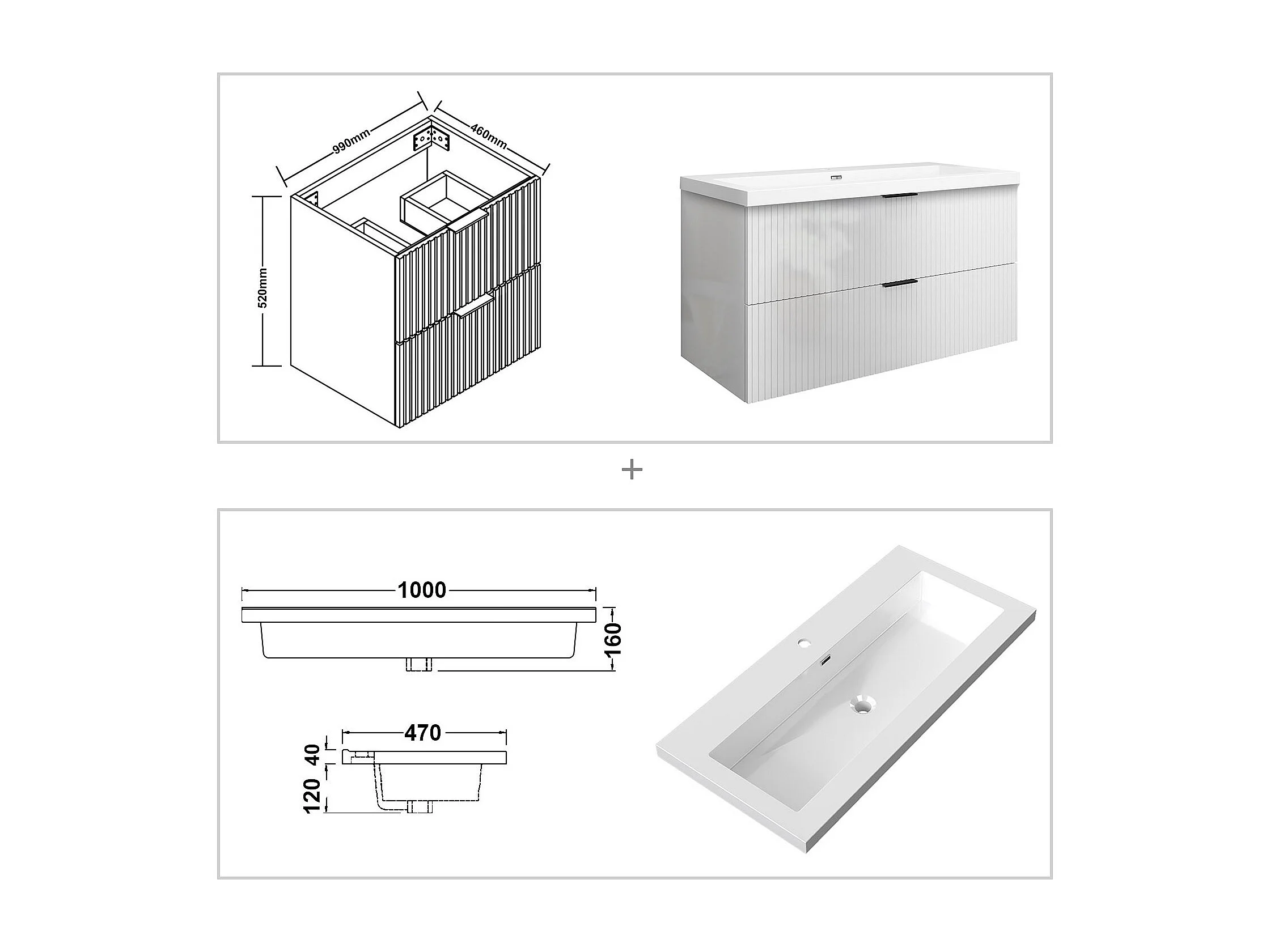 Meuble de salle de bain suspendu Strié Brillant 100cm avec simple lavabo + 2 tiroirs, Blanc