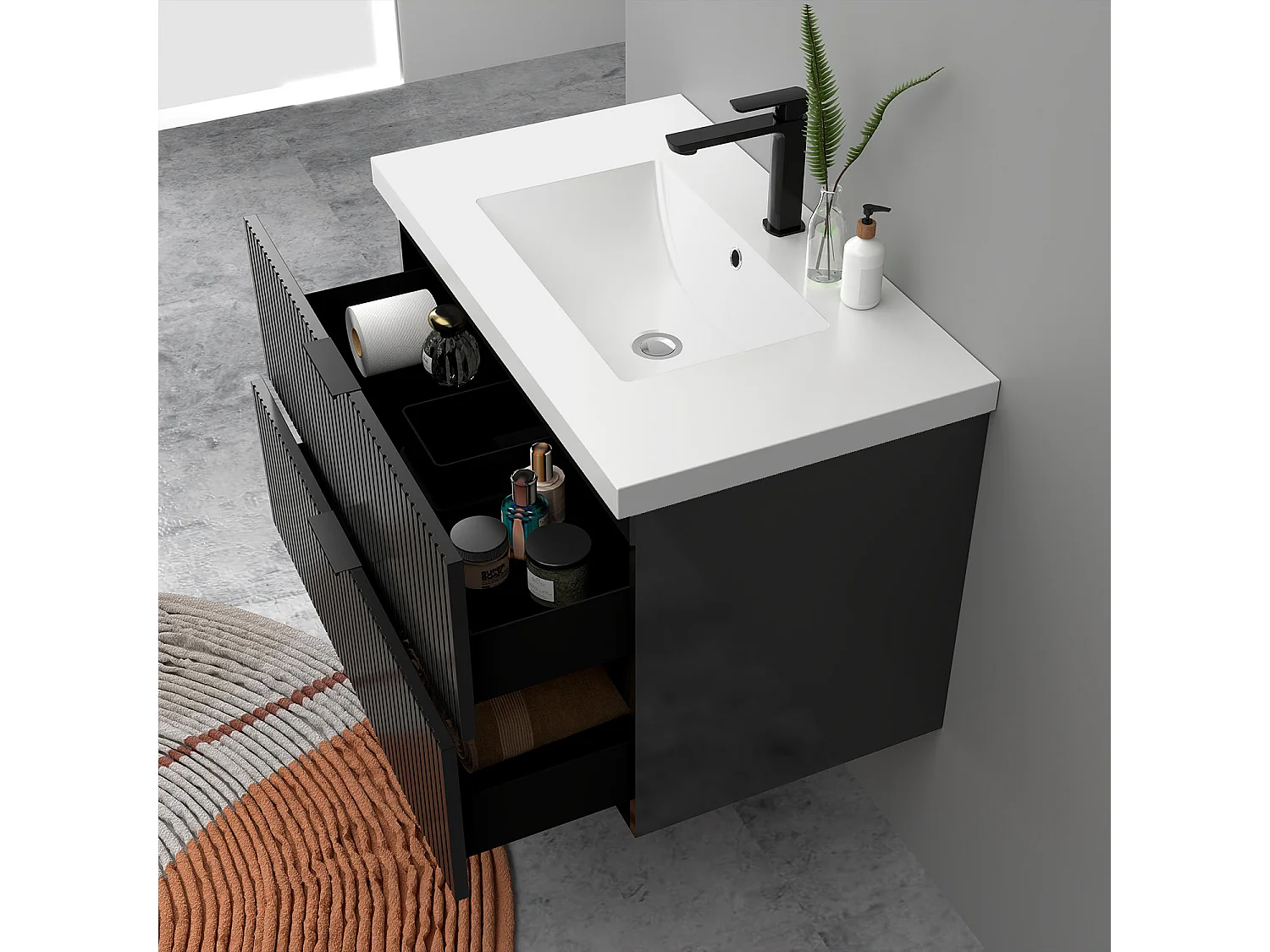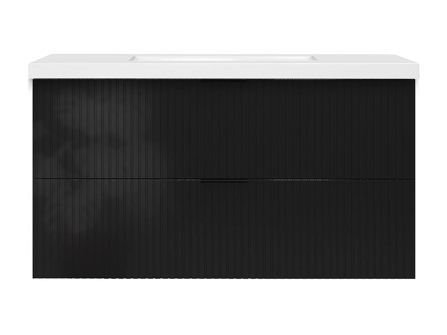 Meuble de salle de bain suspendu Strié Brillant 100cm avec simple vasque + 2 tiroirs, Noir