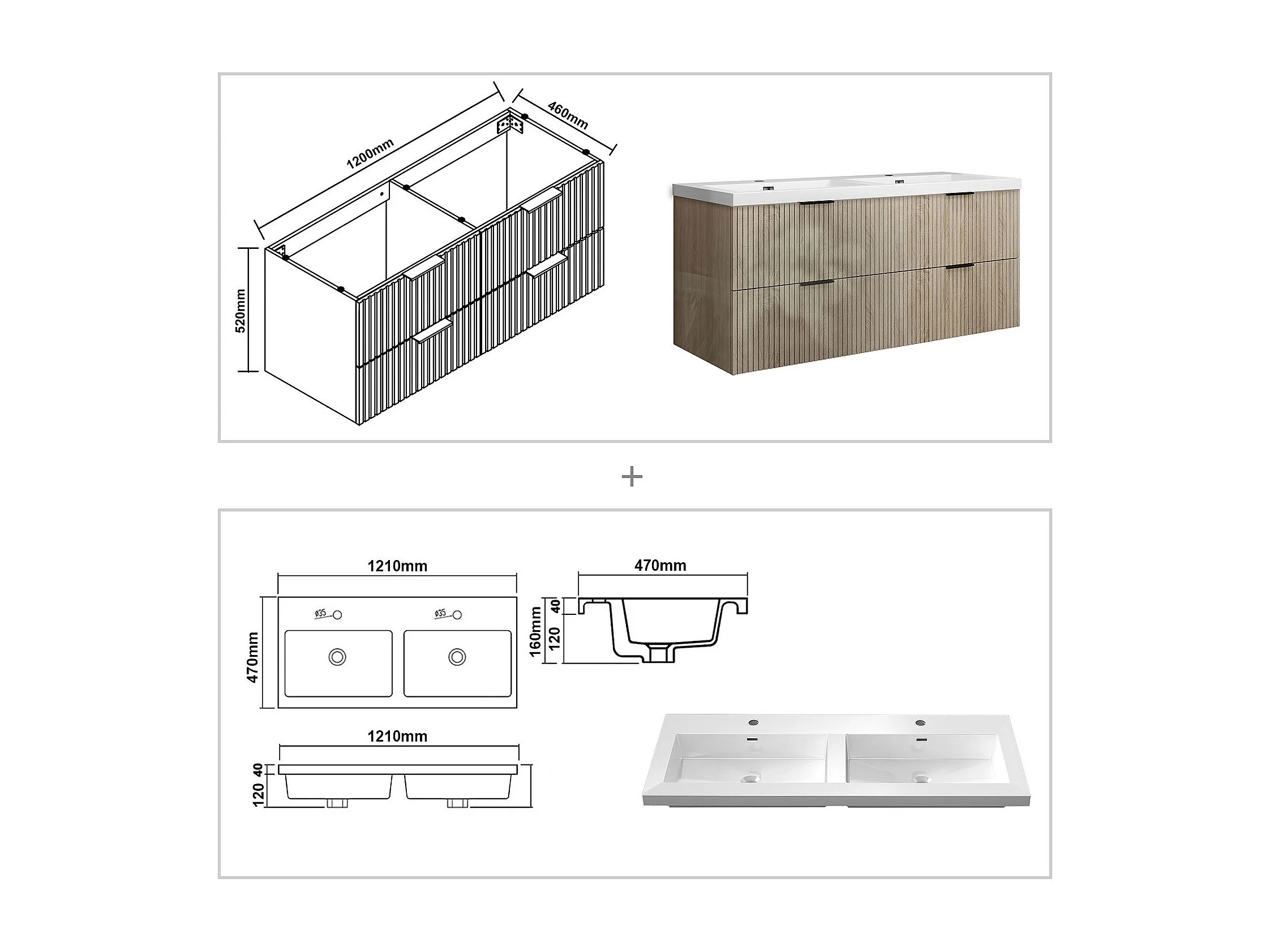 Meuble de salle de bain suspendu Strié Brillant 120cm avec simple lavabo + 4 tiroirs, Chêne