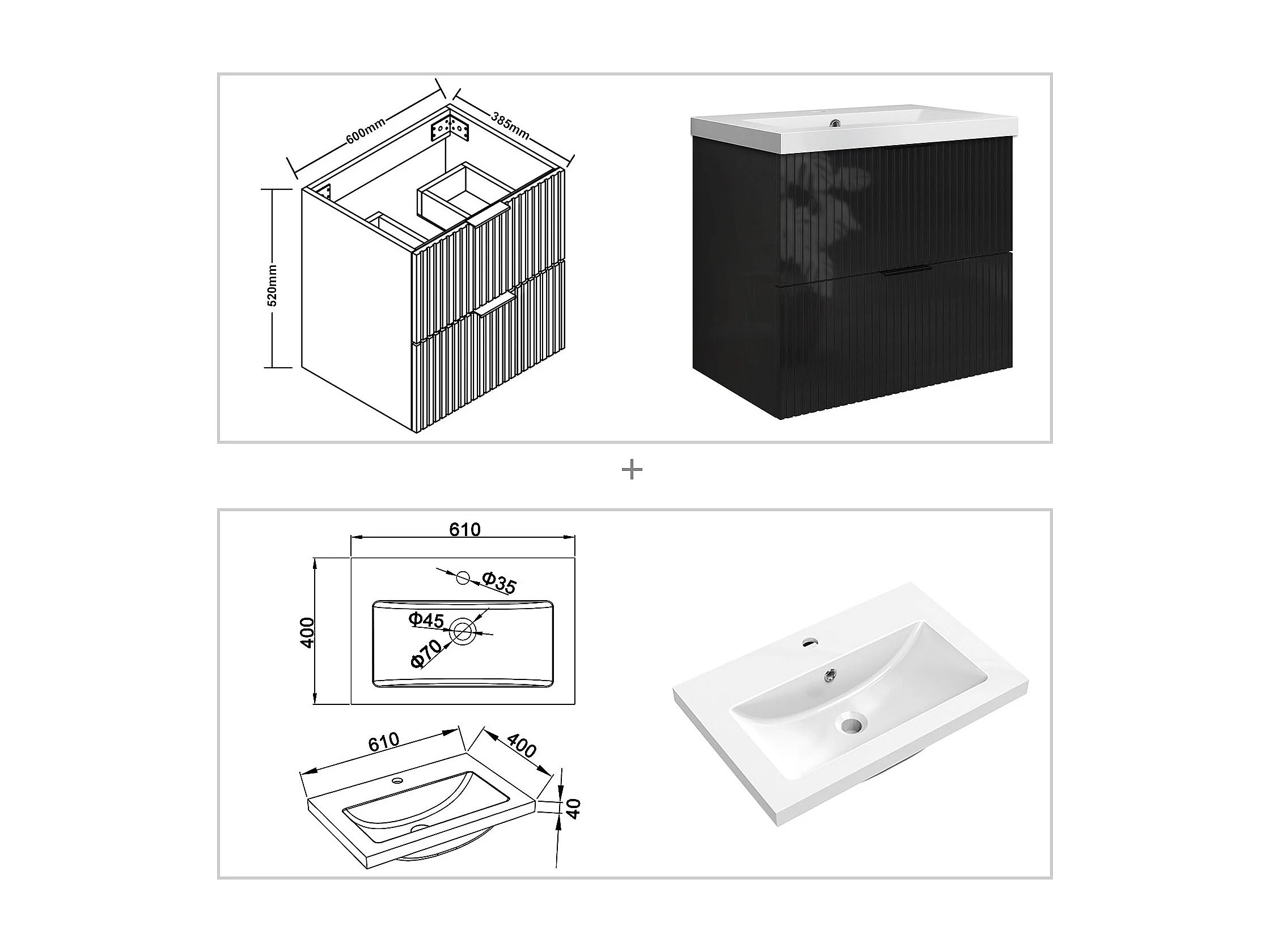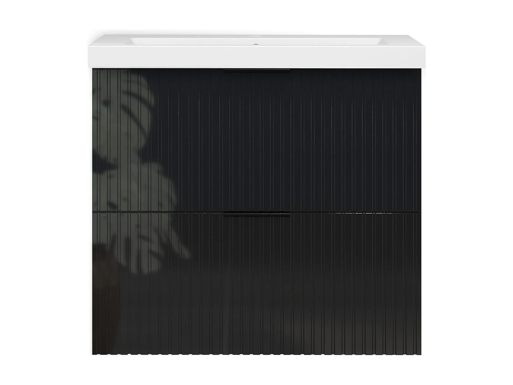 Meuble de salle de bain suspendu Strié Brillant 60cm avec simple vasque + 2 tiroirs, Noir