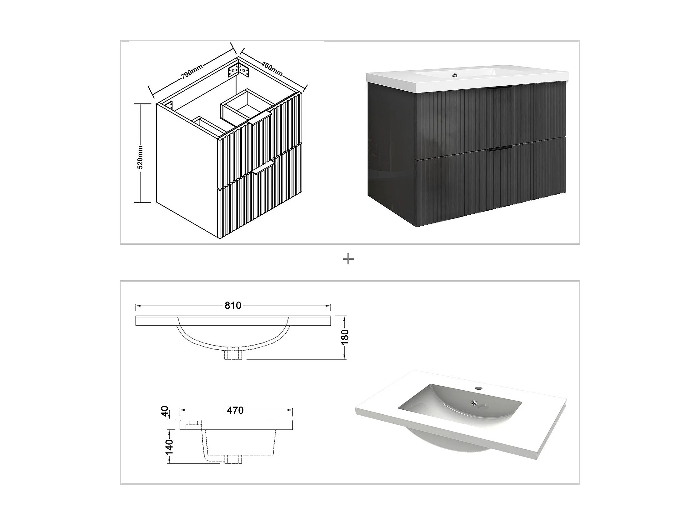 Meuble de salle de bain suspendu Strié Brillant 80cm avec simple vasque + 2 tiroirs, Anthracite
