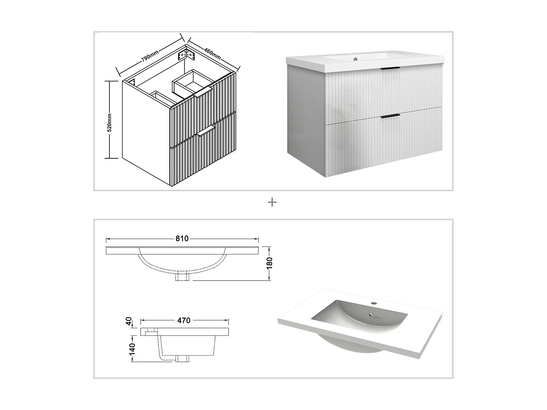 Meuble de salle de bain suspendu Strié Brillant 80cm avec simple vasque + 2 tiroirs, Blanc
