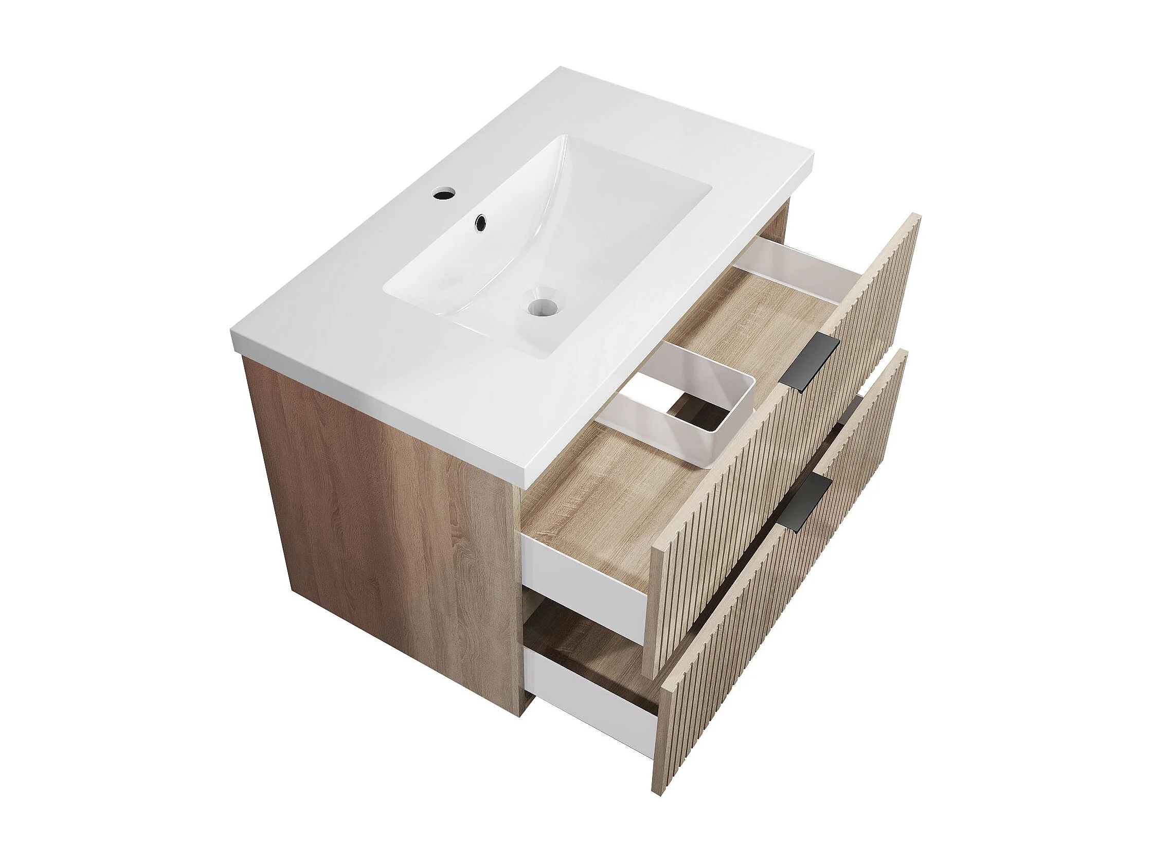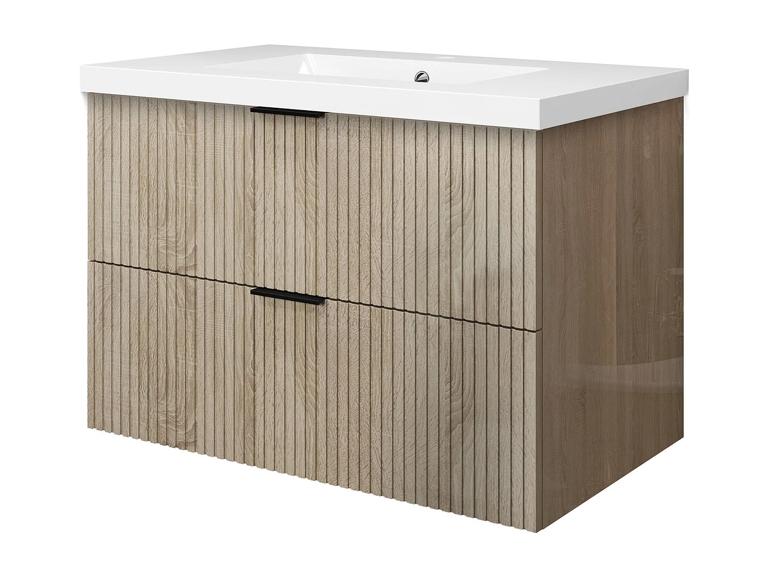 Meuble de salle de bain suspendu Strié Brillant 80cm avec simple vasque + 2 tiroirs, Chêne