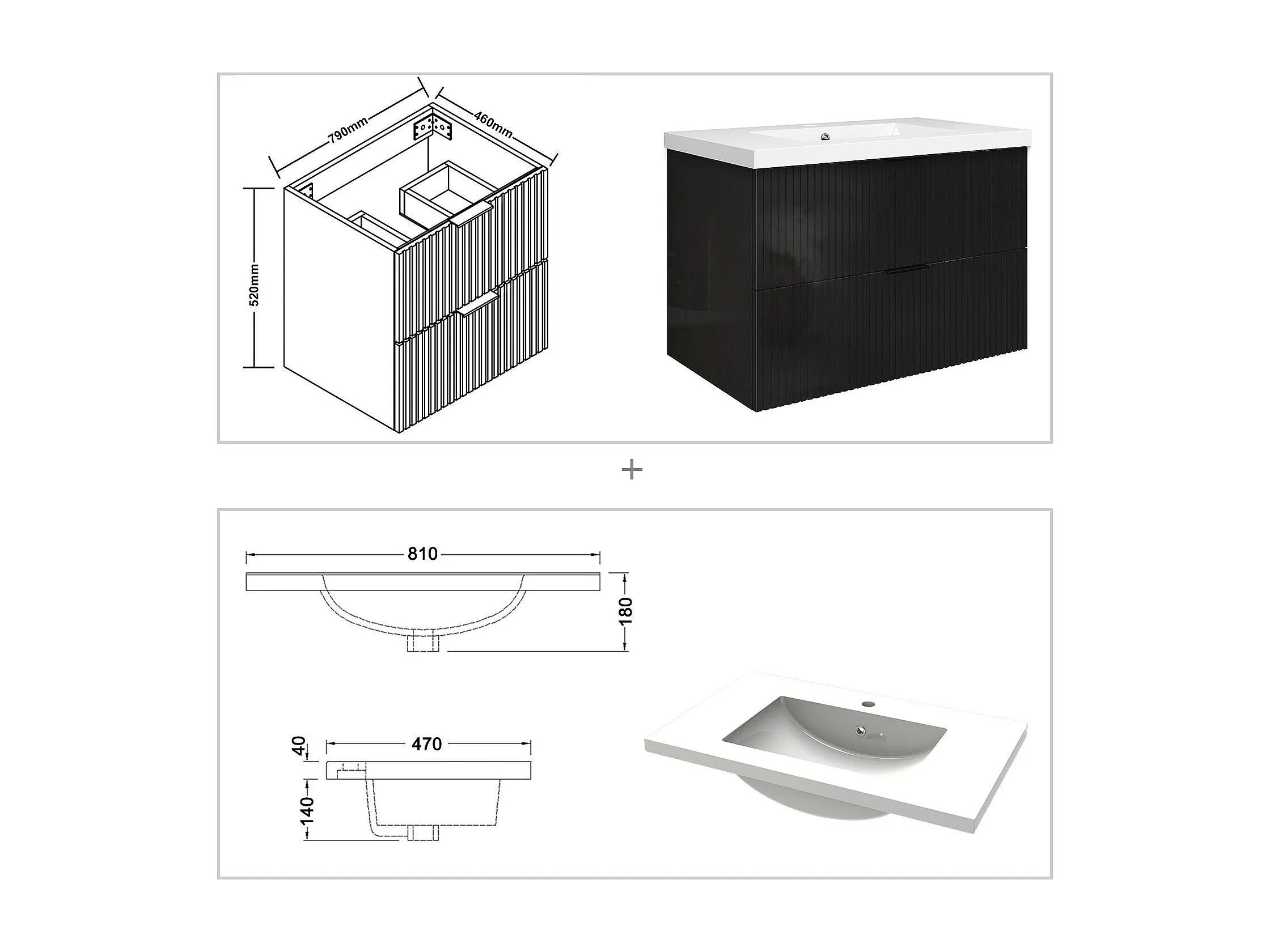 Meuble de salle de bain suspendu Strié Brillant 80cm avec simple vasque + 2 tiroirs, Noir
