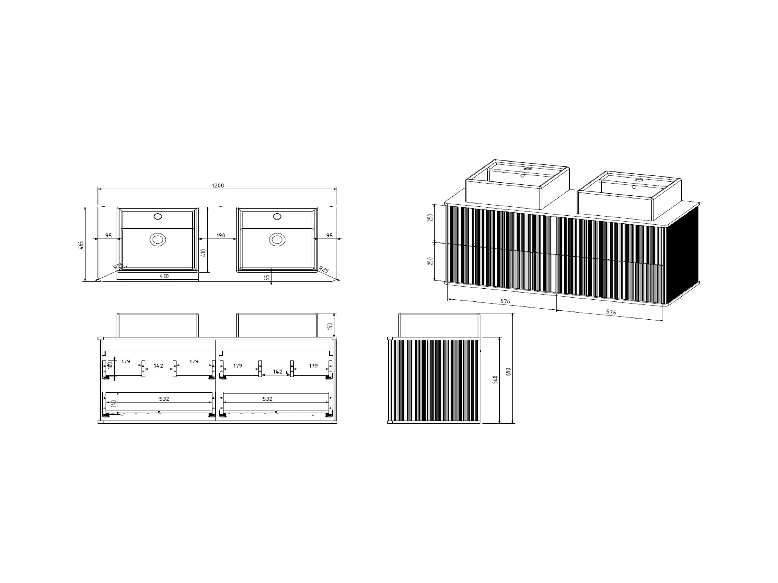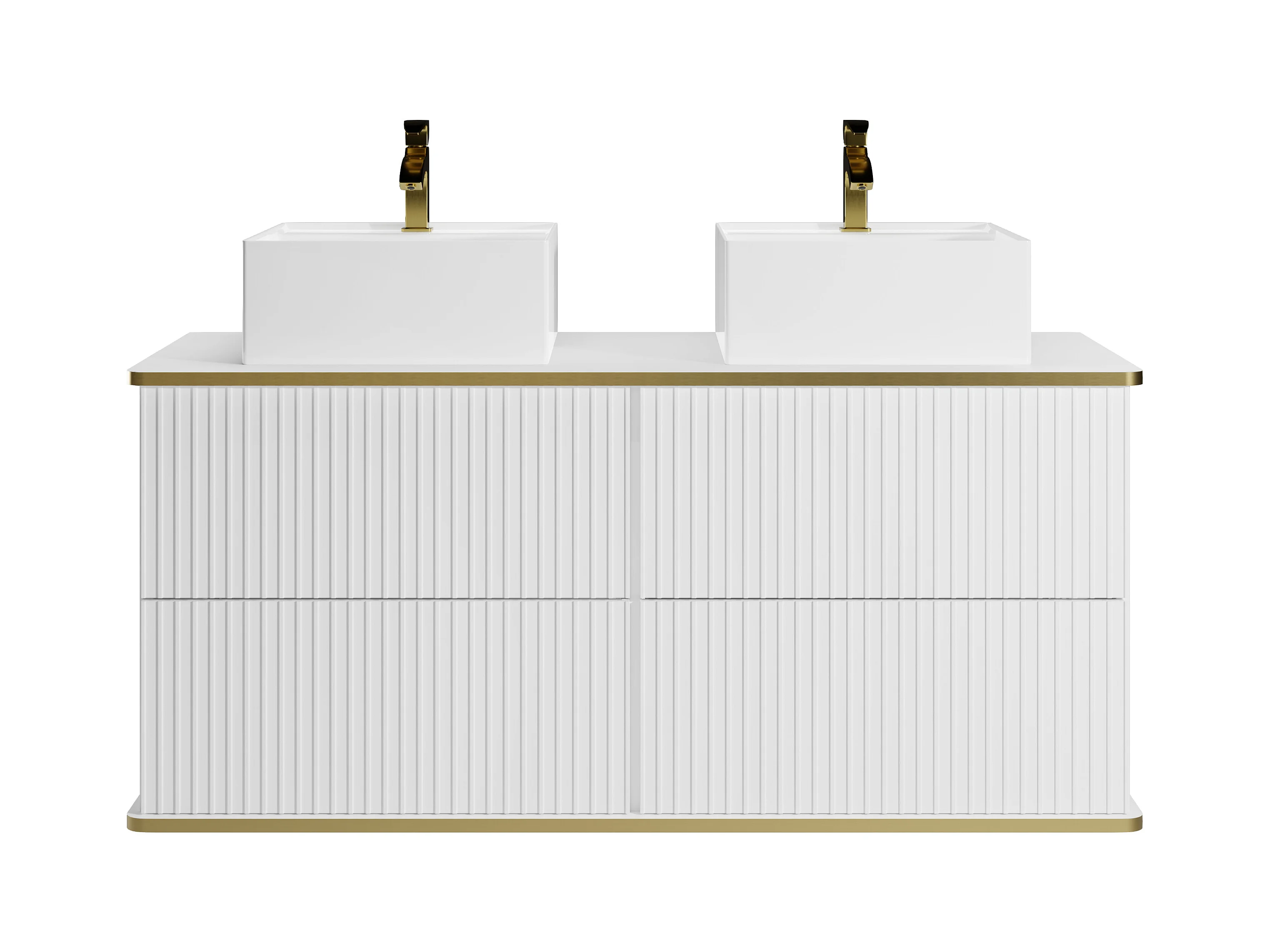 Meuble de salle de bain suspendu strié liseré doré avec double vasque à poser carrée - Blanc - 120 cm - KELIZA