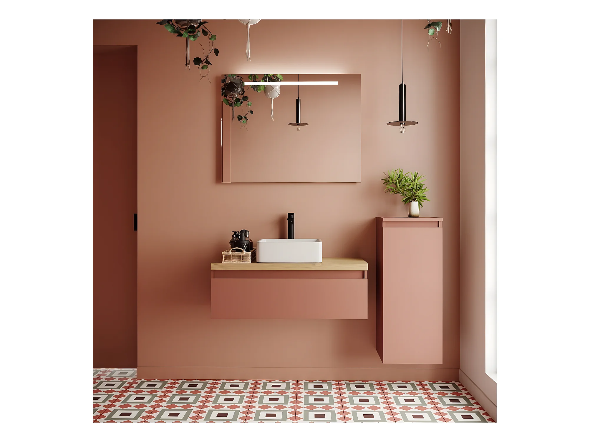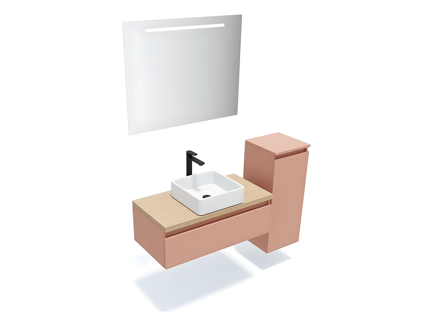 Meuble de salle de bain suspendu vasque à poser 90cm 1 tiroir Abricot + miroir + colonne ouverture droite - Hudson