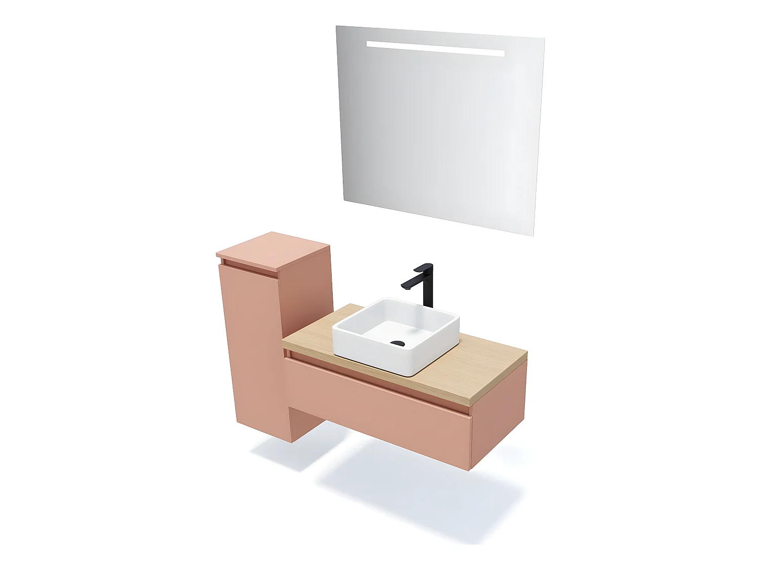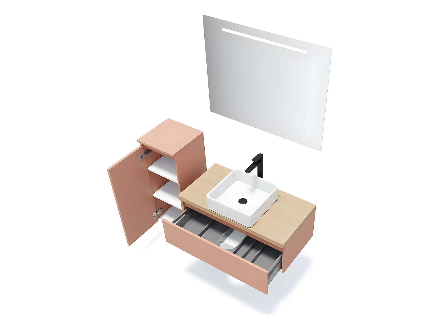 Meuble de salle de bain suspendu vasque à poser 90cm 1 tiroir Abricot + miroir + colonne ouverture gauche - Hudson