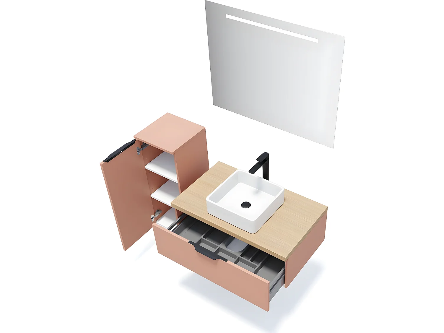Meuble de salle de bain suspendu vasque à poser 90cm 1 tiroir Abricot + miroir + colonne ouverture gauche - Soho