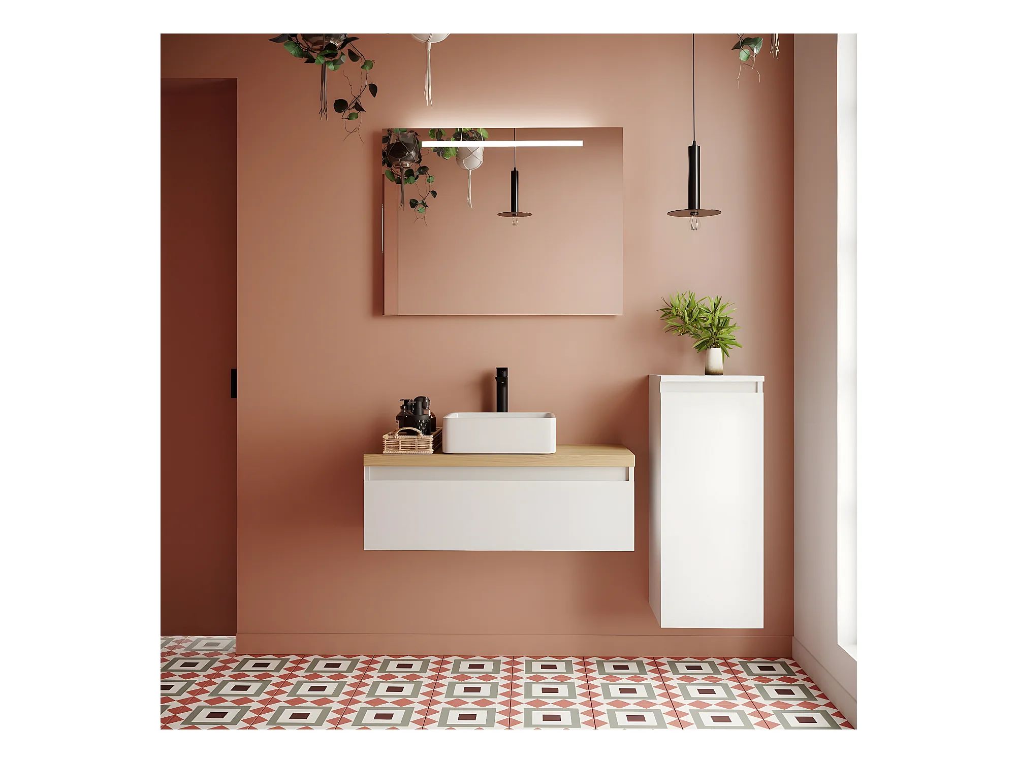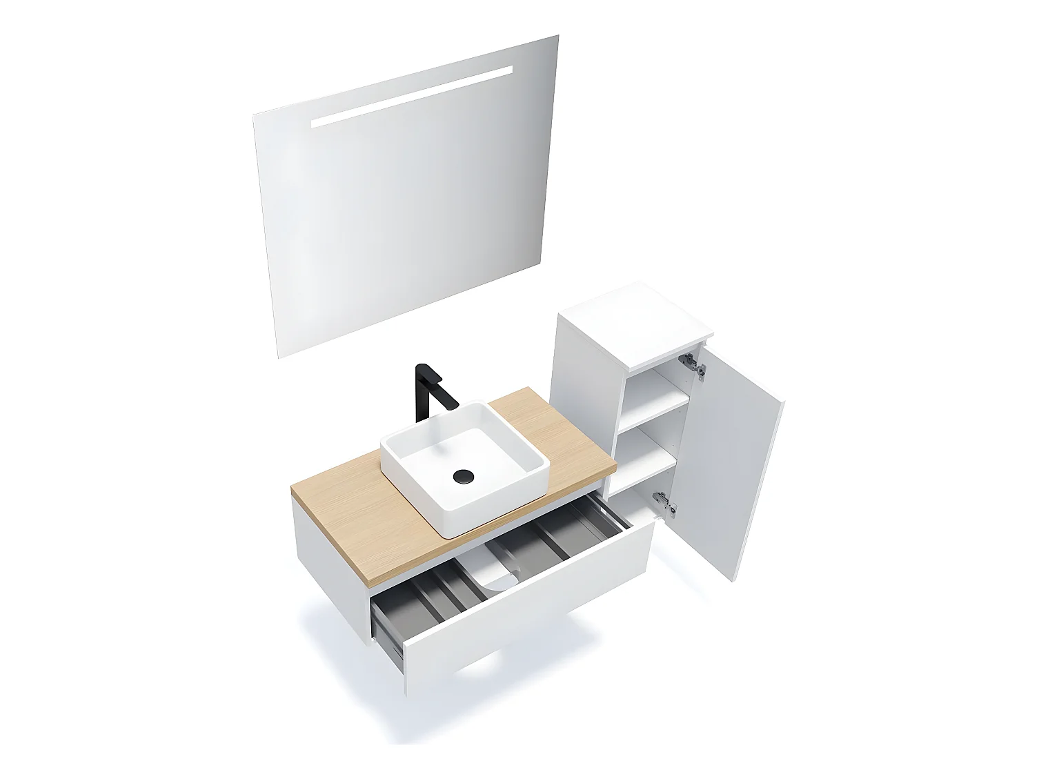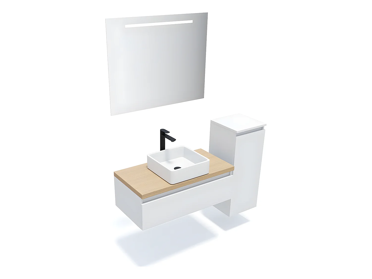 Meuble de salle de bain suspendu vasque à poser 90cm 1 tiroir Blanc + miroir + colonne ouverture droite - Hudson