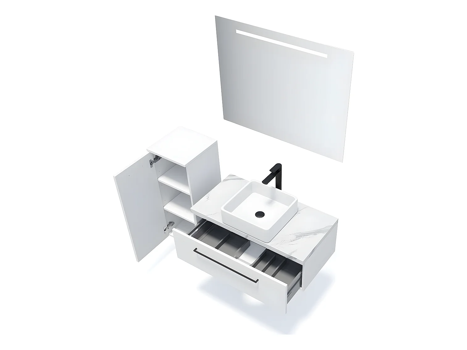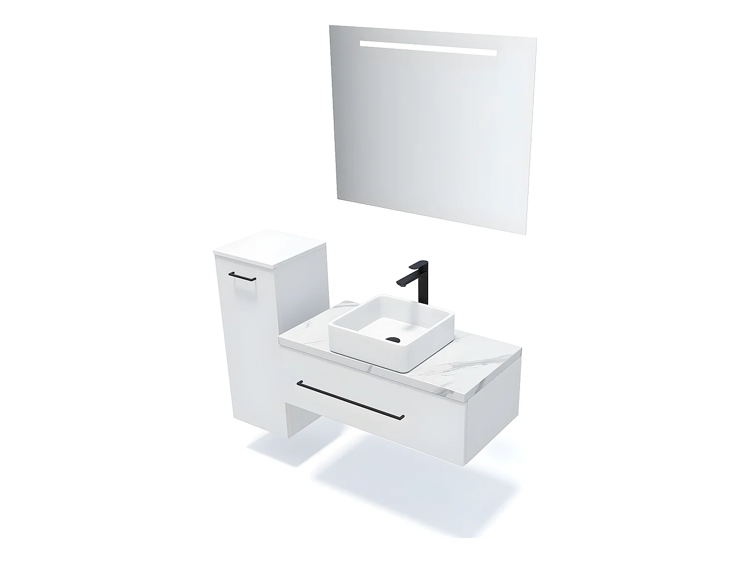 Meuble de salle de bain suspendu vasque à poser 90cm 1 tiroir Blanc + miroir + colonne ouverture gauche - Glasgow