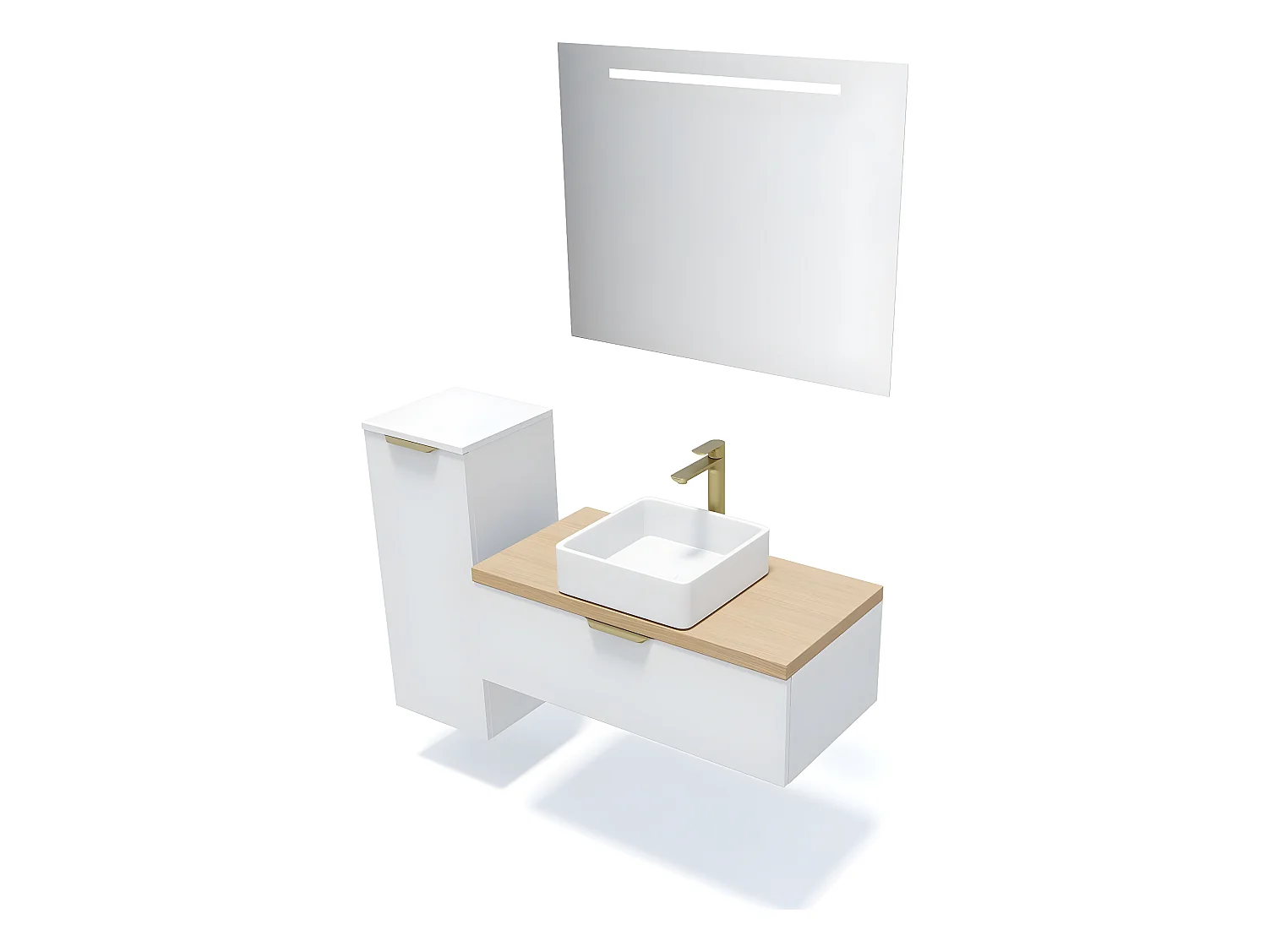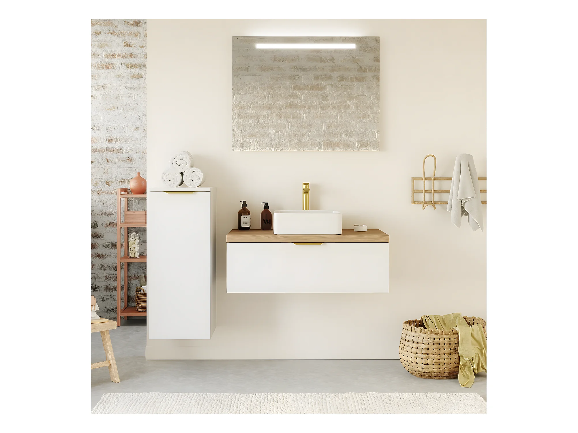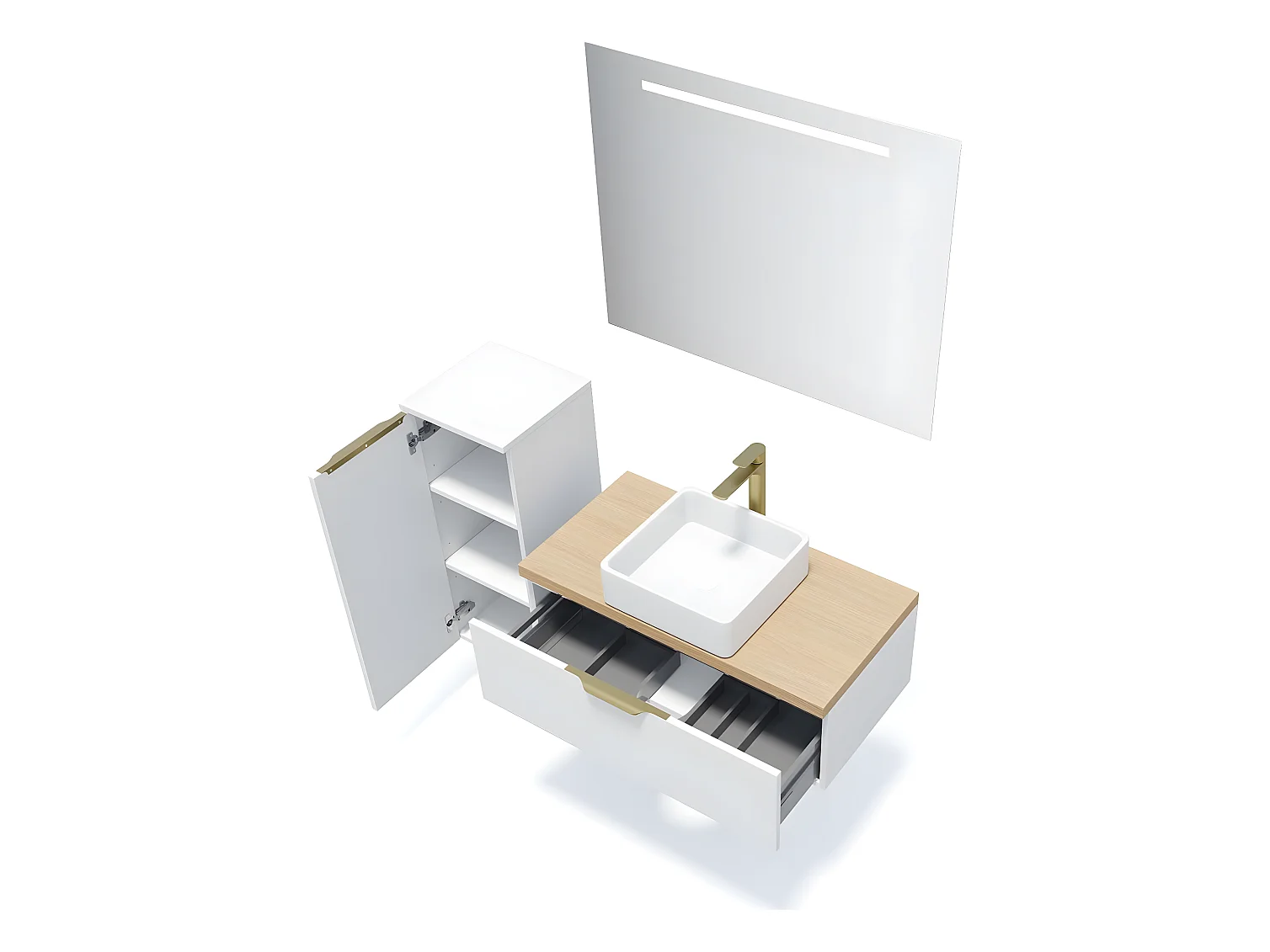 Meuble de salle de bain suspendu vasque à poser 90cm 1 tiroir Blanc + miroir + colonne ouverture gauche - Venice