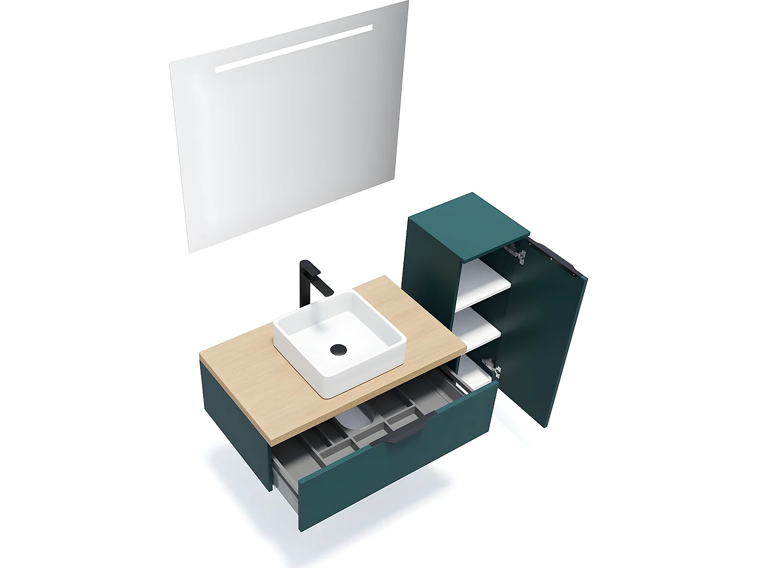 Meuble de salle de bain suspendu vasque à poser 90cm 1 tiroir Bleu + miroir + colonne ouverture droite - Soho