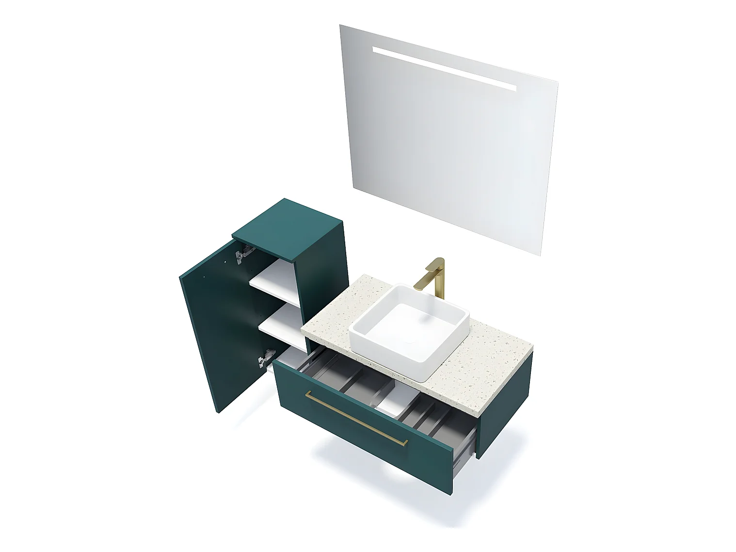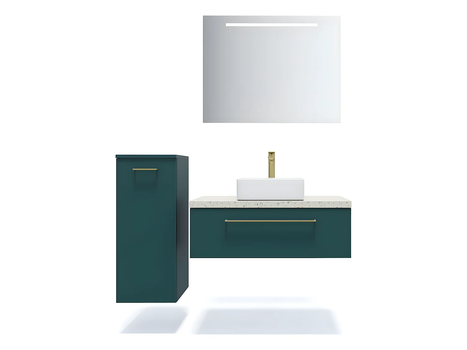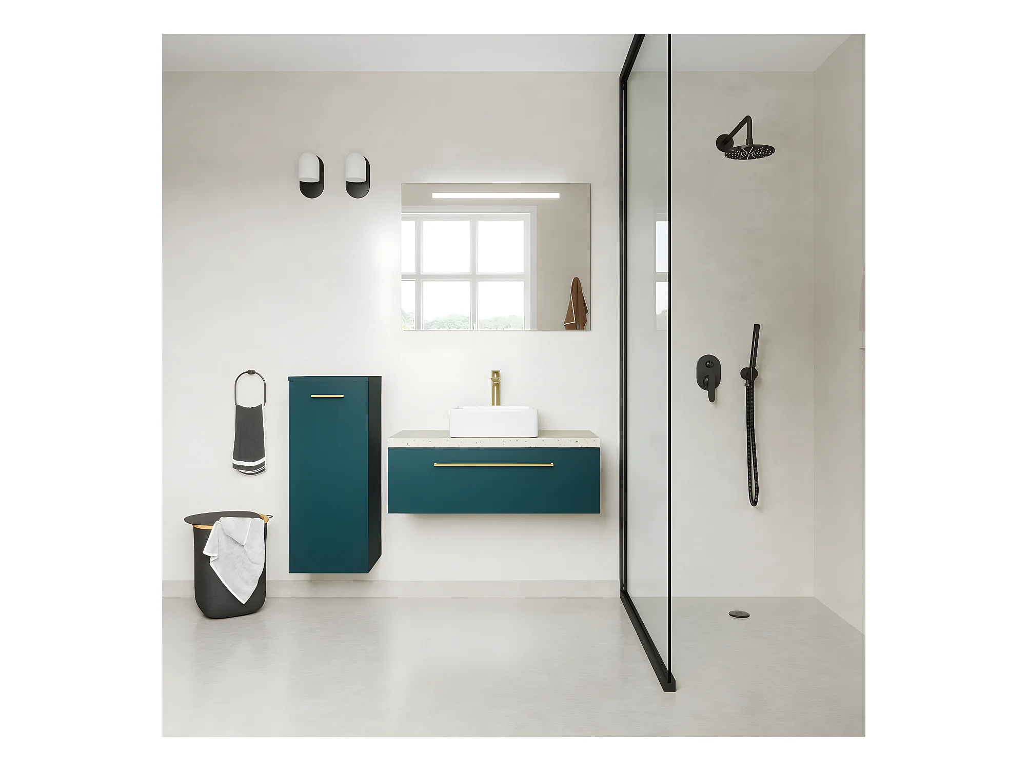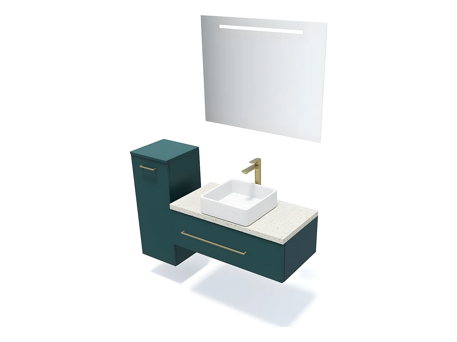Meuble de salle de bain suspendu vasque à poser 90cm 1 tiroir Bleu + miroir + colonne ouverture gauche - Glasgow