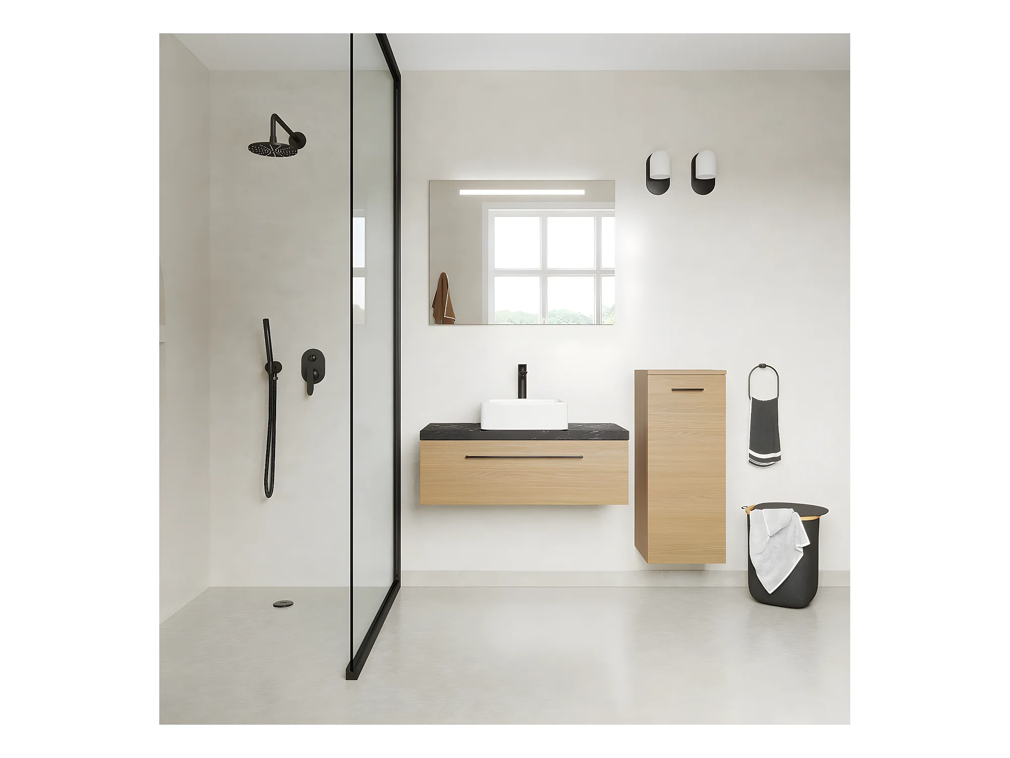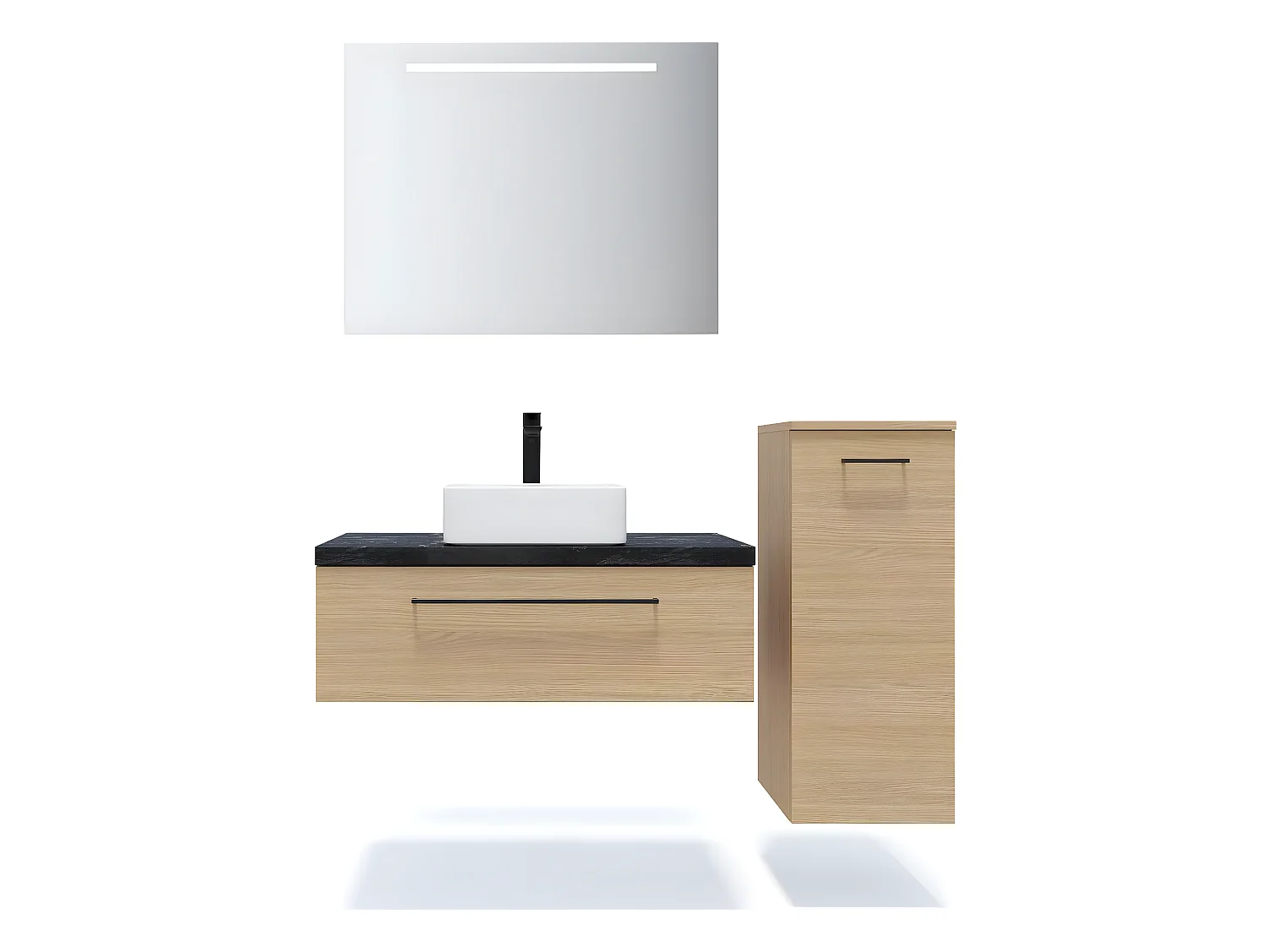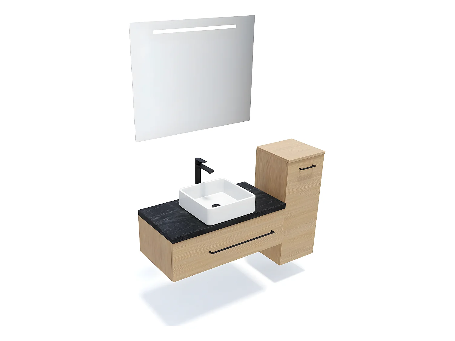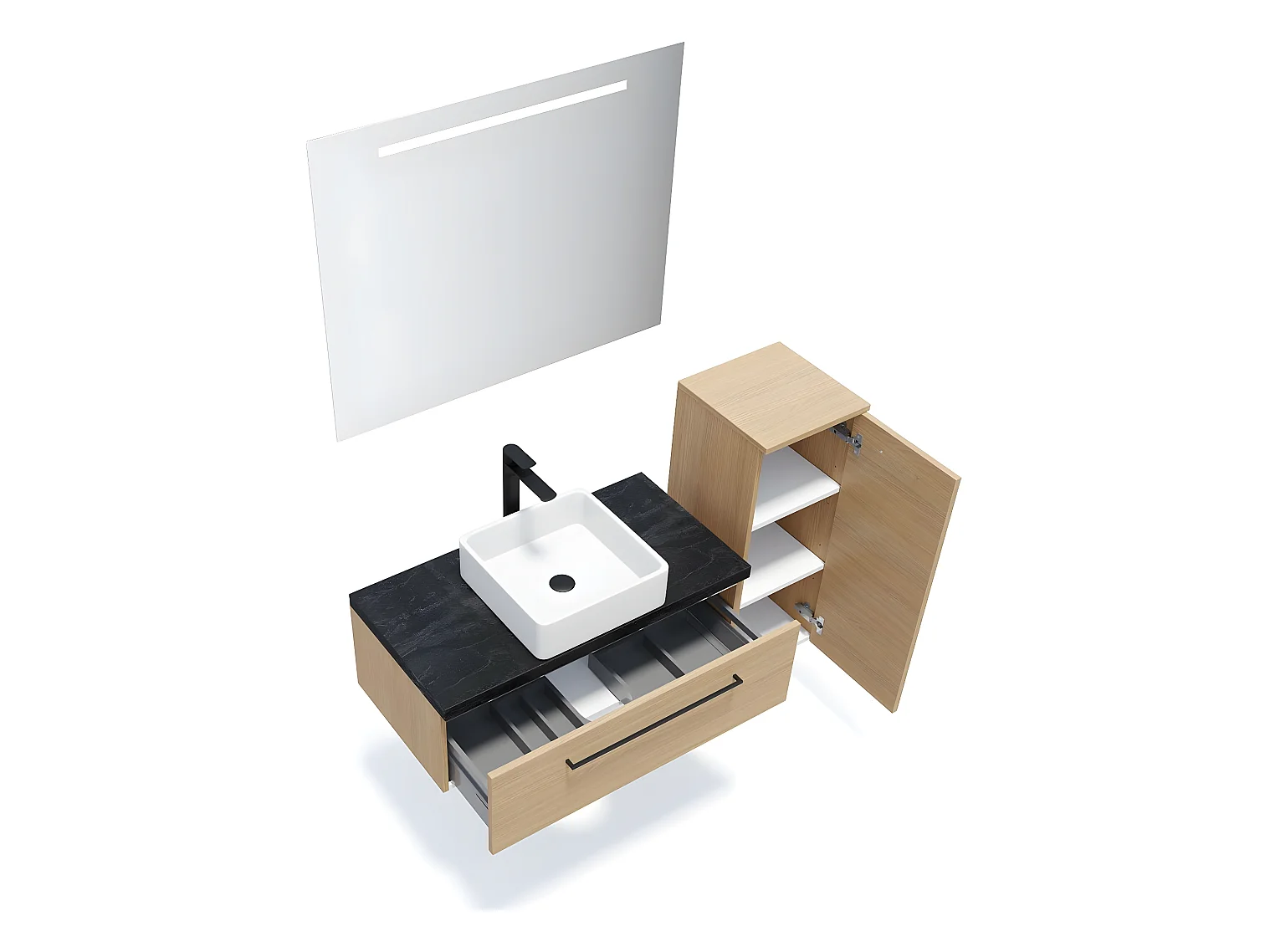 Meuble de salle de bain suspendu vasque à poser 90cm 1 tiroir Chêne clair + miroir + colonne ouverture droite - Glasgow