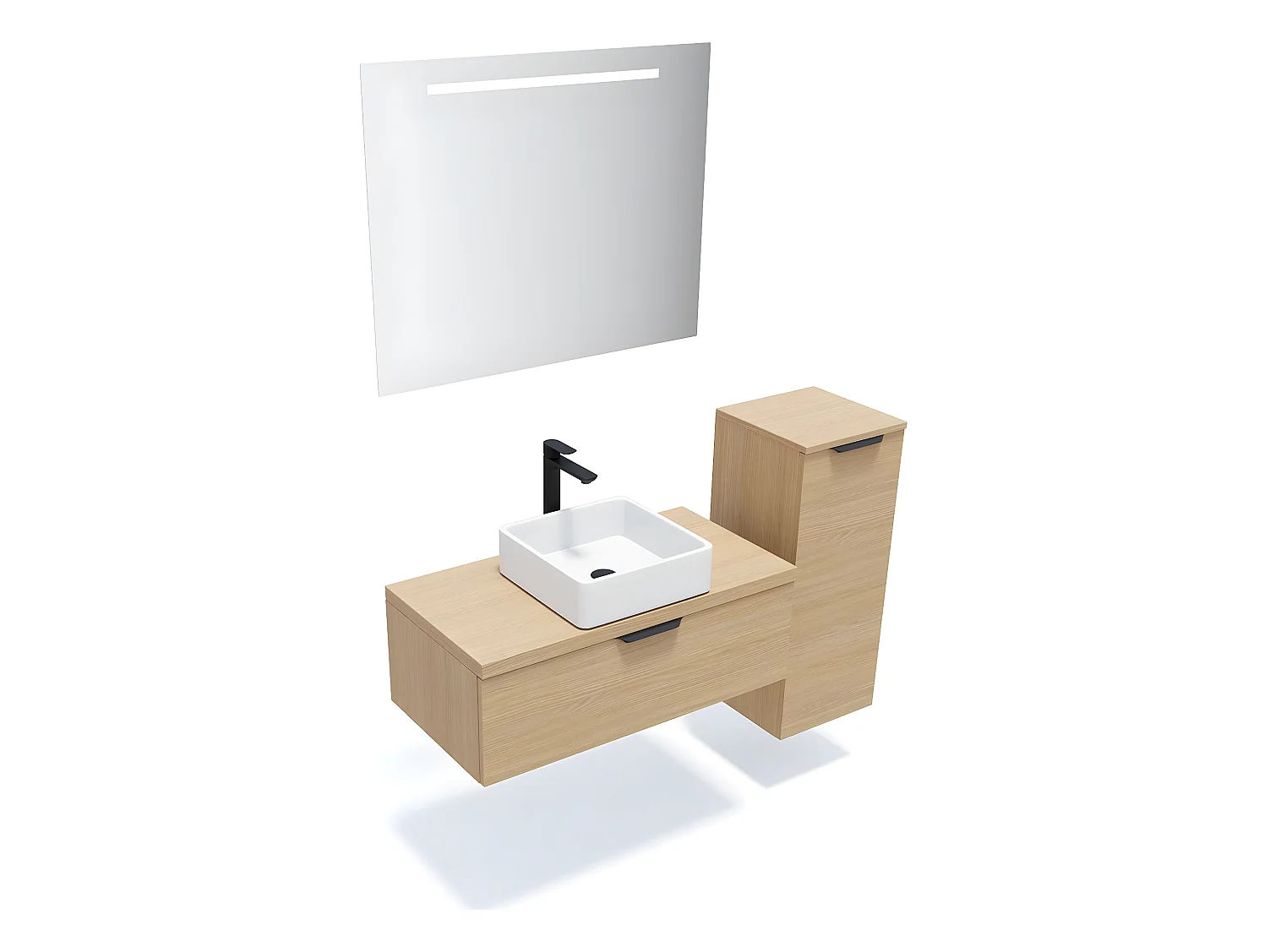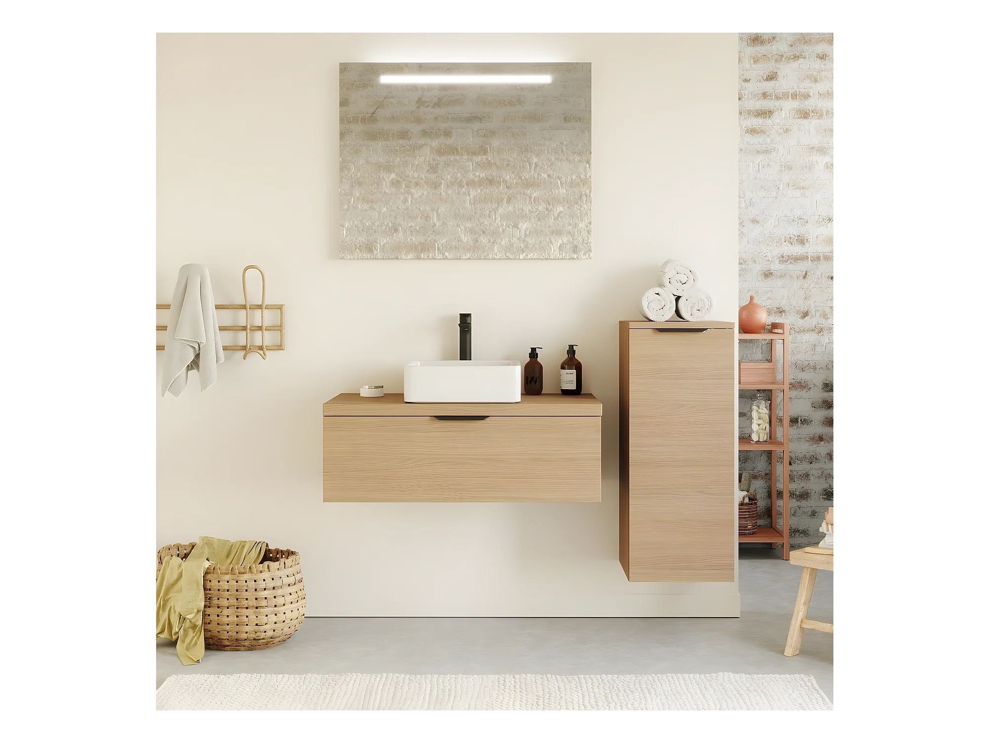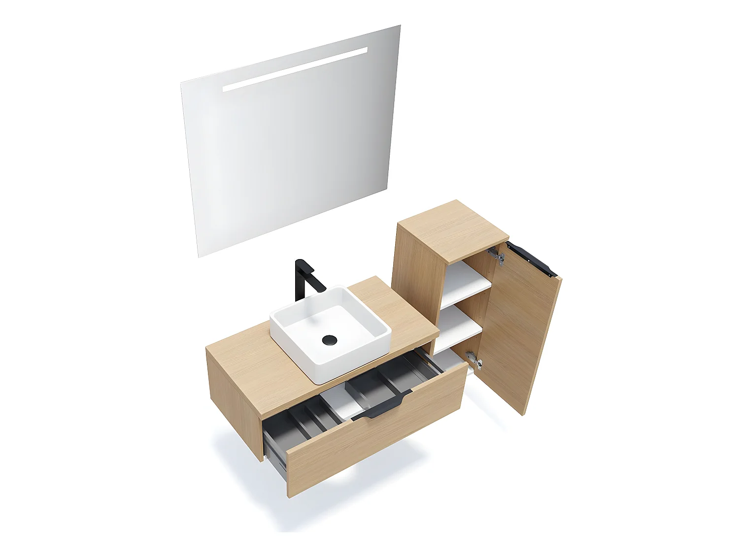 Meuble de salle de bain suspendu vasque à poser 90cm 1 tiroir Chêne clair + miroir + colonne ouverture droite - Venice