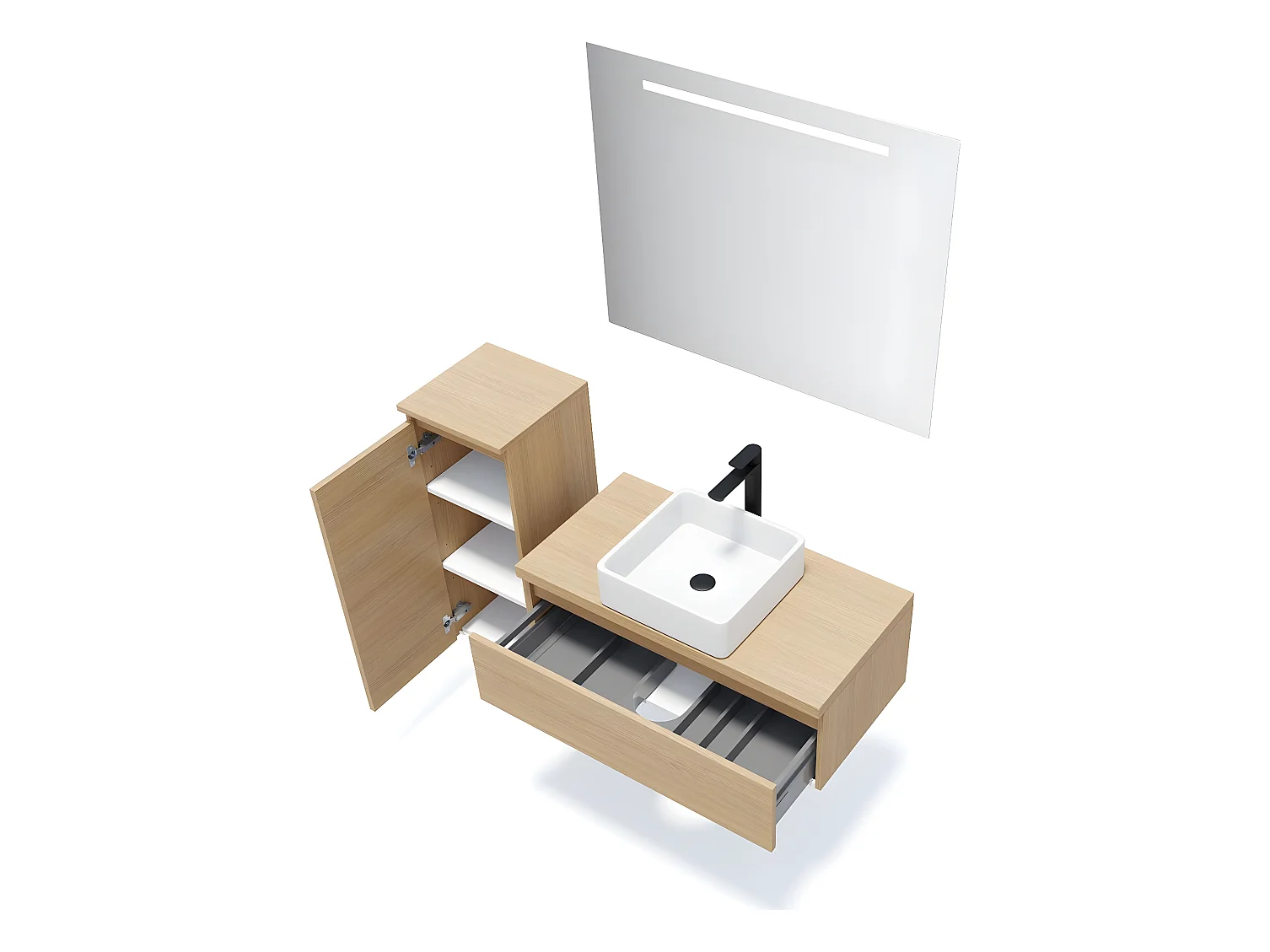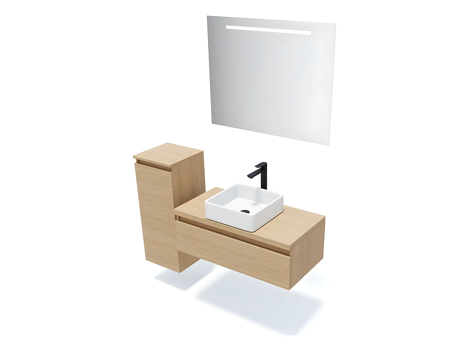 Meuble de salle de bain suspendu vasque à poser 90cm 1 tiroir Chêne clair + miroir + colonne ouverture gauche - Hudson