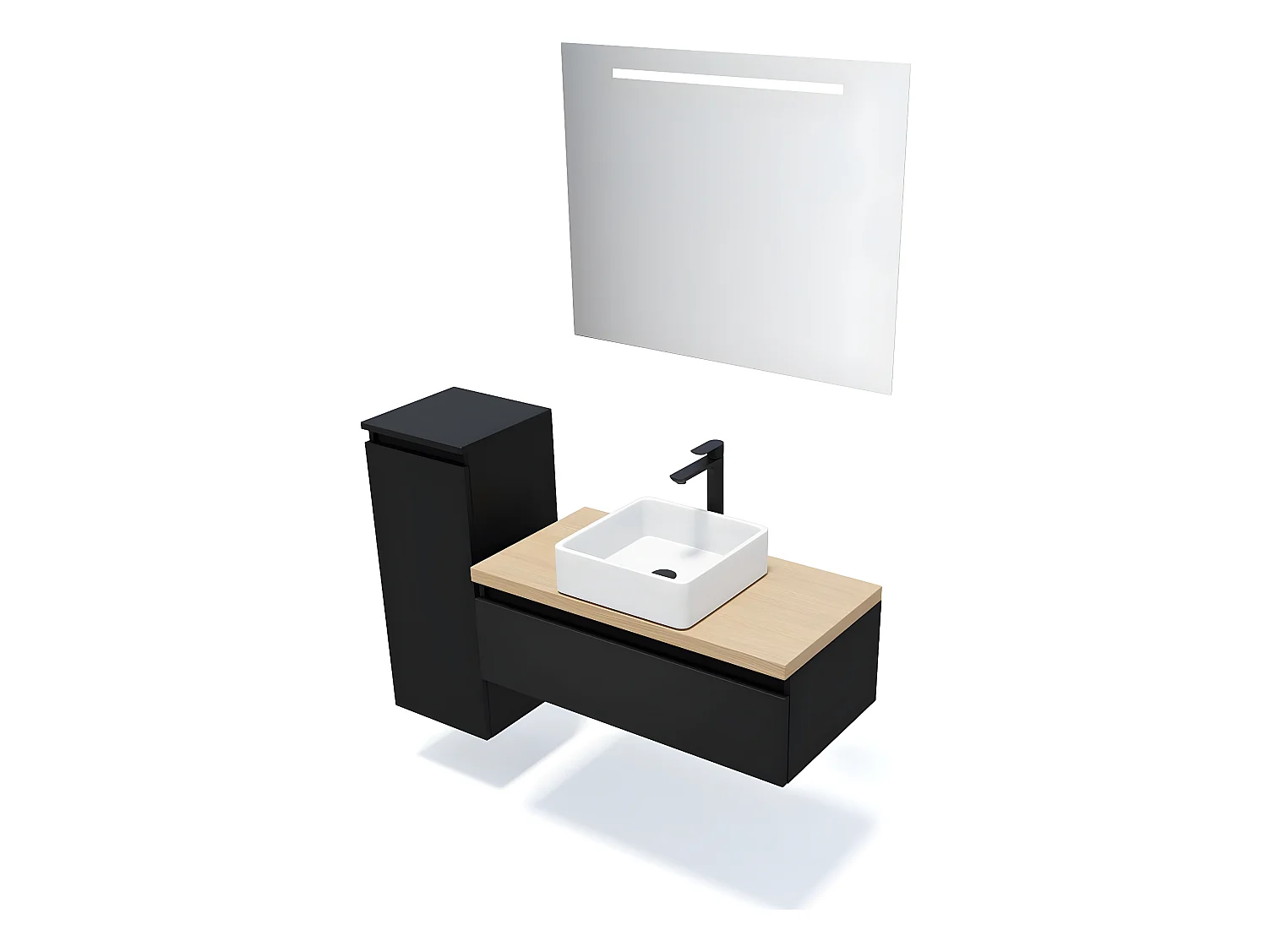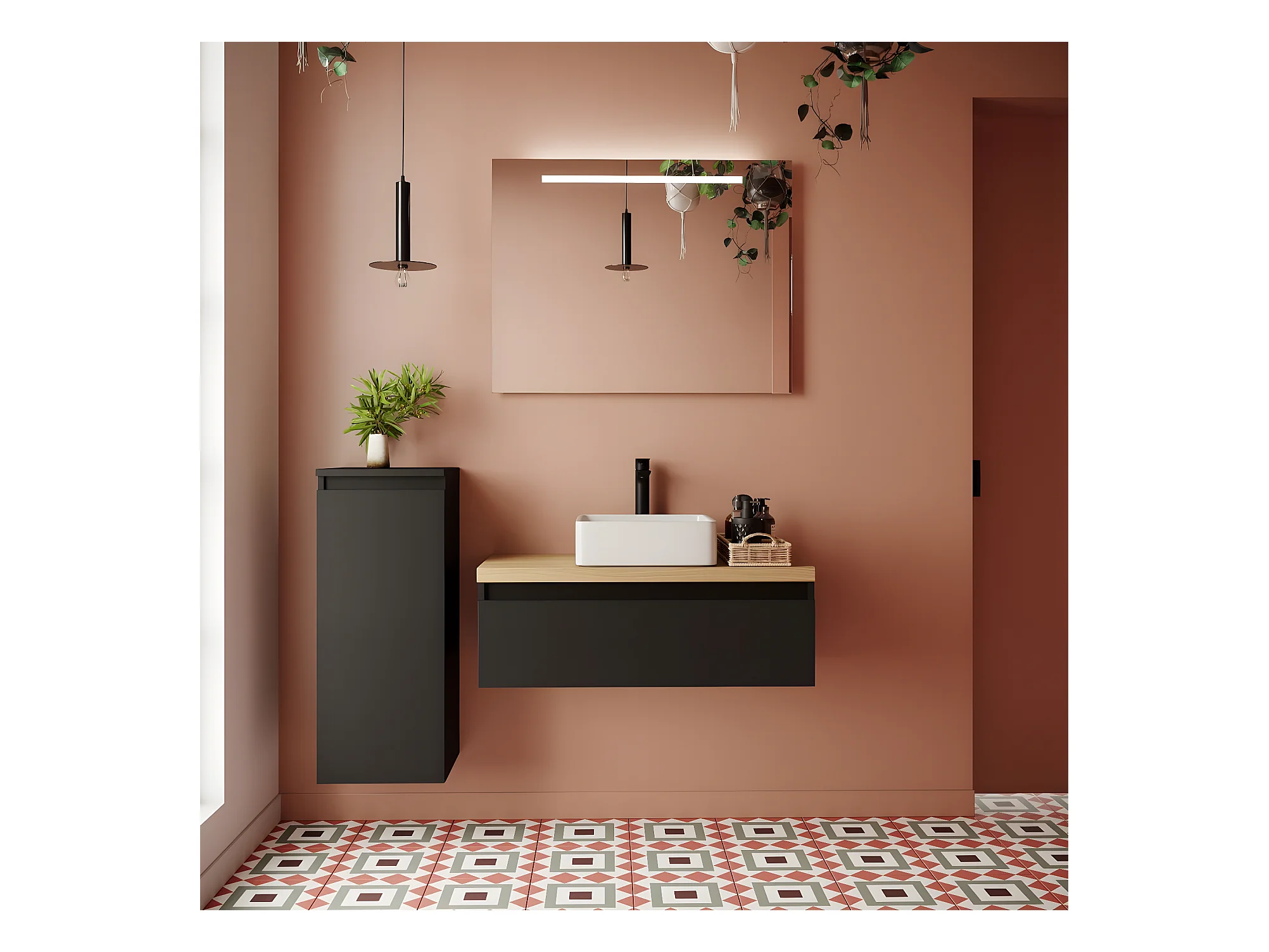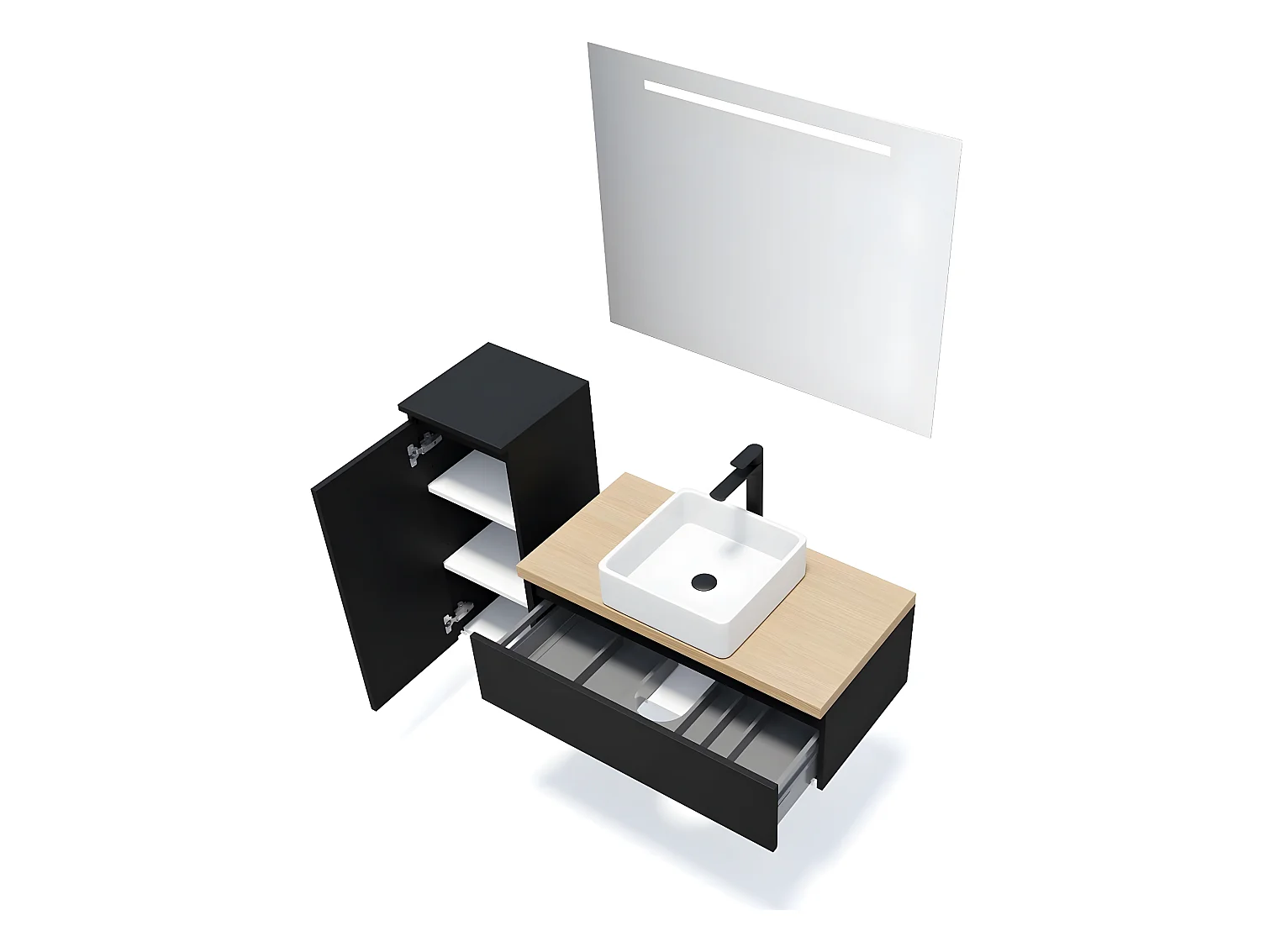 Meuble de salle de bain suspendu vasque à poser 90cm 1 tiroir Noir + miroir + colonne ouverture gauche - Hudson