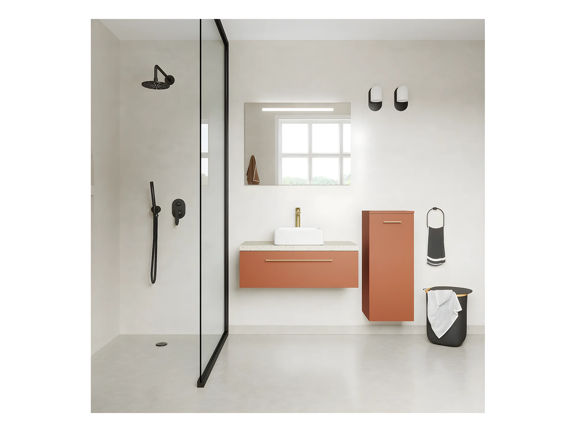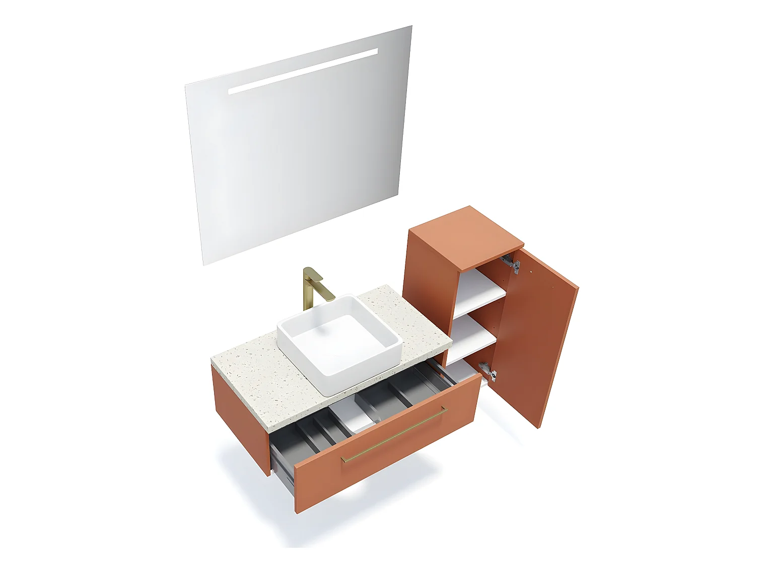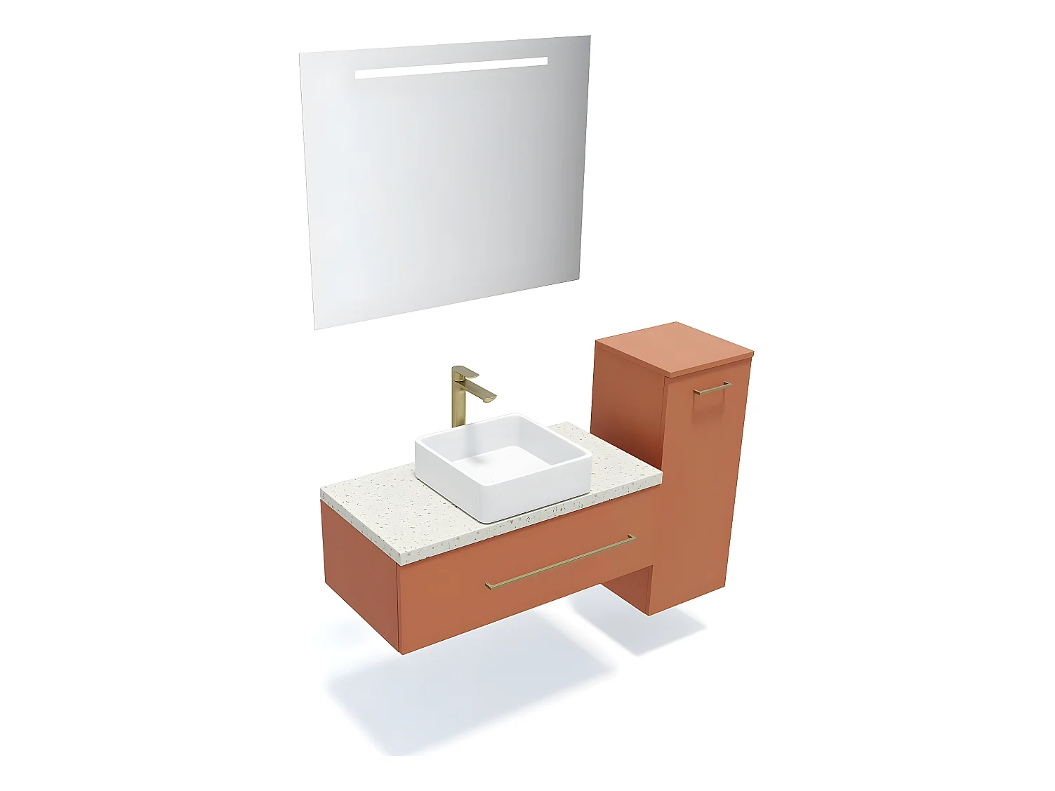 Meuble de salle de bain suspendu vasque à poser 90cm 1 tiroir Terracotta + miroir + colonne ouverture droite - Glasgow