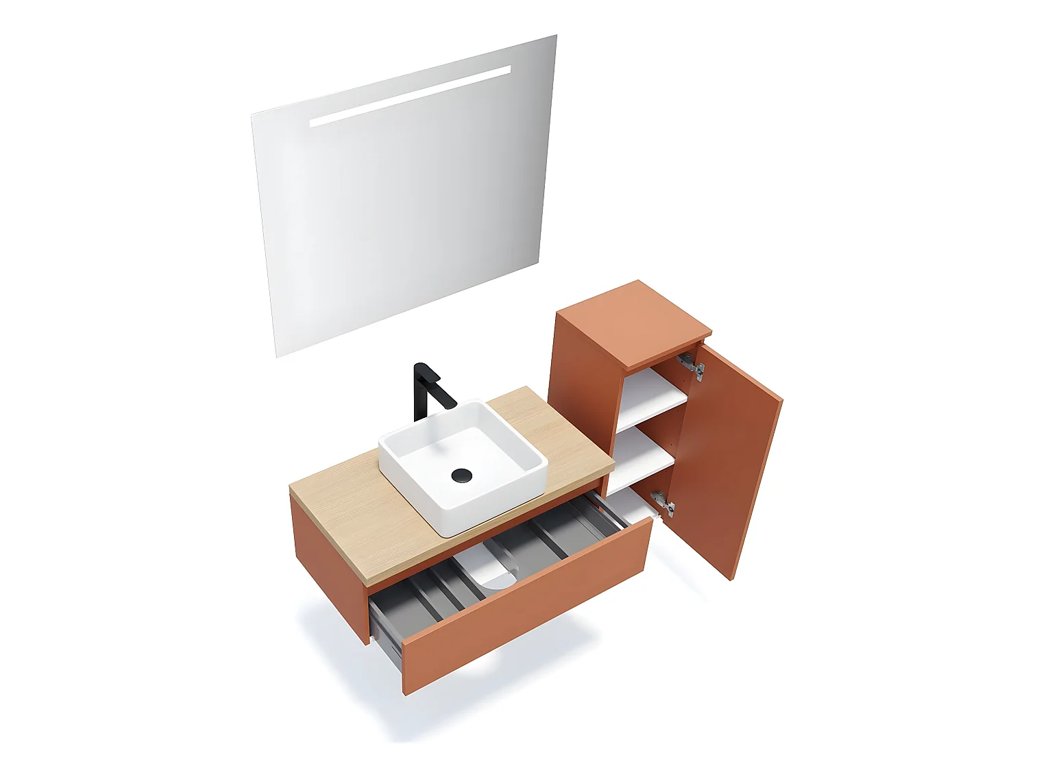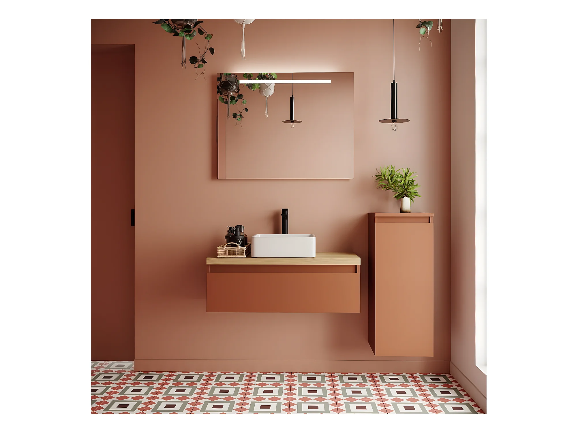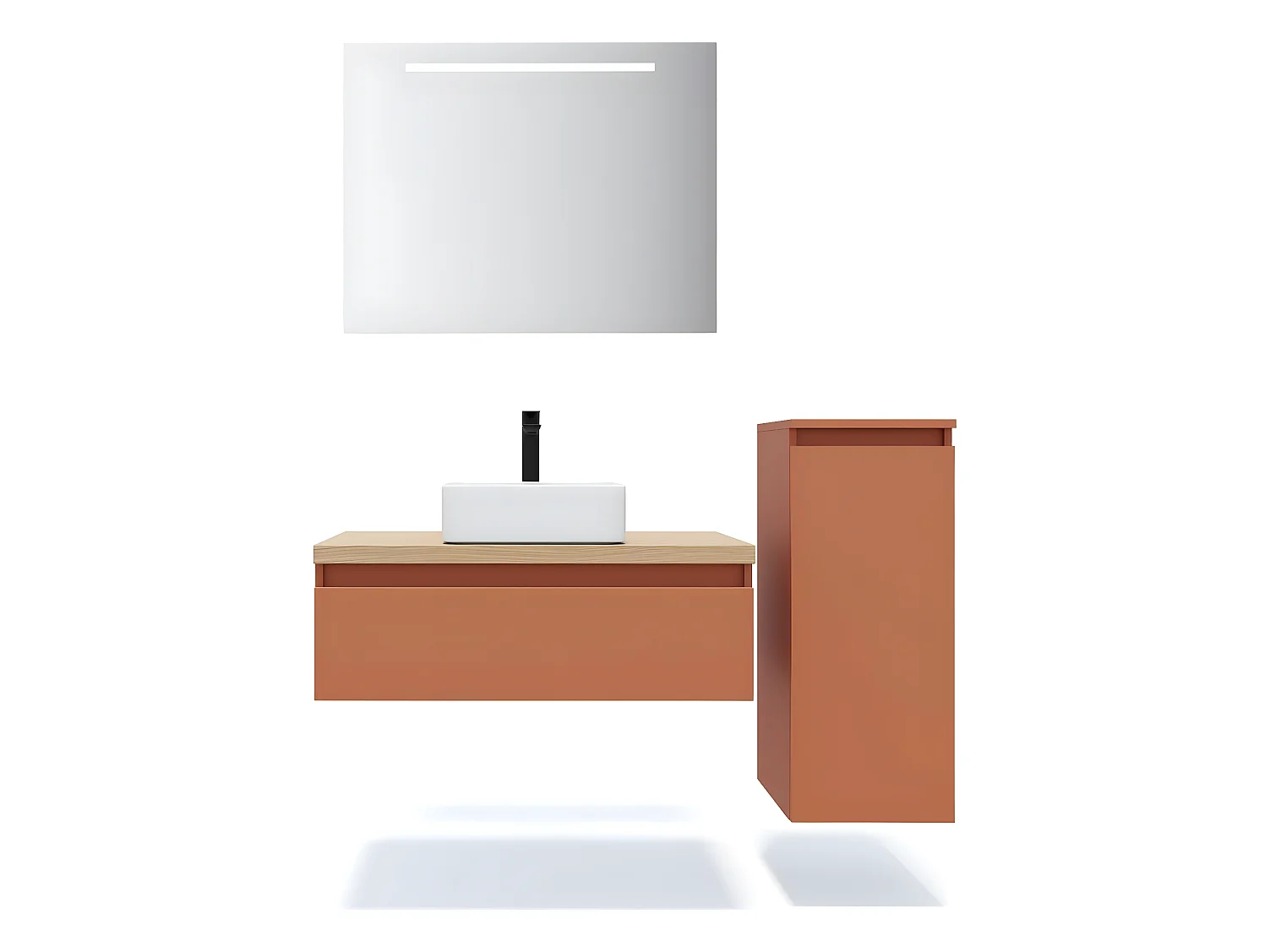 Meuble de salle de bain suspendu vasque à poser 90cm 1 tiroir Terracotta + miroir + colonne ouverture droite - Hudson