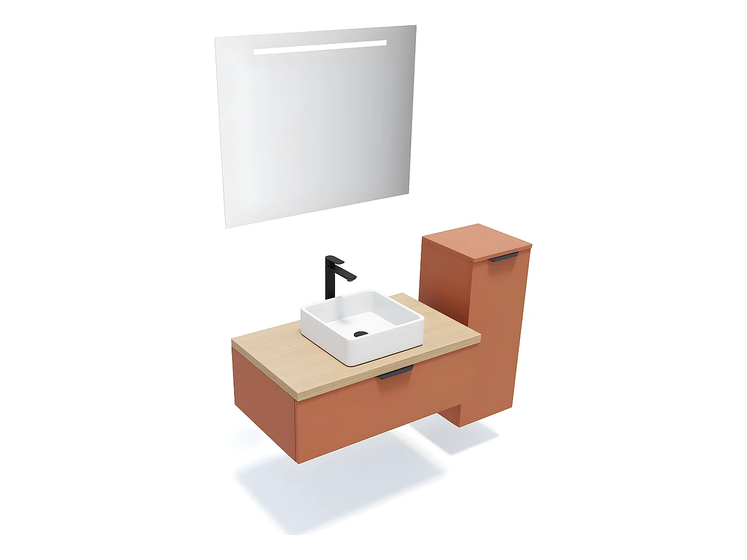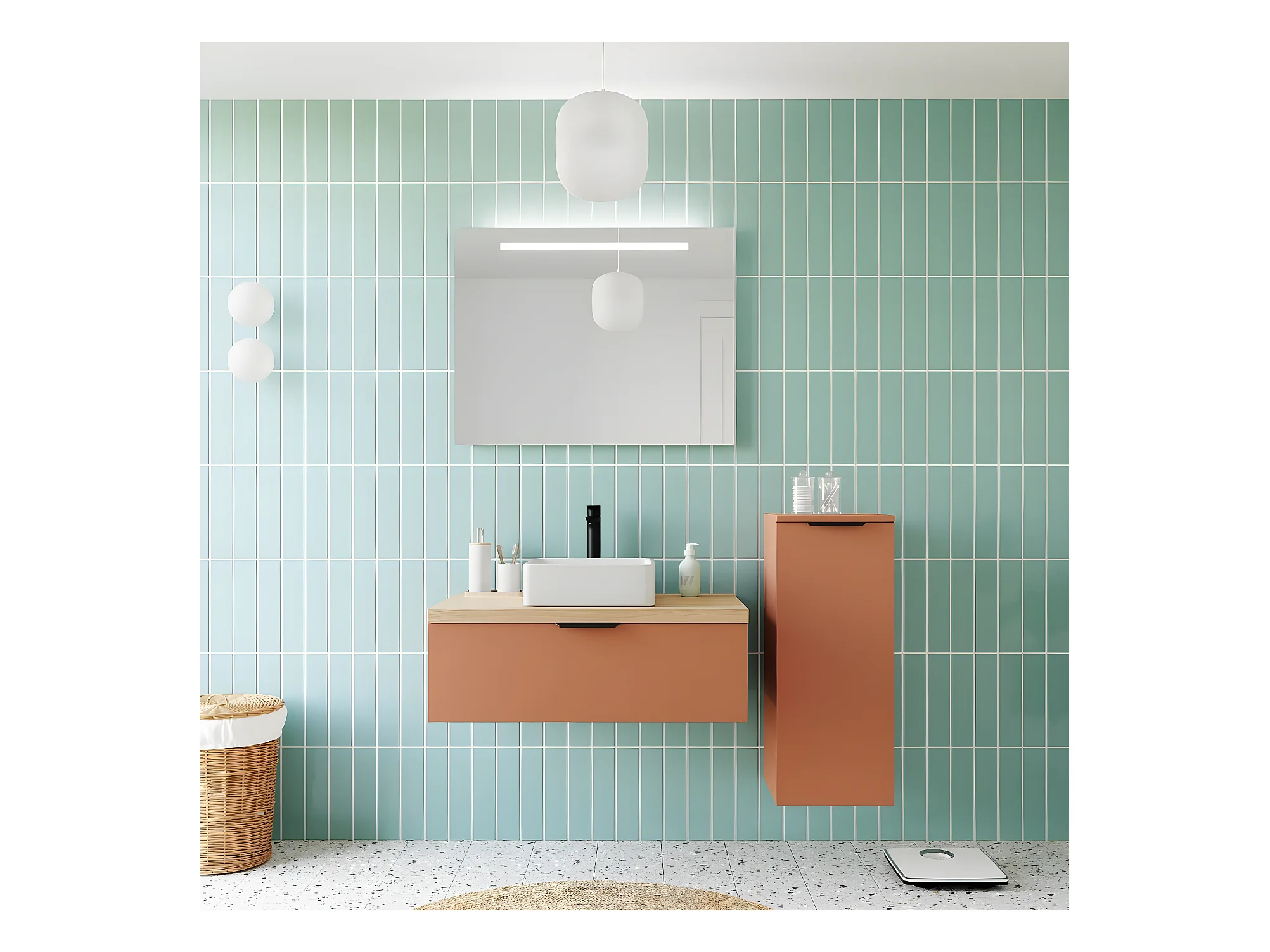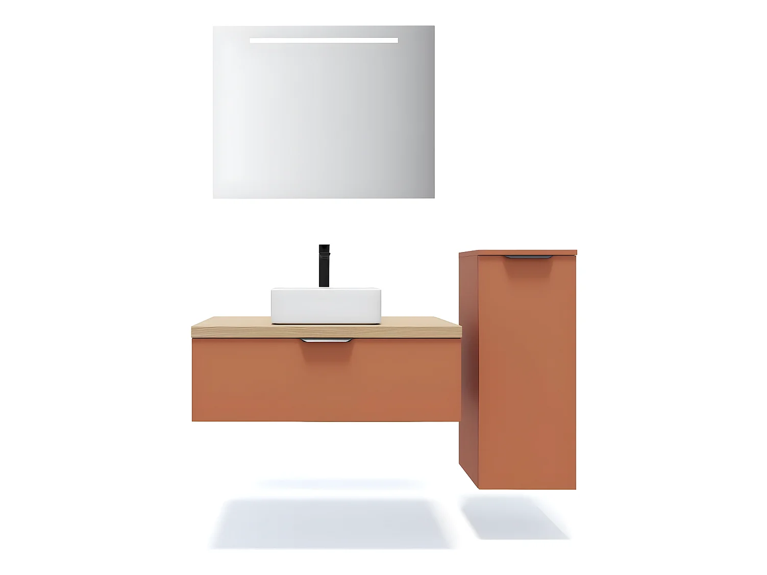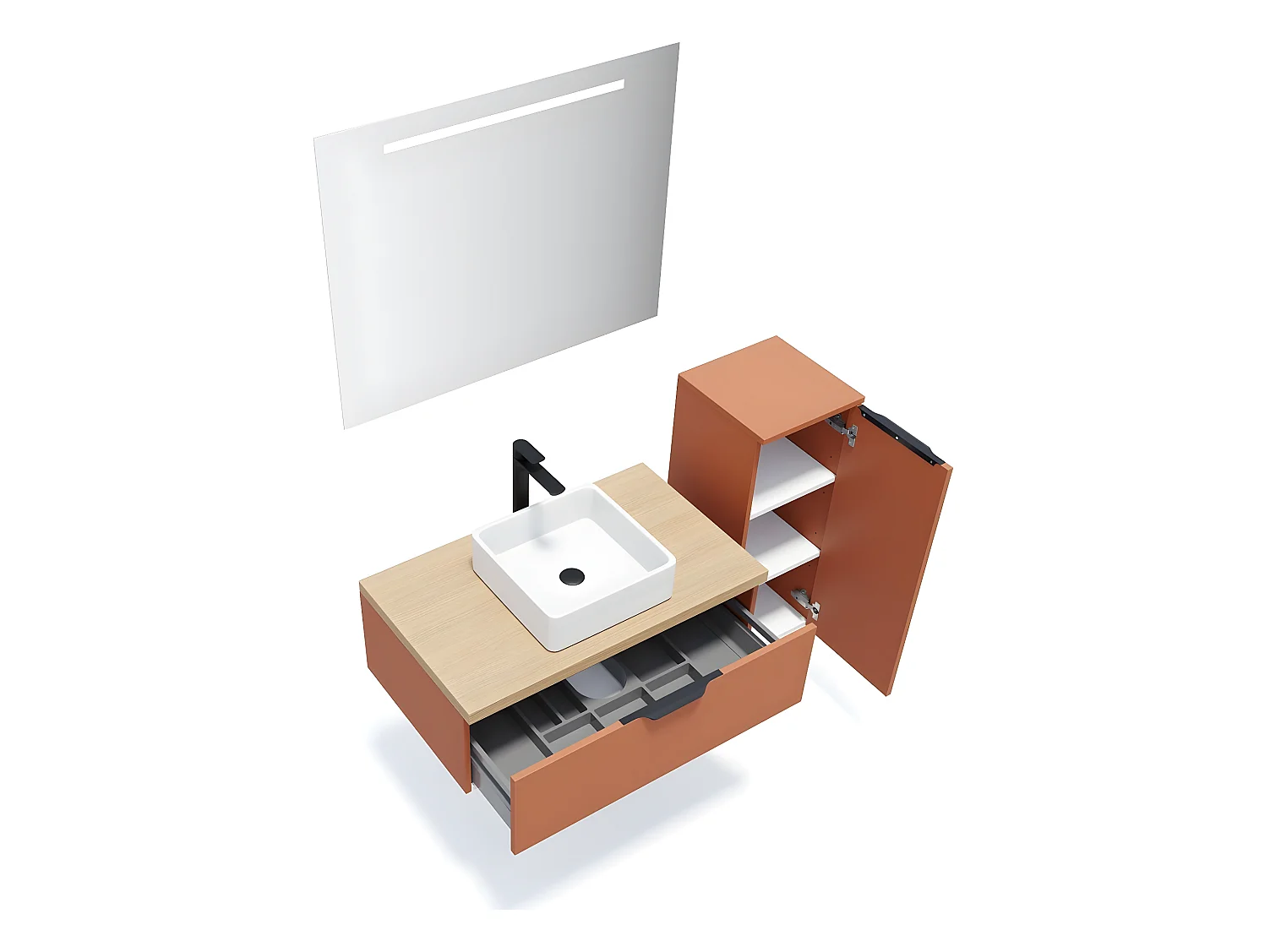 Meuble de salle de bain suspendu vasque à poser 90cm 1 tiroir Terracotta + miroir + colonne ouverture droite - Soho