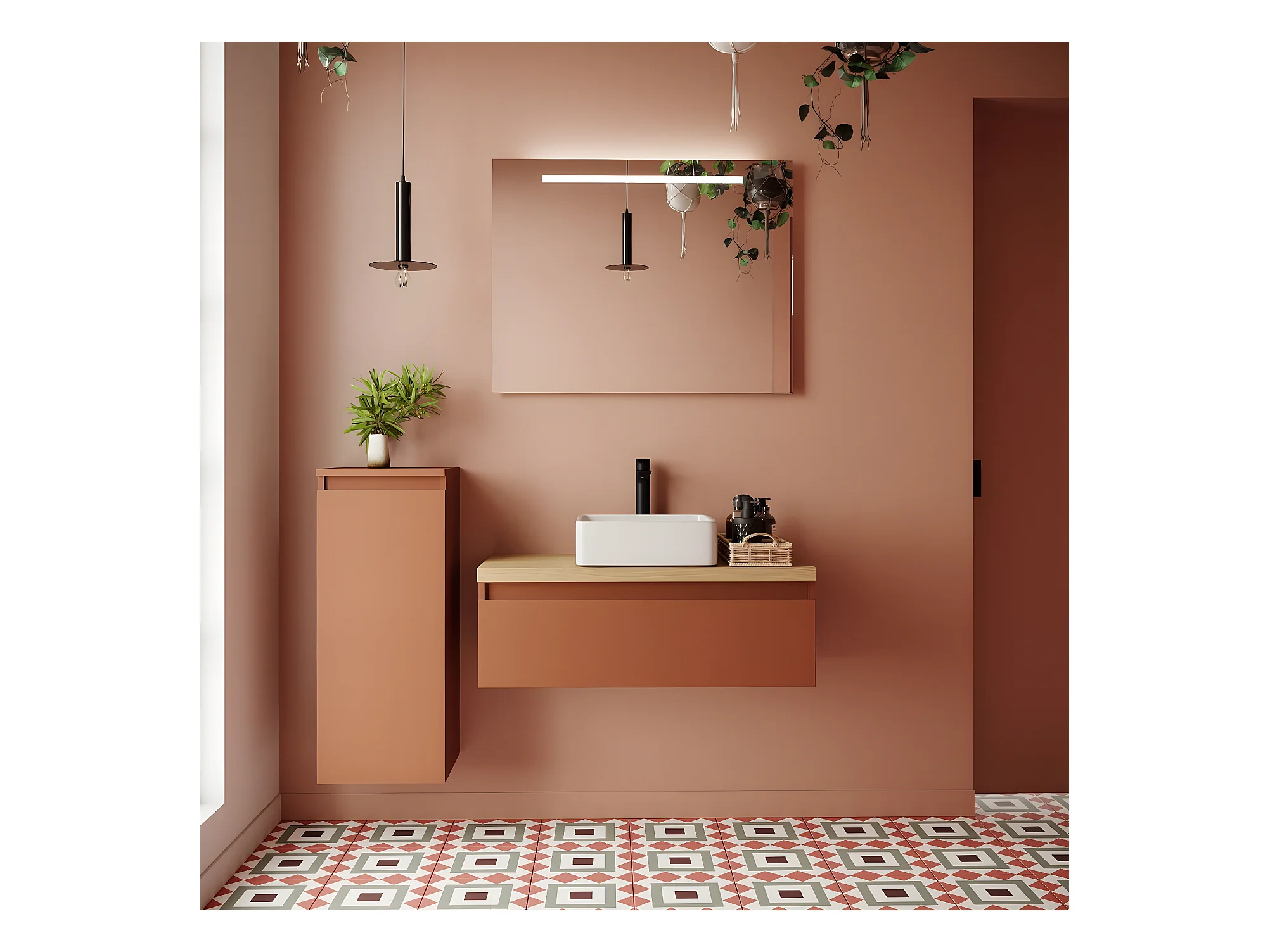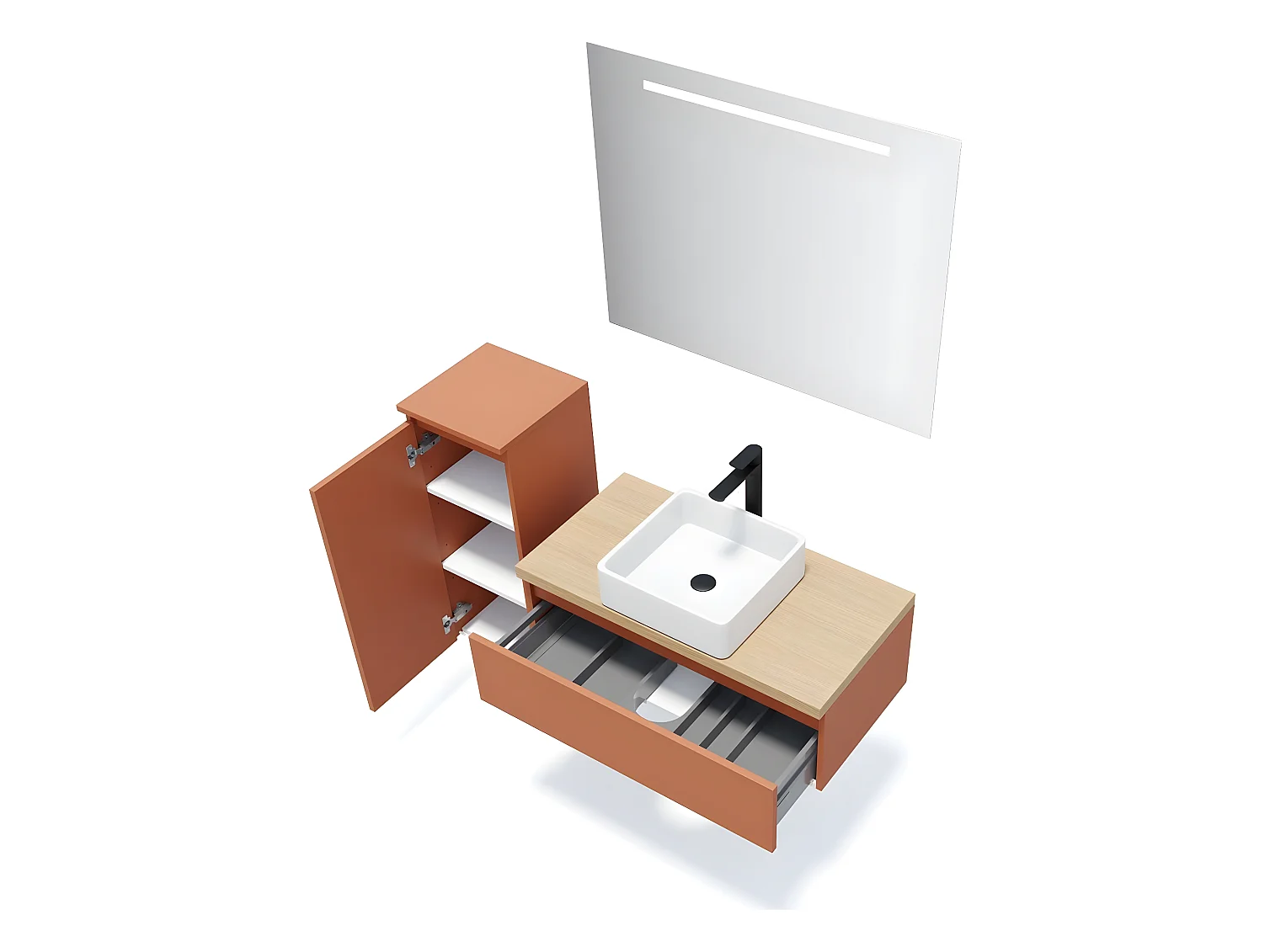 Meuble de salle de bain suspendu vasque à poser 90cm 1 tiroir Terracotta + miroir + colonne ouverture gauche - Hudson