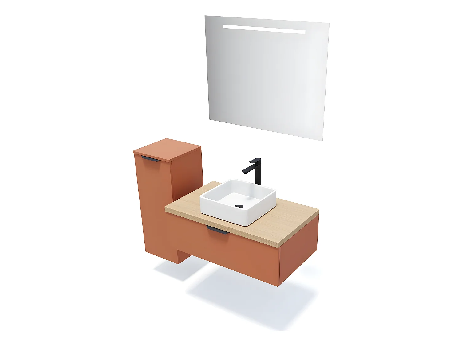 Meuble de salle de bain suspendu vasque à poser 90cm 1 tiroir Terracotta + miroir + colonne ouverture gauche - Soho