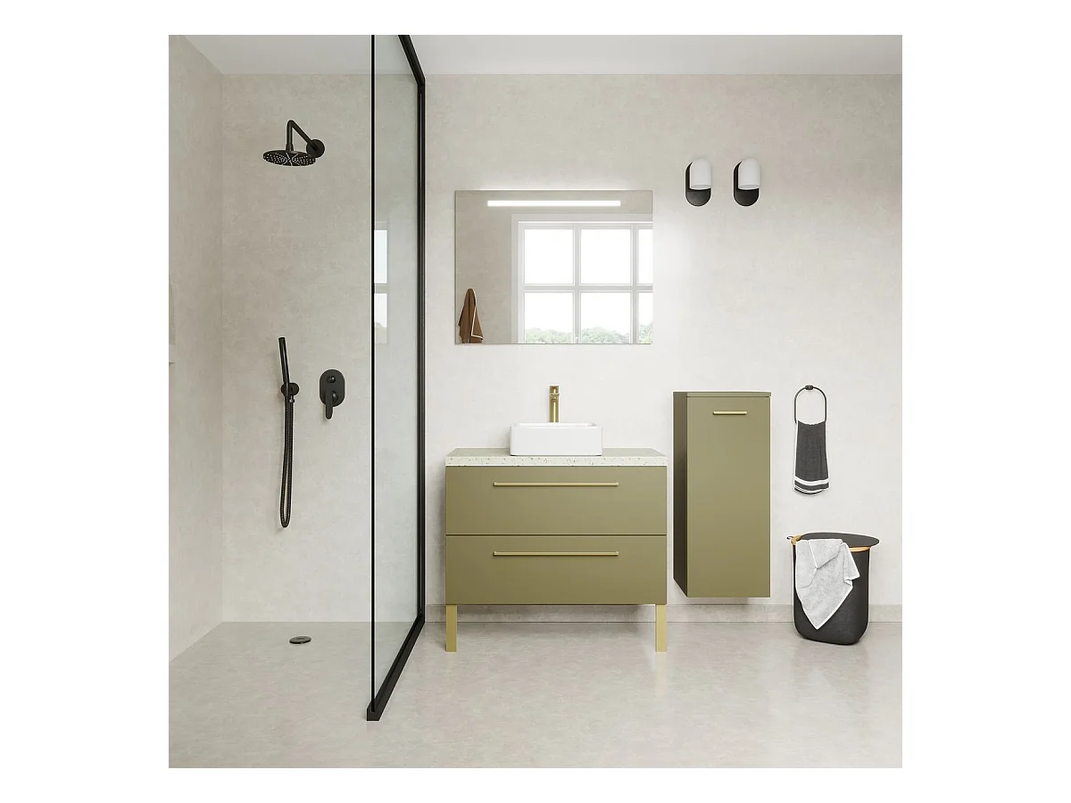 Meuble de salle de bain suspendu vasque à poser 90cm 1 tiroir Vert olive + miroir + colonne ouverture droite - Glasgow