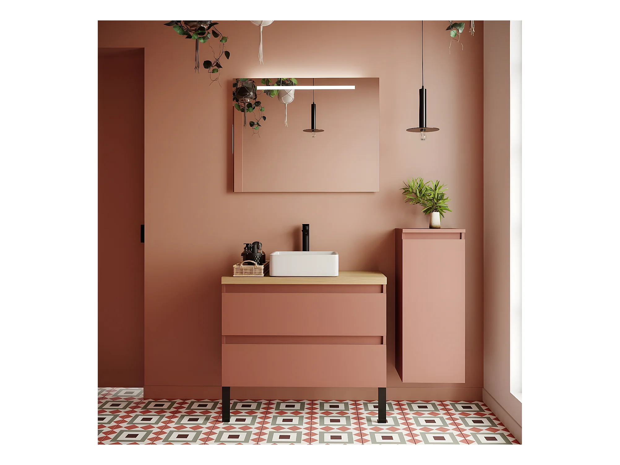 Meuble de salle de bain suspendu vasque à poser 90cm 2 tiroirs Abricot + miroir + colonne ouverture droite - Hudson